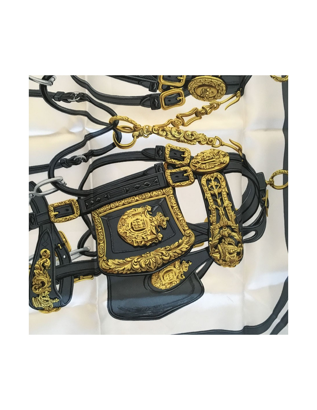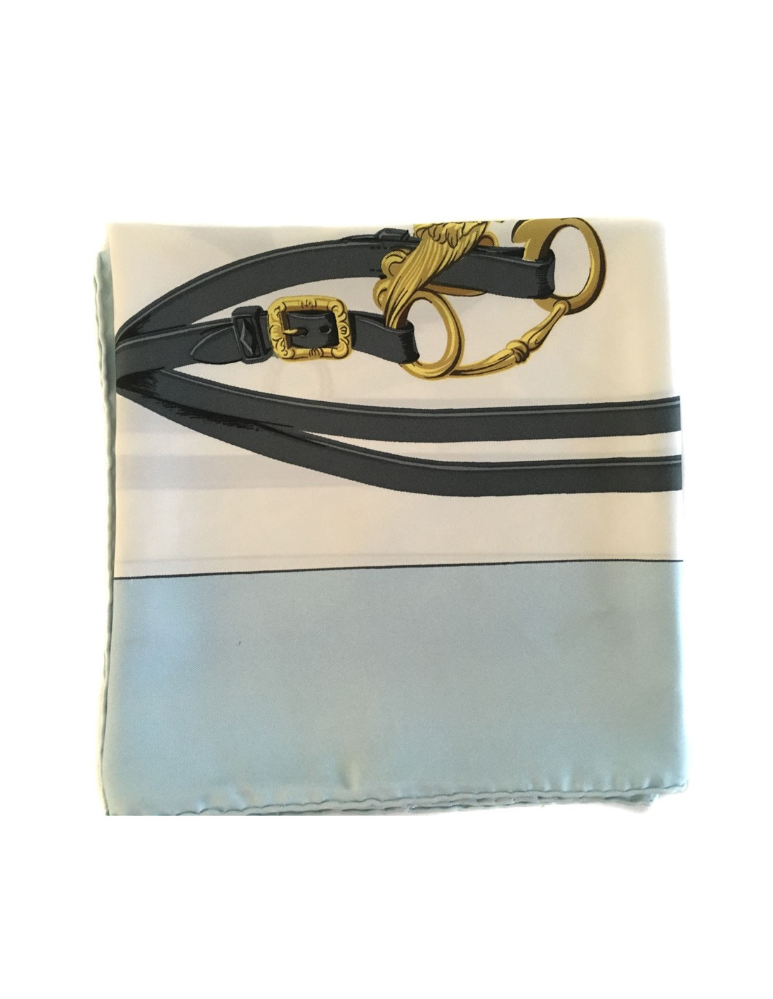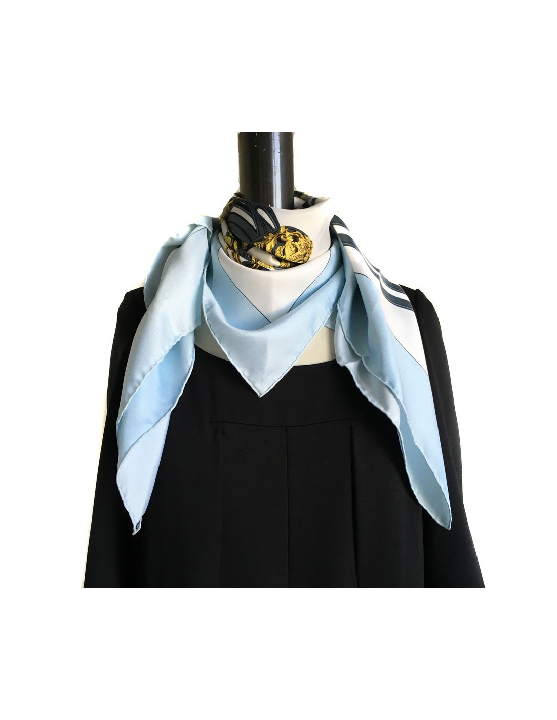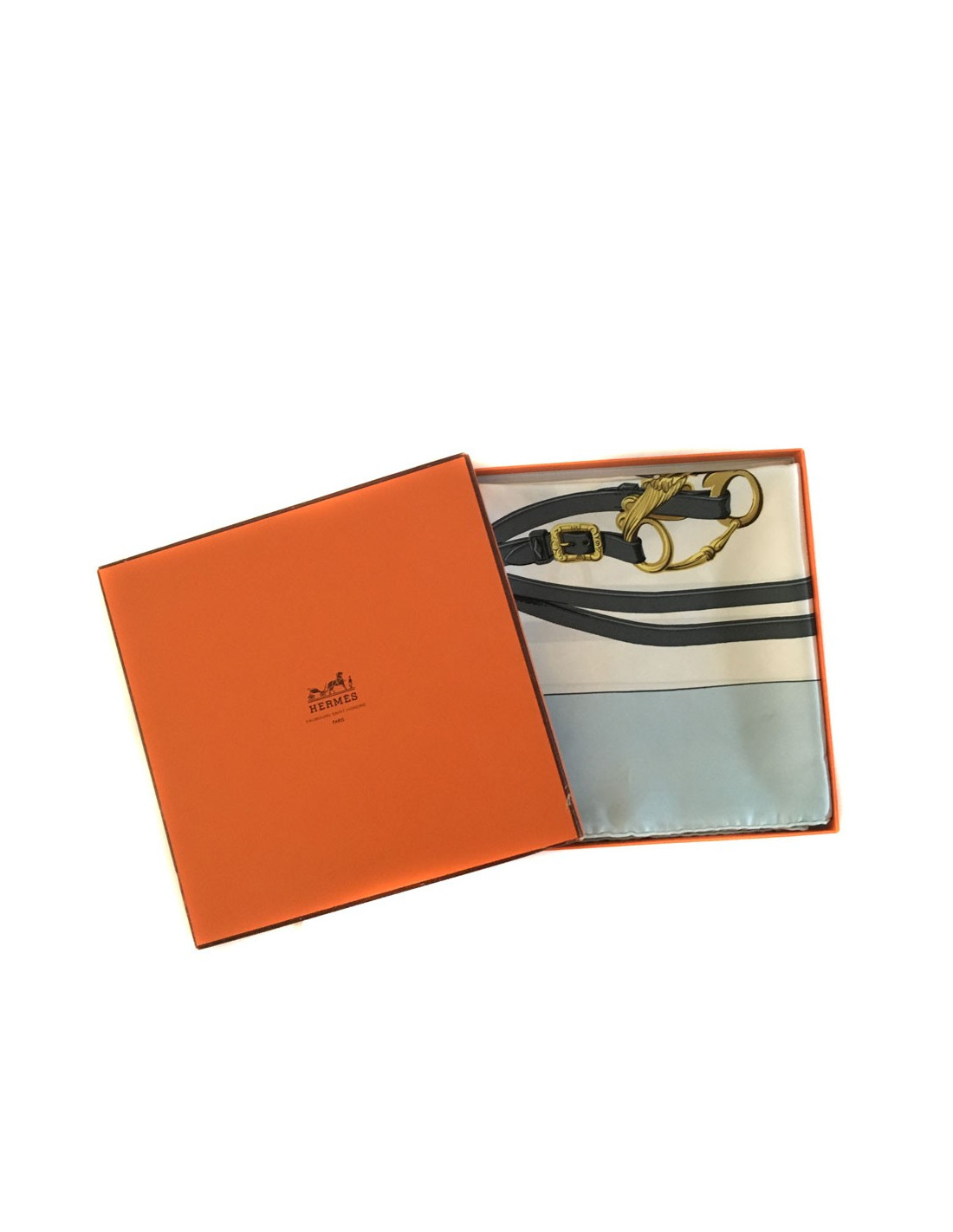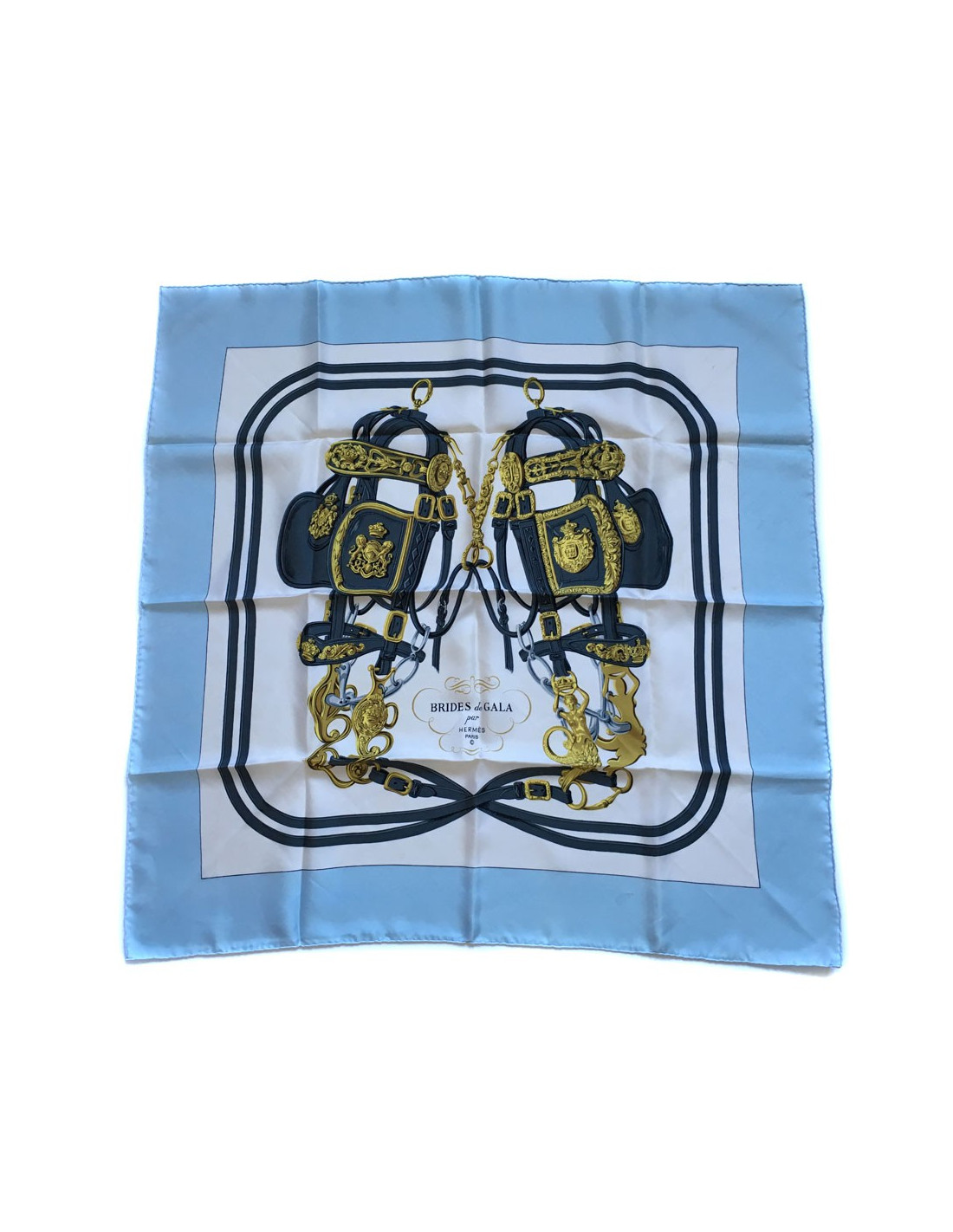 Carré HERMES "Brides de Gala" en soie bleu ciel et blanc