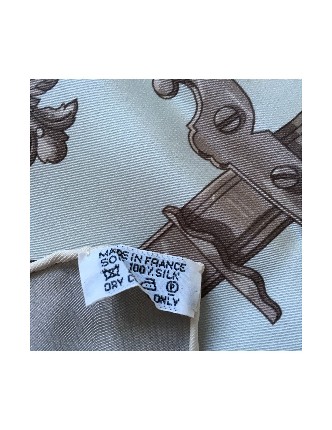 Carré HERMES "Ferronnerie" en soie étoupe, gris et orange. Le roulotté est en très bon état. En très bon état général. De petites tâches sont présentes sur le foulard (voir photos).