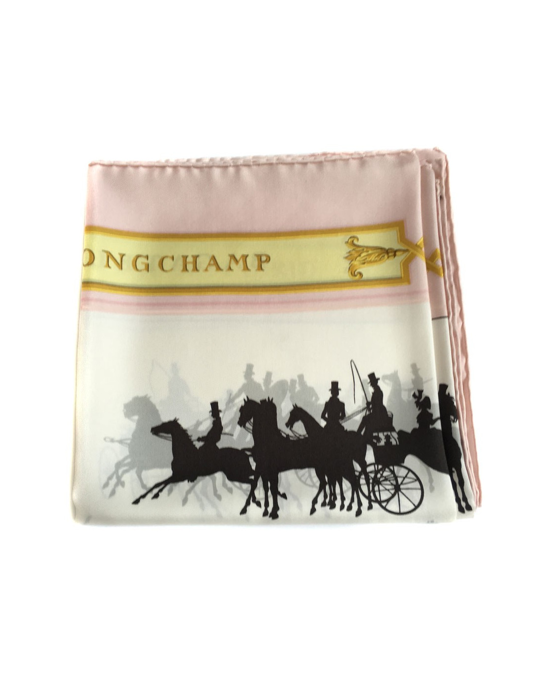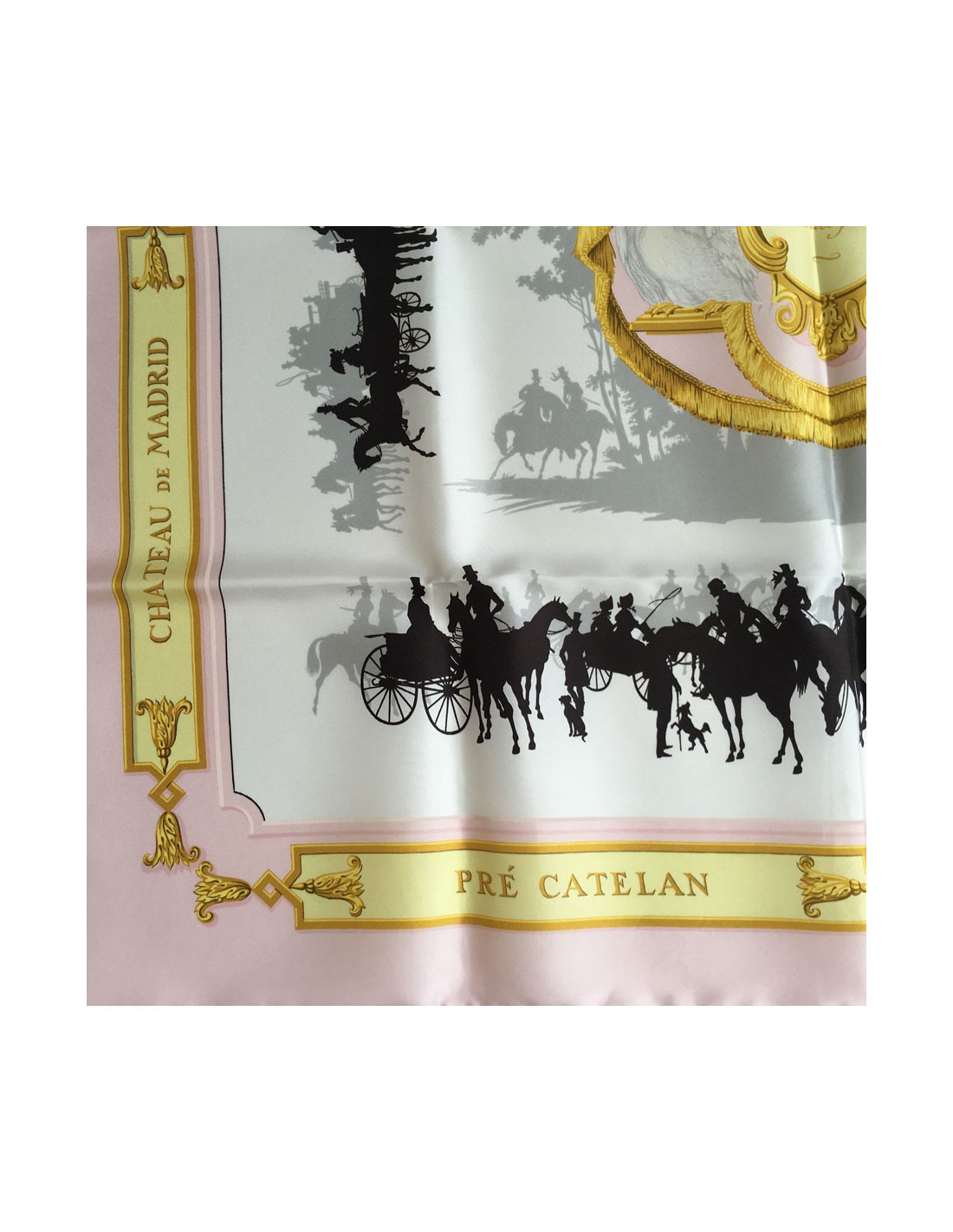 Superbe carré HERMES "Le Bois de Boulogne" en soie. Bordure rose pâle, fond blanc et noir. Le roulotté est impeccable. Etiquette de matière présente. Fabriqué en France.