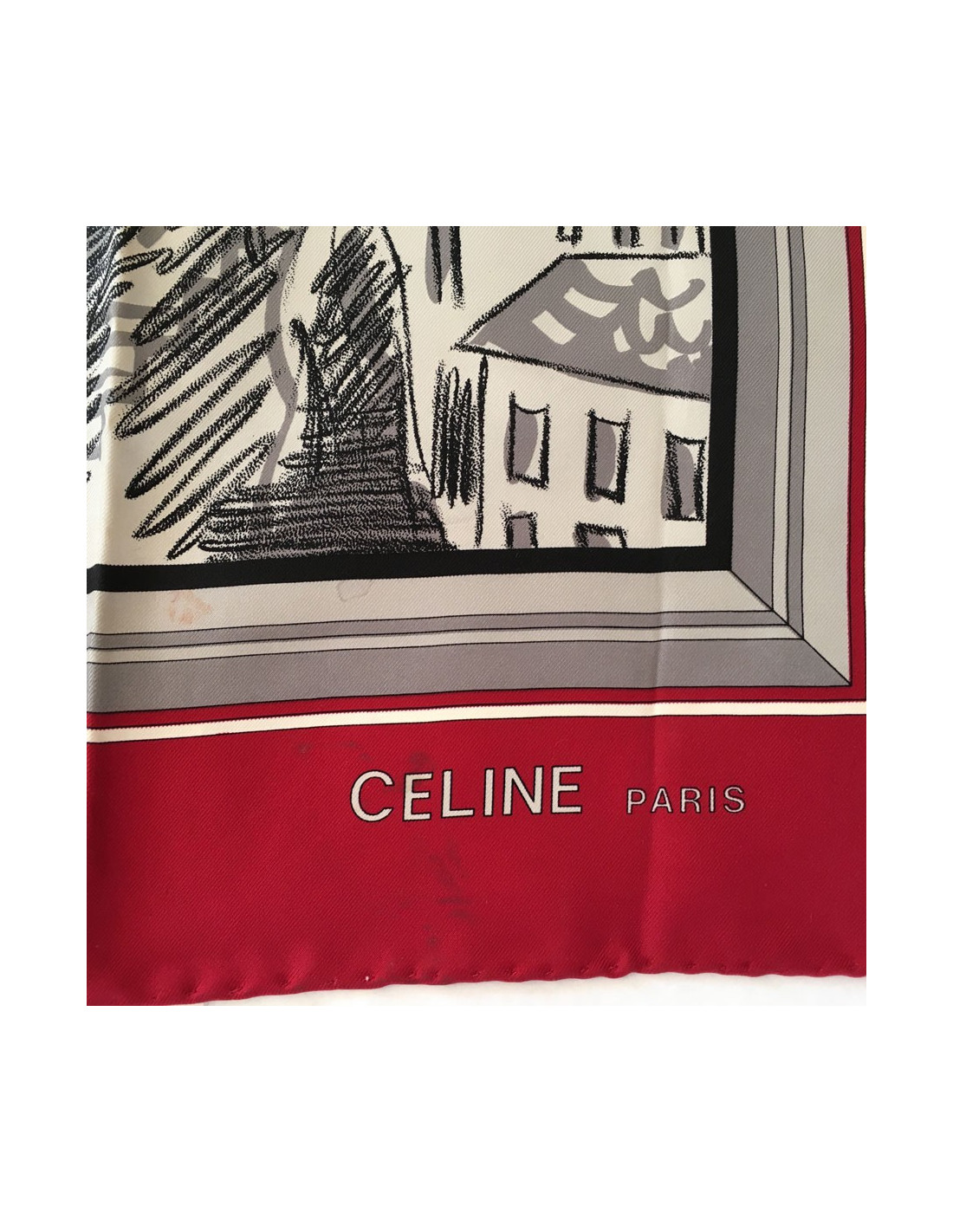 Carré de soie CELINE "Paris" dans les tons rouges, gris, noir. Foulard vintage.