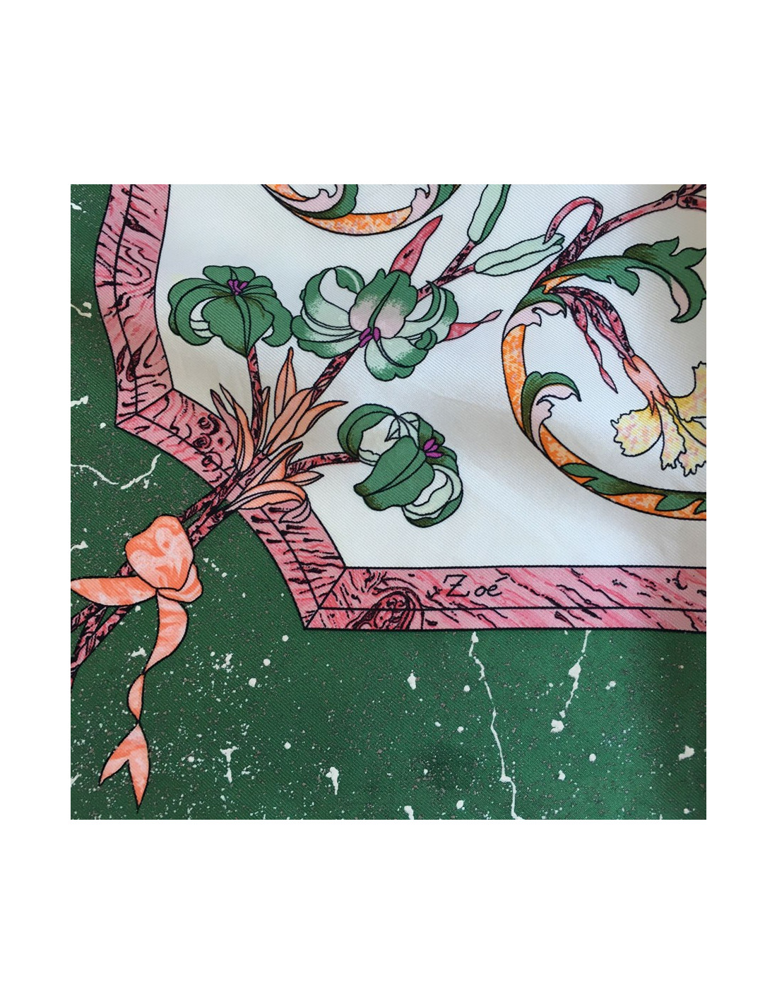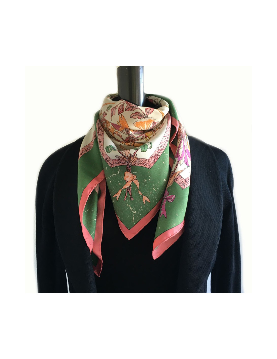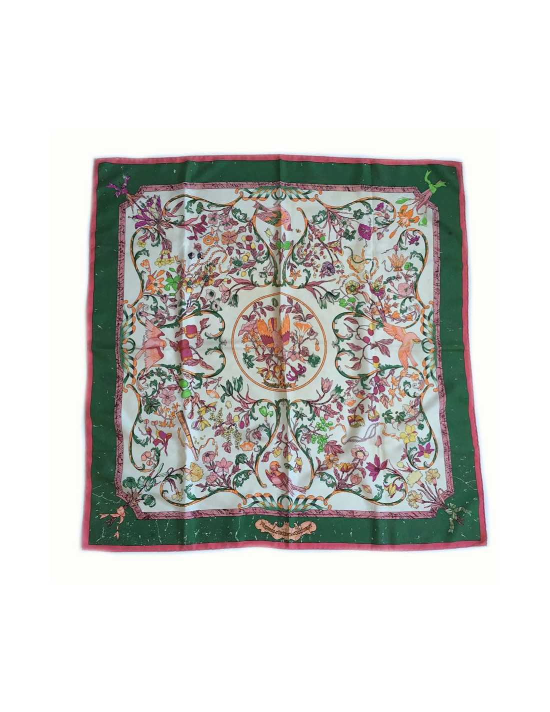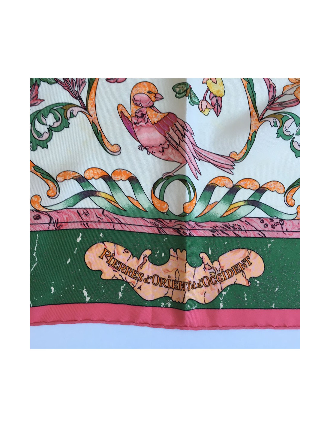 Carré HERMES "Pierres d'Orient et d'Occident" en soie, effet tacheté argent et blanc sur le bord vert. Bordure rose, fond vert, écru et rose. Le roulotté est impeccable. Légère tâches sur le carré.