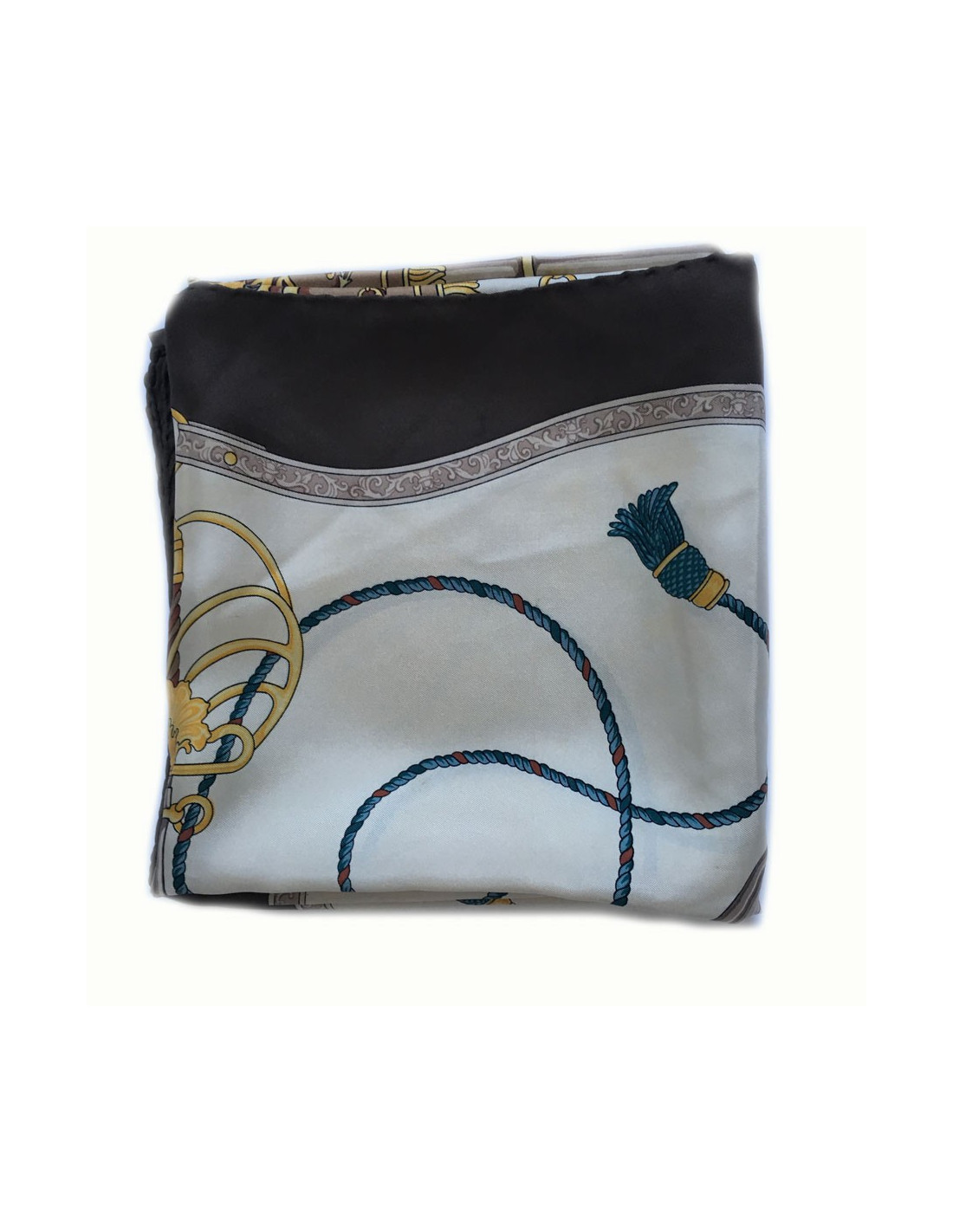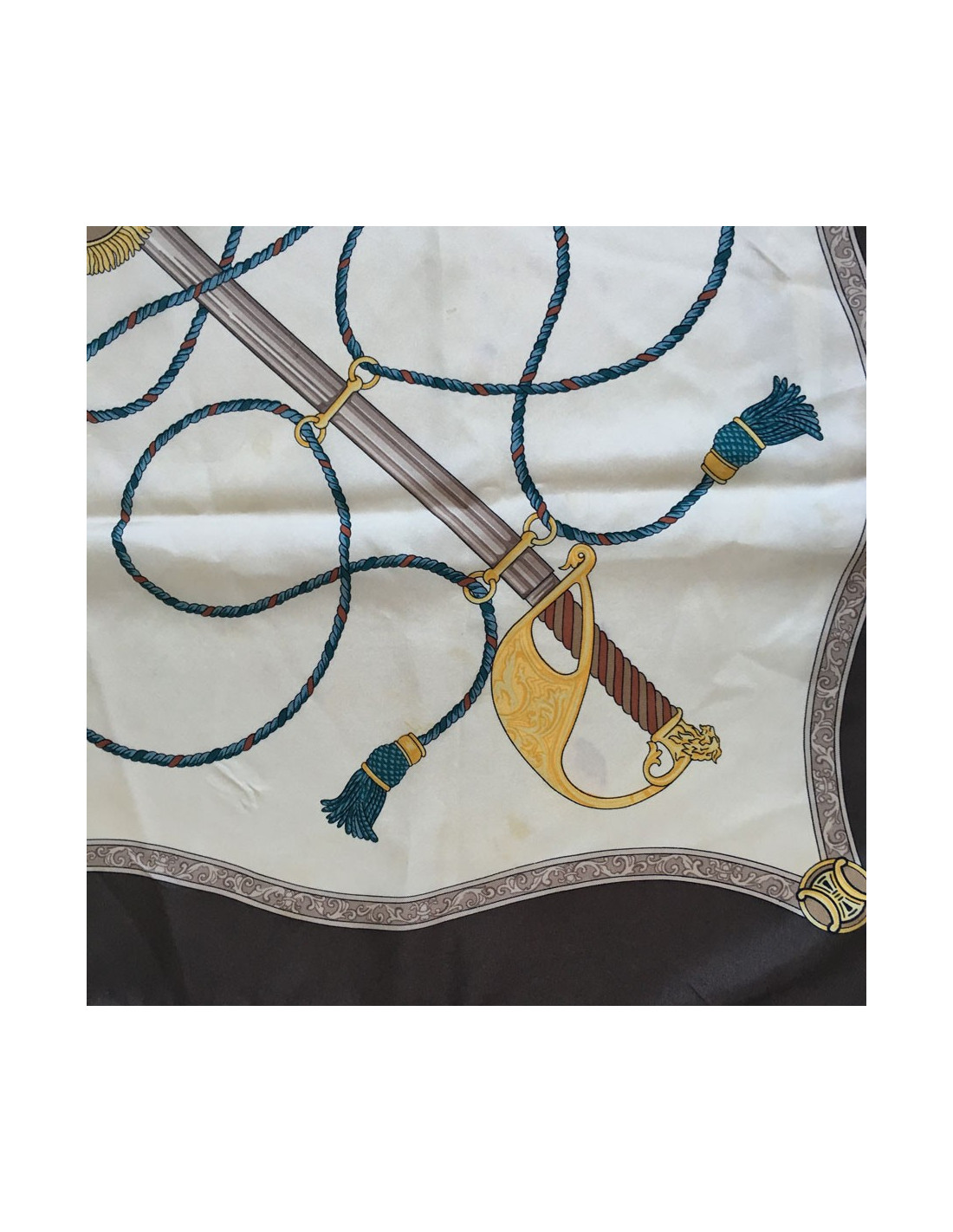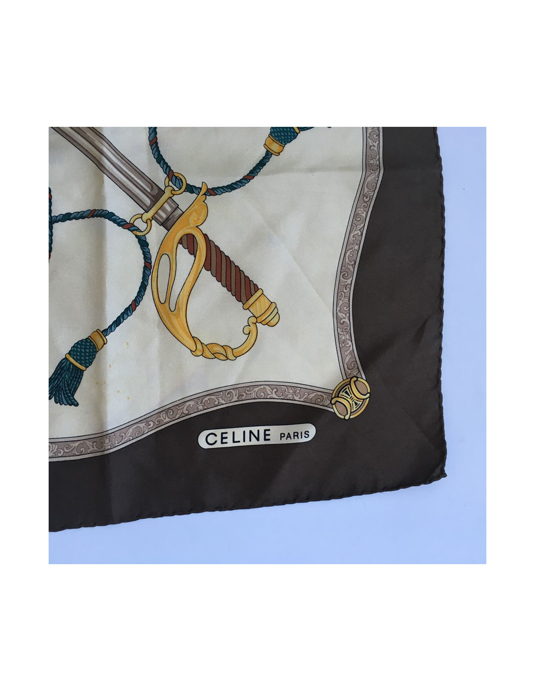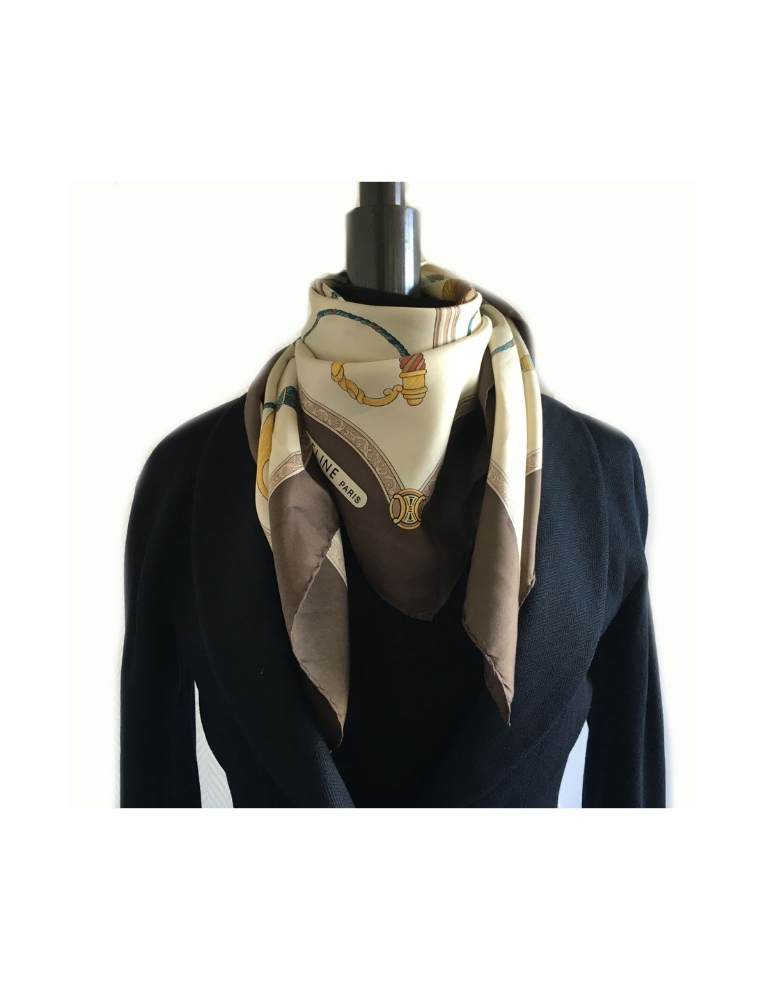 Foulard CELINE "Un nom, un style" en soie. Bordure chocolat, fond écru à motifs multicolores.