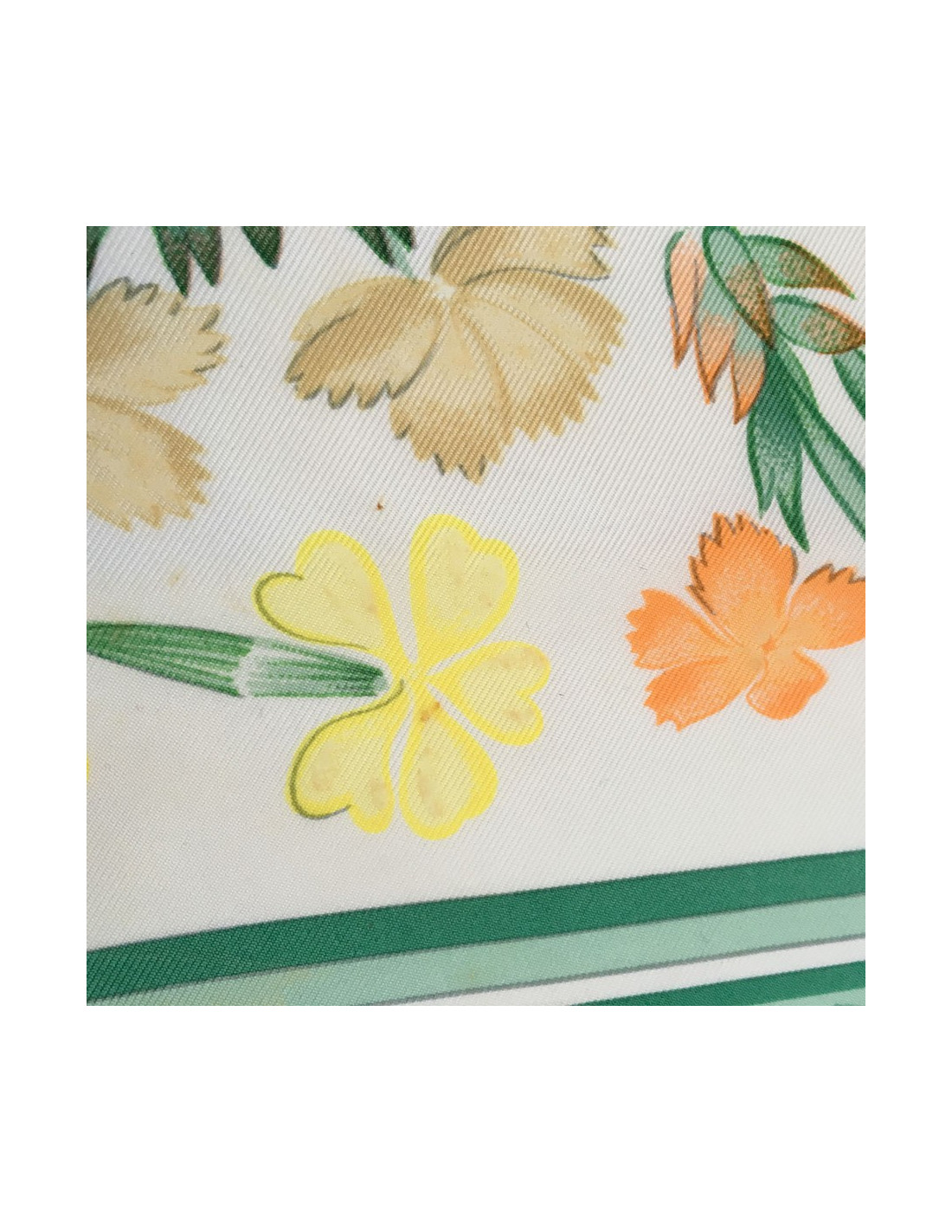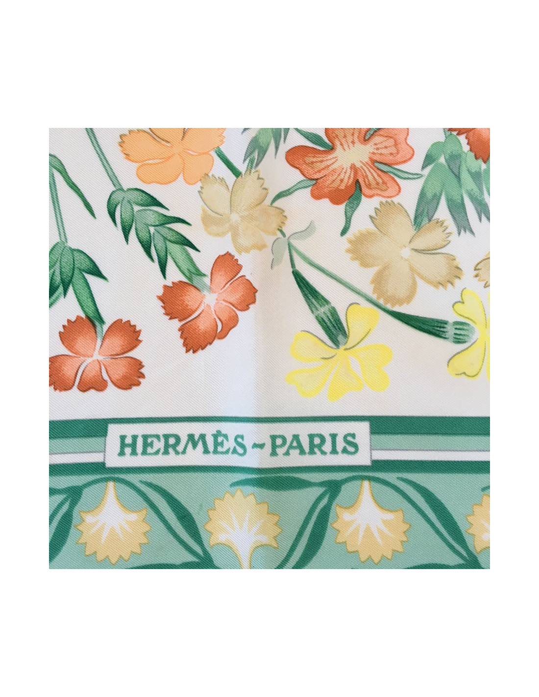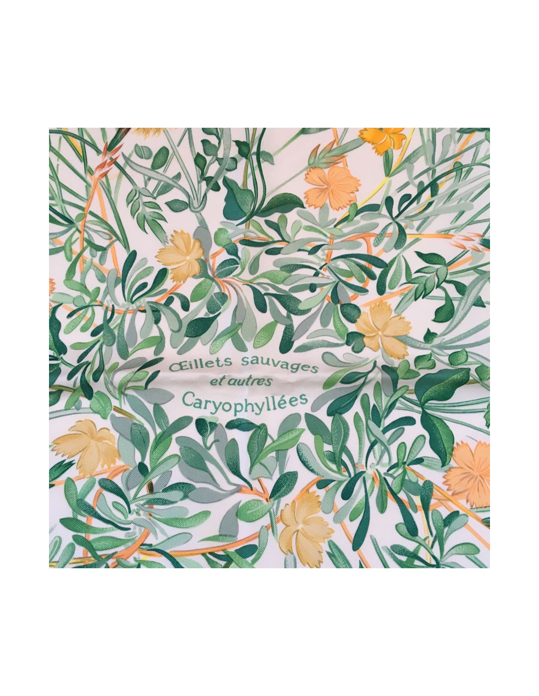 Carré HERMES "Oeillets sauvage et autres Caryophyllées" en soie. Motifs fleurs dans les tons verts jaune et orange sur fond blanc. Absence d'étiquette matière.