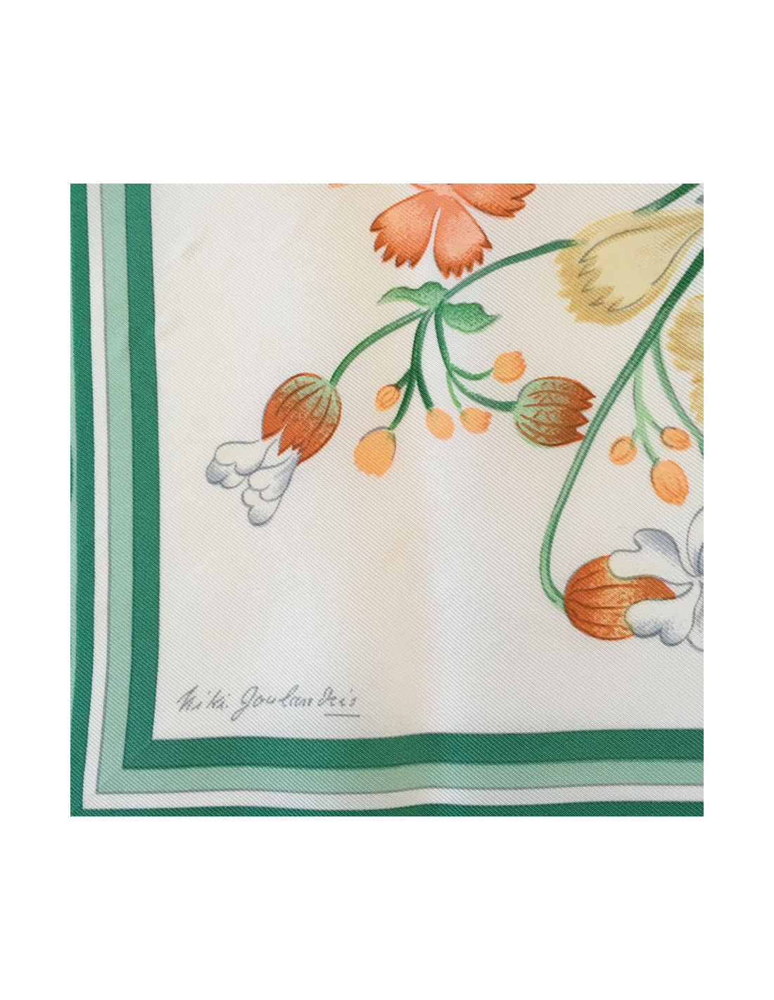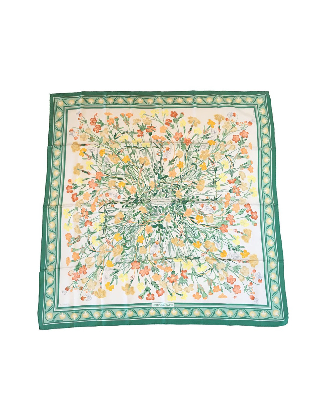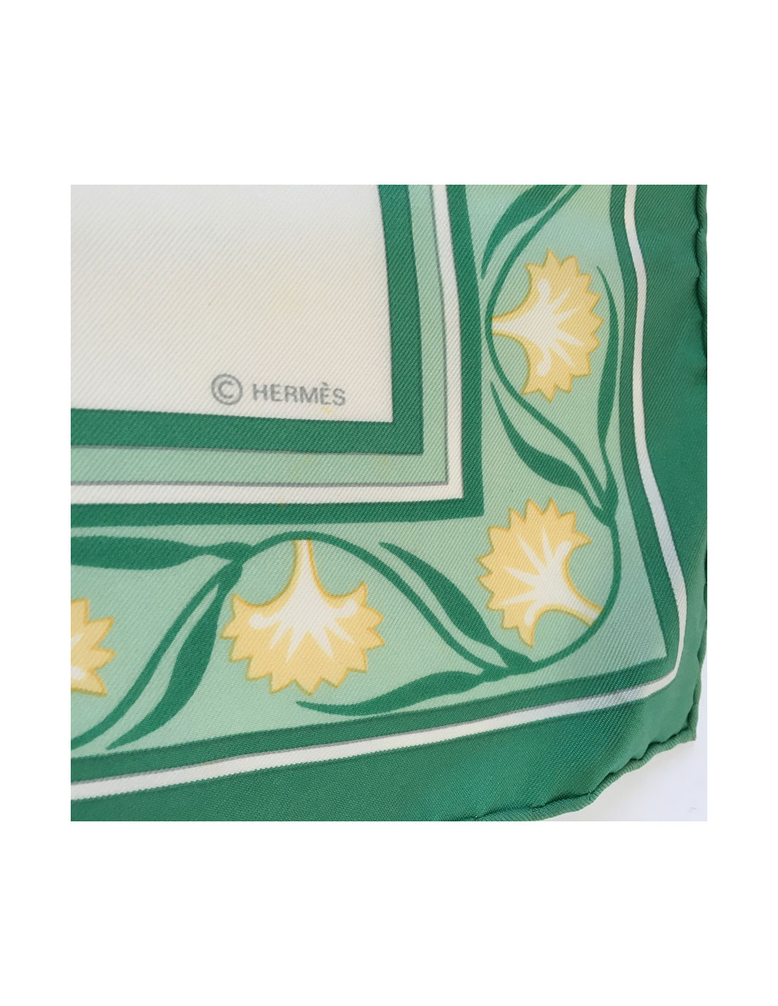 Carré HERMES "Oeillets sauvage et autres Caryophyllées" en soie. Motifs fleurs dans les tons verts jaune et orange sur fond blanc. Absence d'étiquette matière.