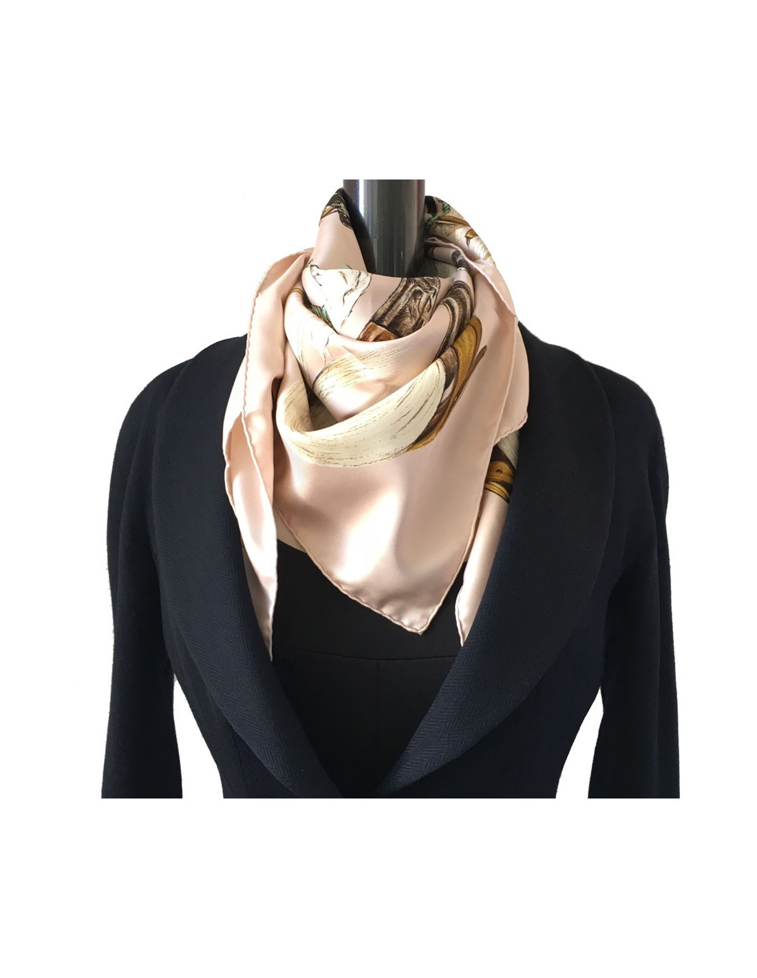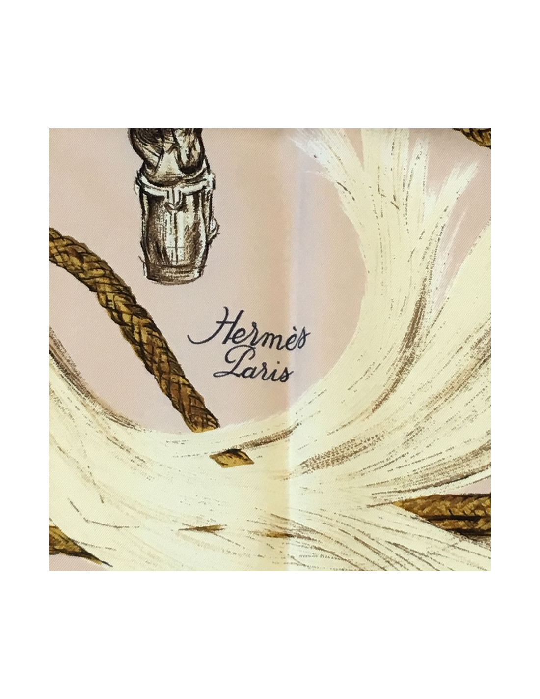 Carré HERMES "A propos de Bottes" en soie rose pâle
