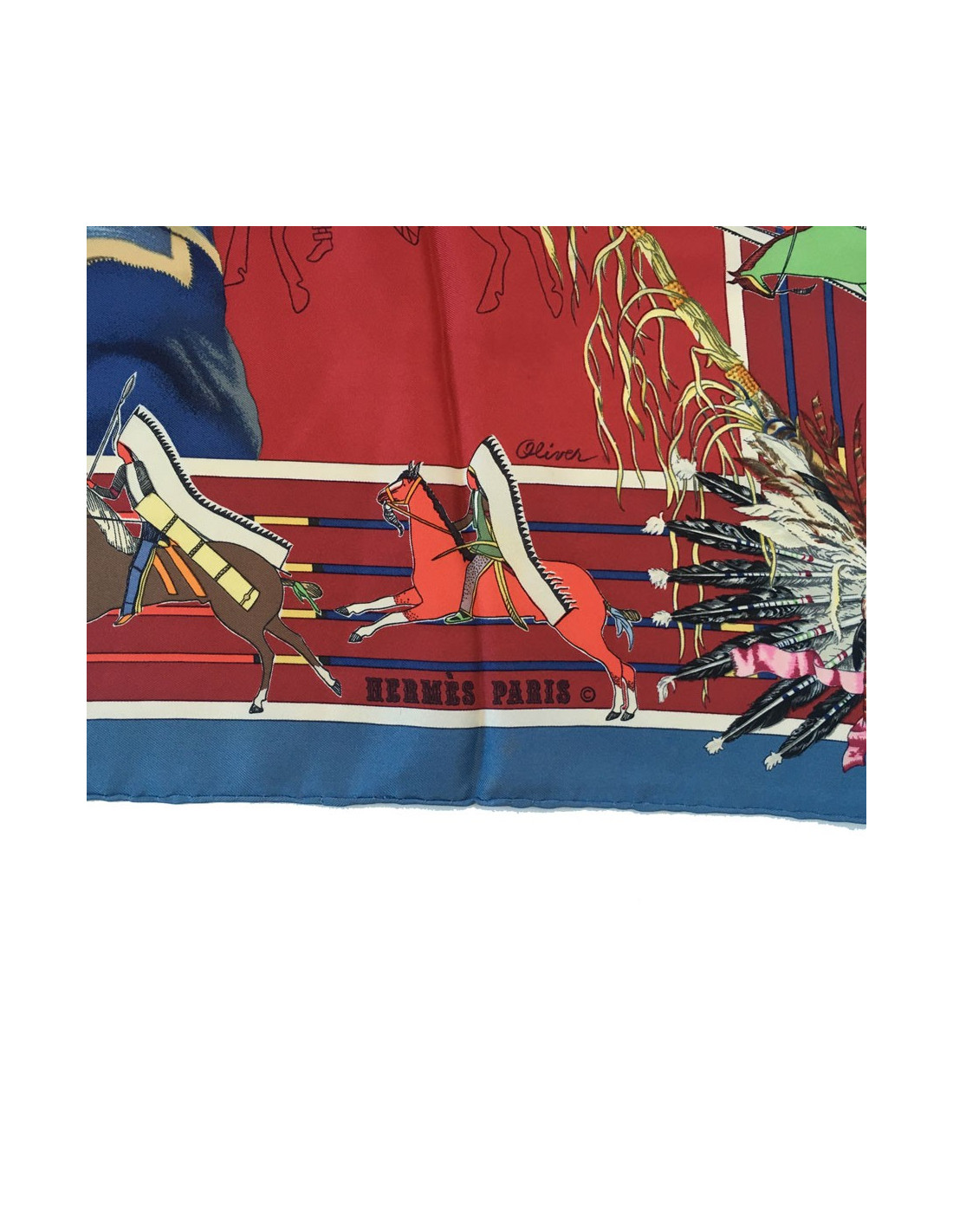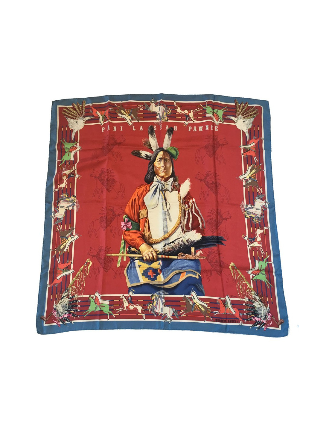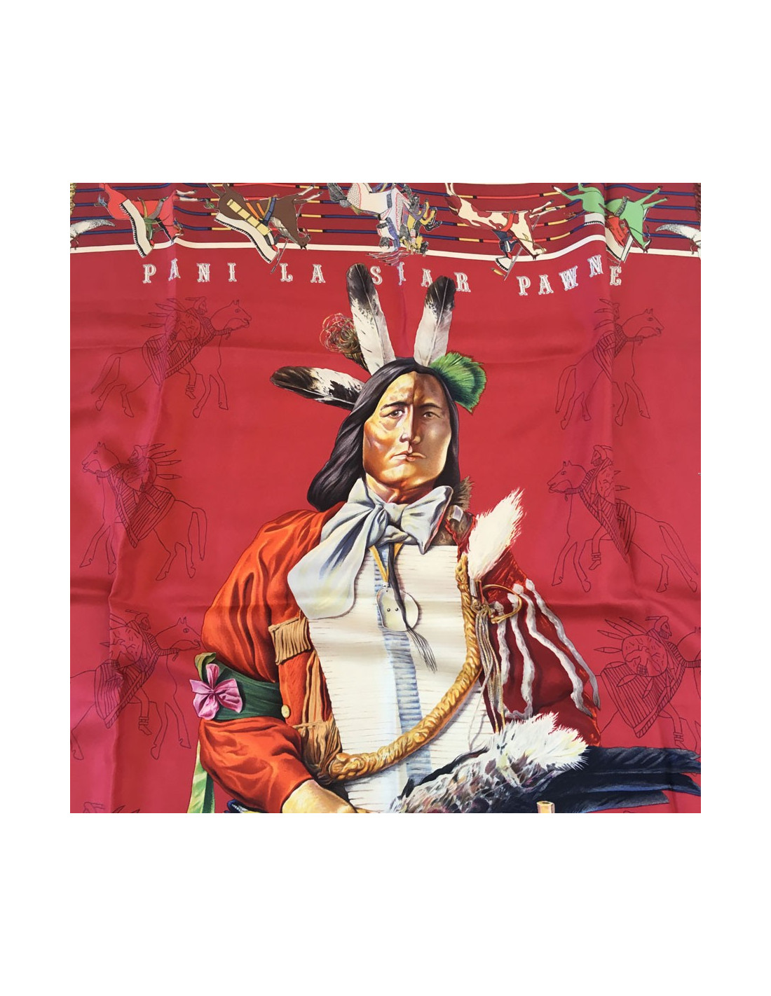 Très beau carré HERMES "Pani La Shar Pawnee" en soie lie de vin sur fond multicolore. Motif: un indien.
