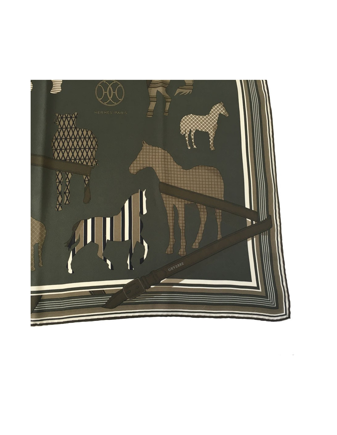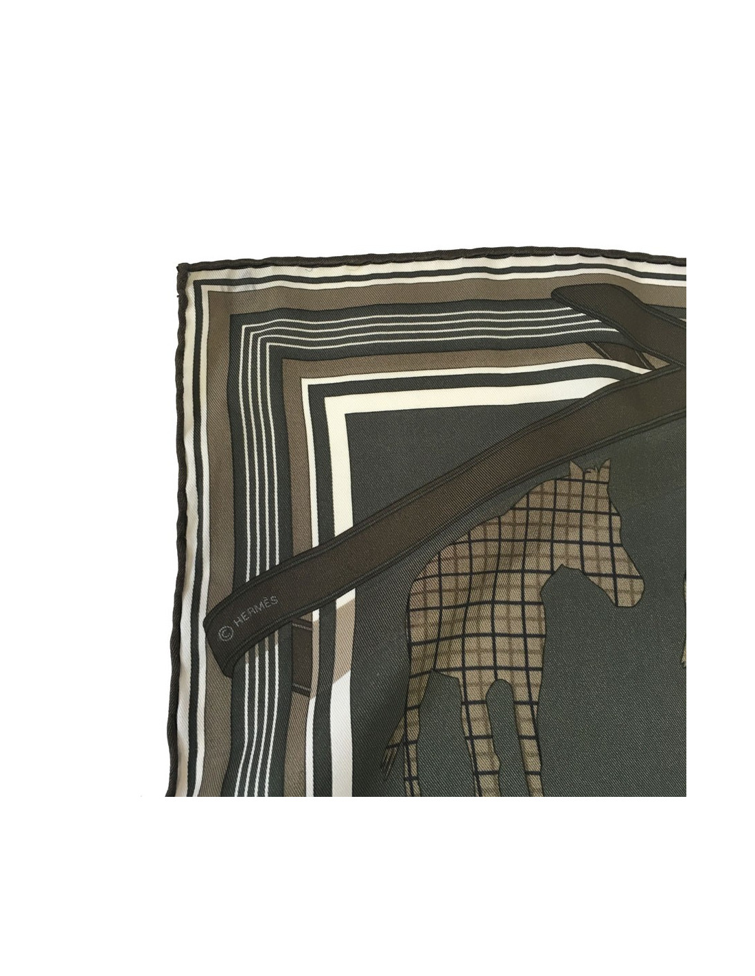 Carré HERMES "GRV2392" en soie vert, kaki et ivoire. Cet accessoire provient des soldes. Nettoyé chez un teinturier.