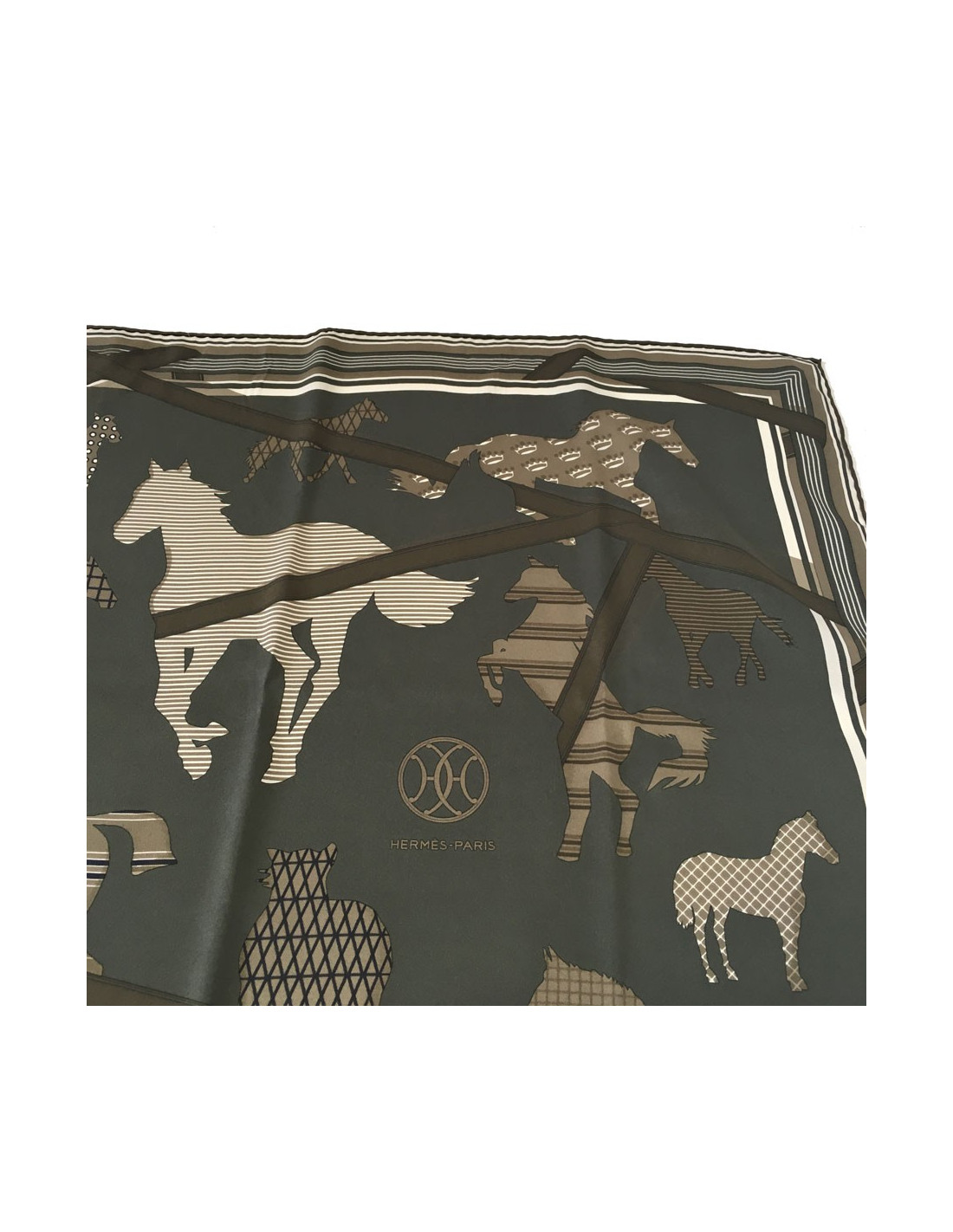 Carré HERMES "GRV2392" en soie vert, kaki et blanc