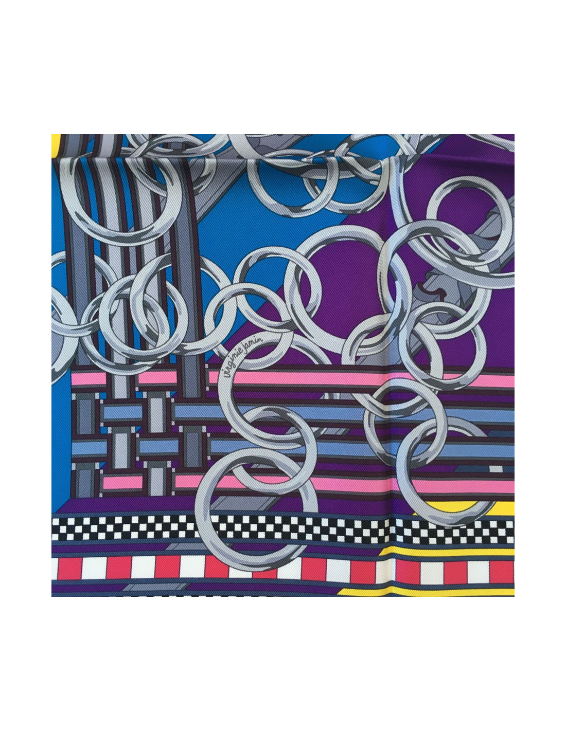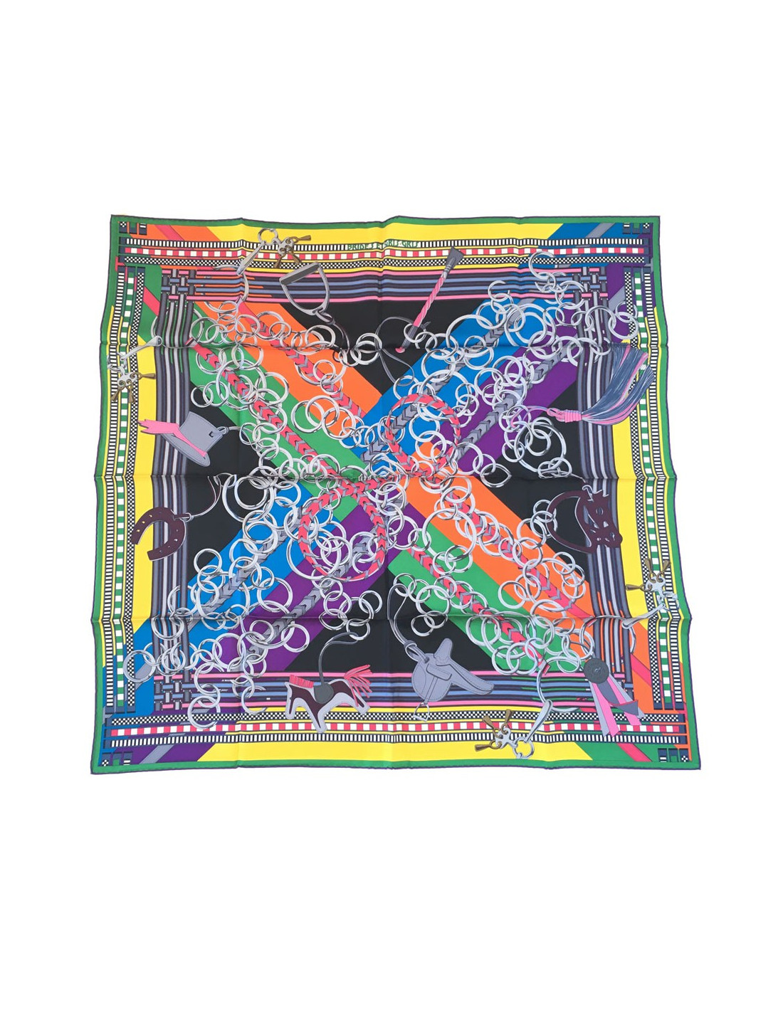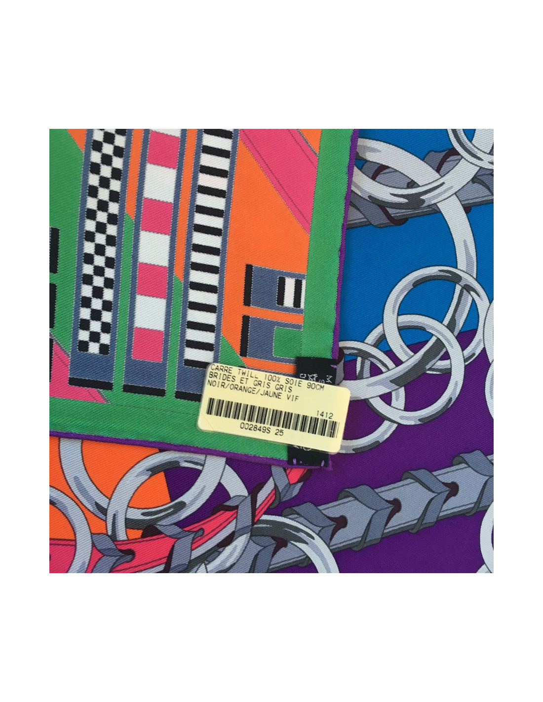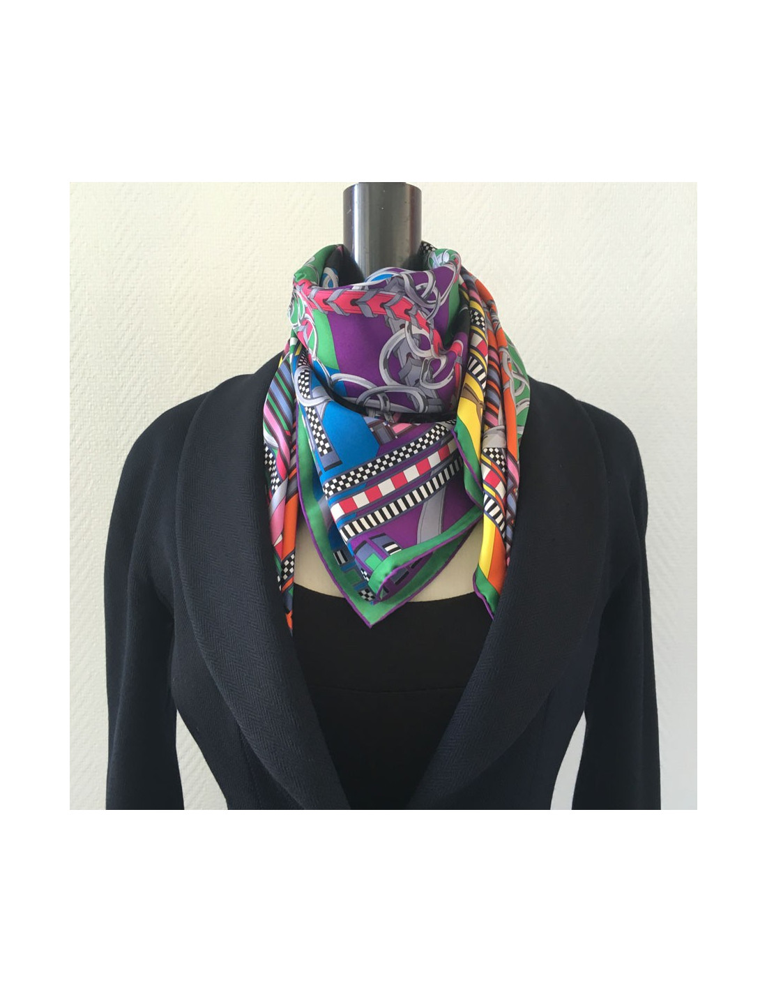 Carré HERMES ""Brides et gris-gris" en soie noir, orange et jaune vif