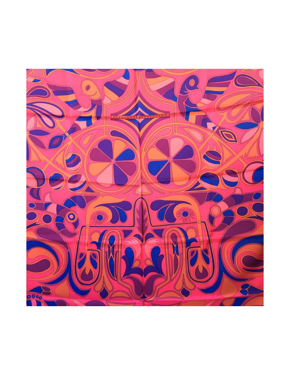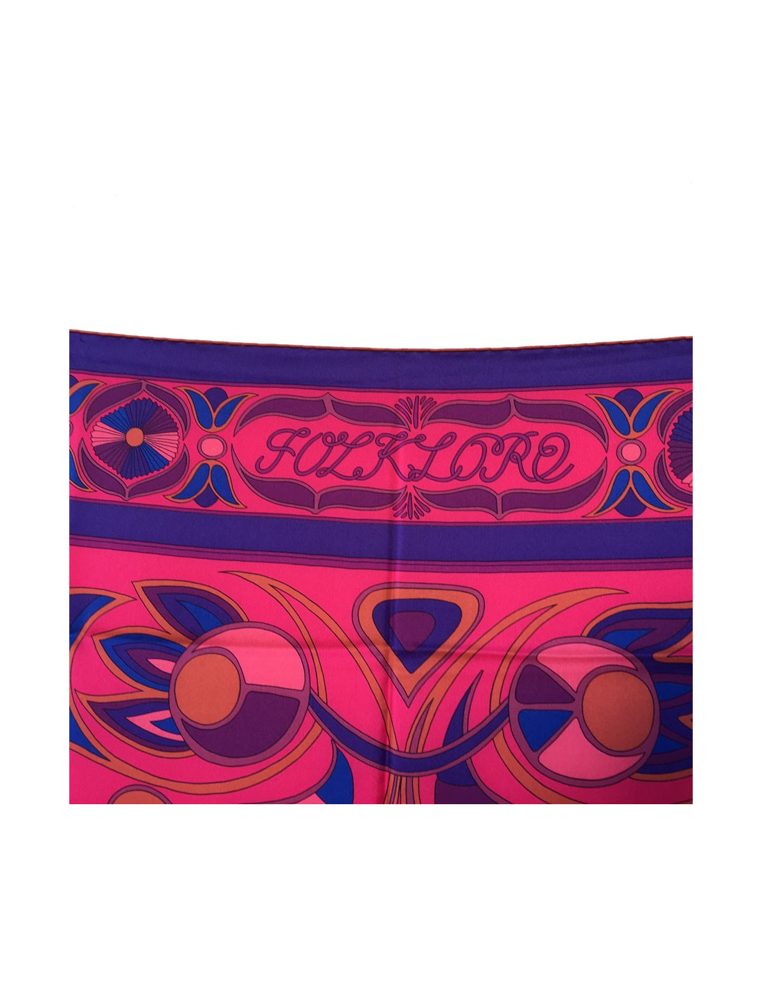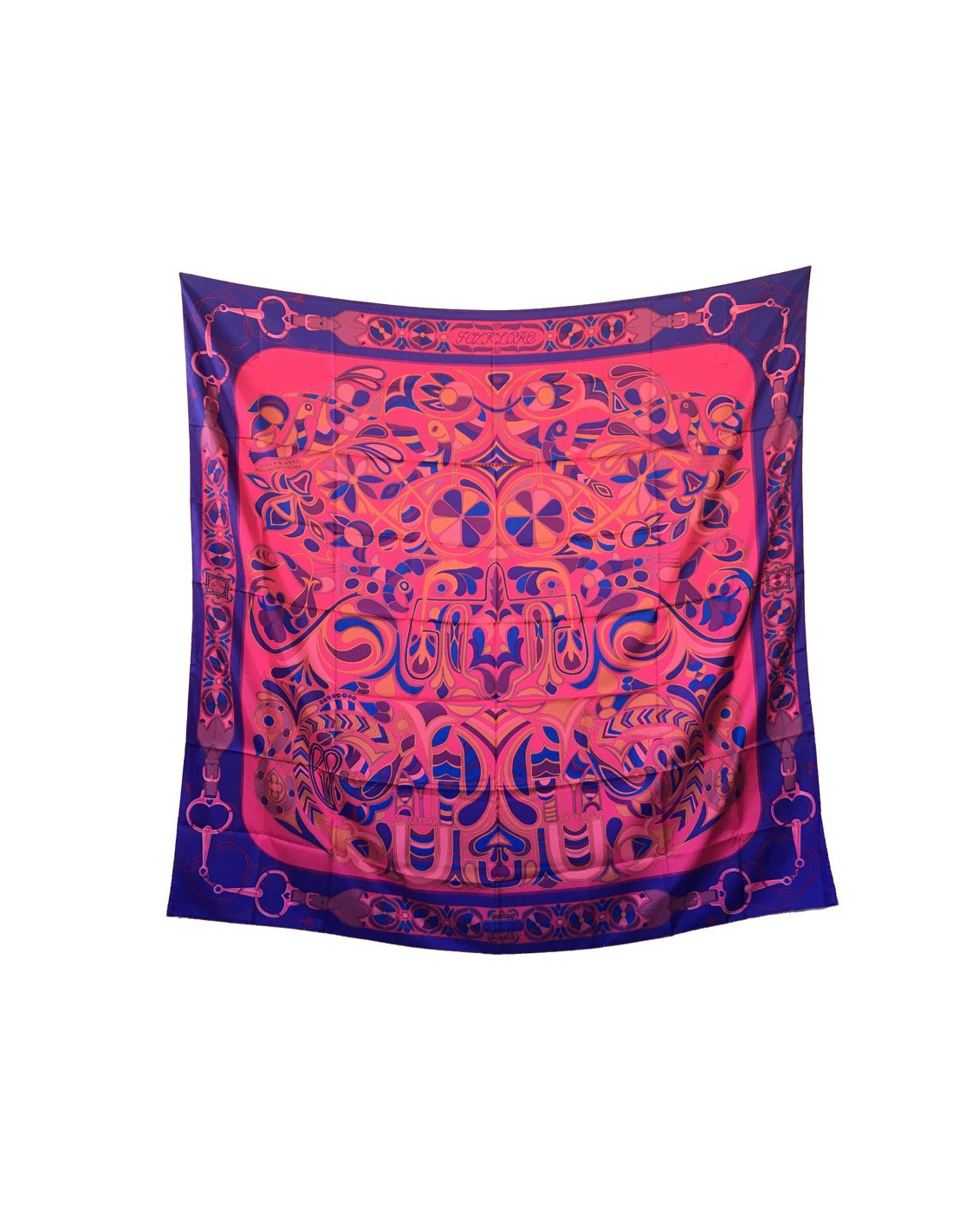 Magnifique châle HERMES "Folklore" en twill de soie rose, mauve, marron.
