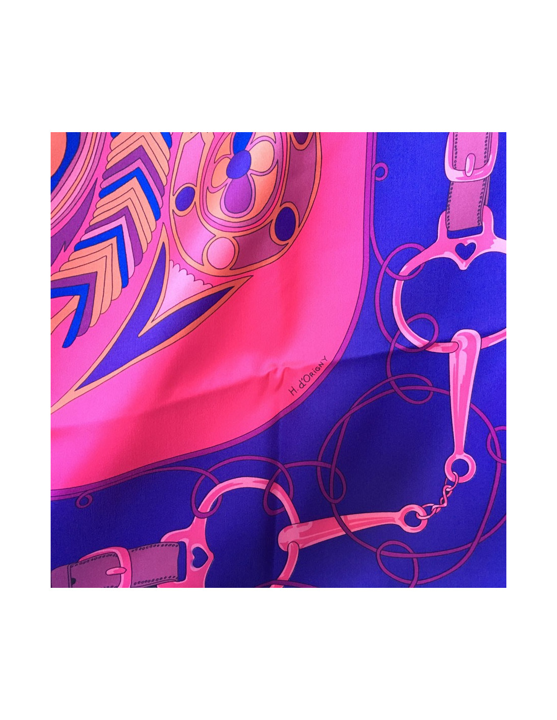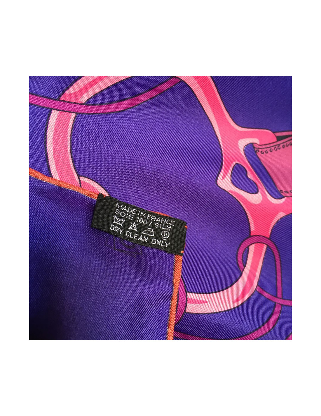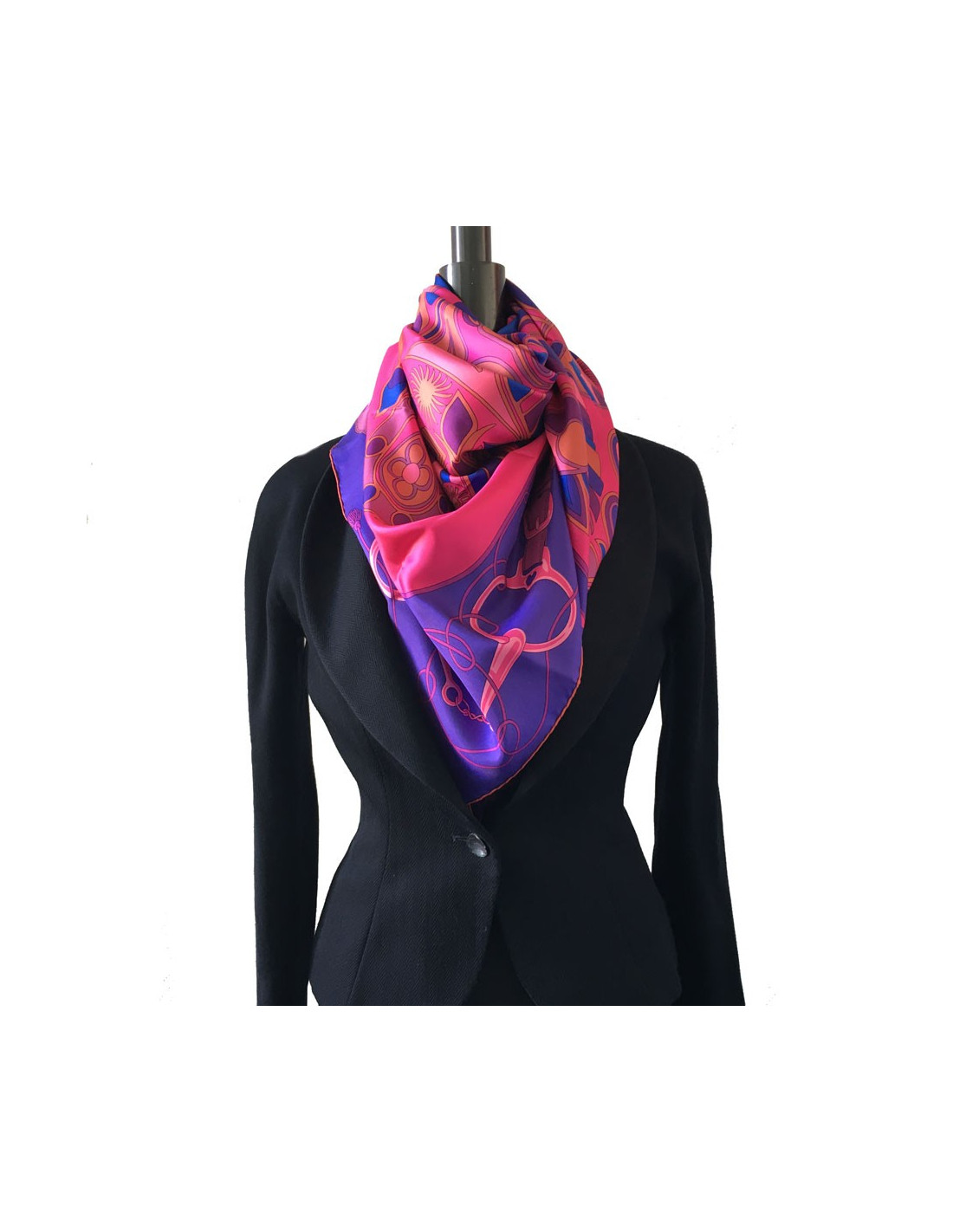 Magnifique châle HERMES "Folklore" en twill de soie rose, mauve, marron.