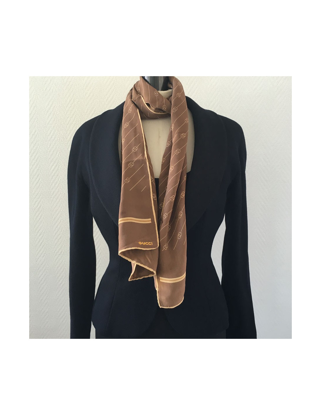 Foulard GUCCI en soie marron, bordure camel. Motifs: Initiales de la marque.