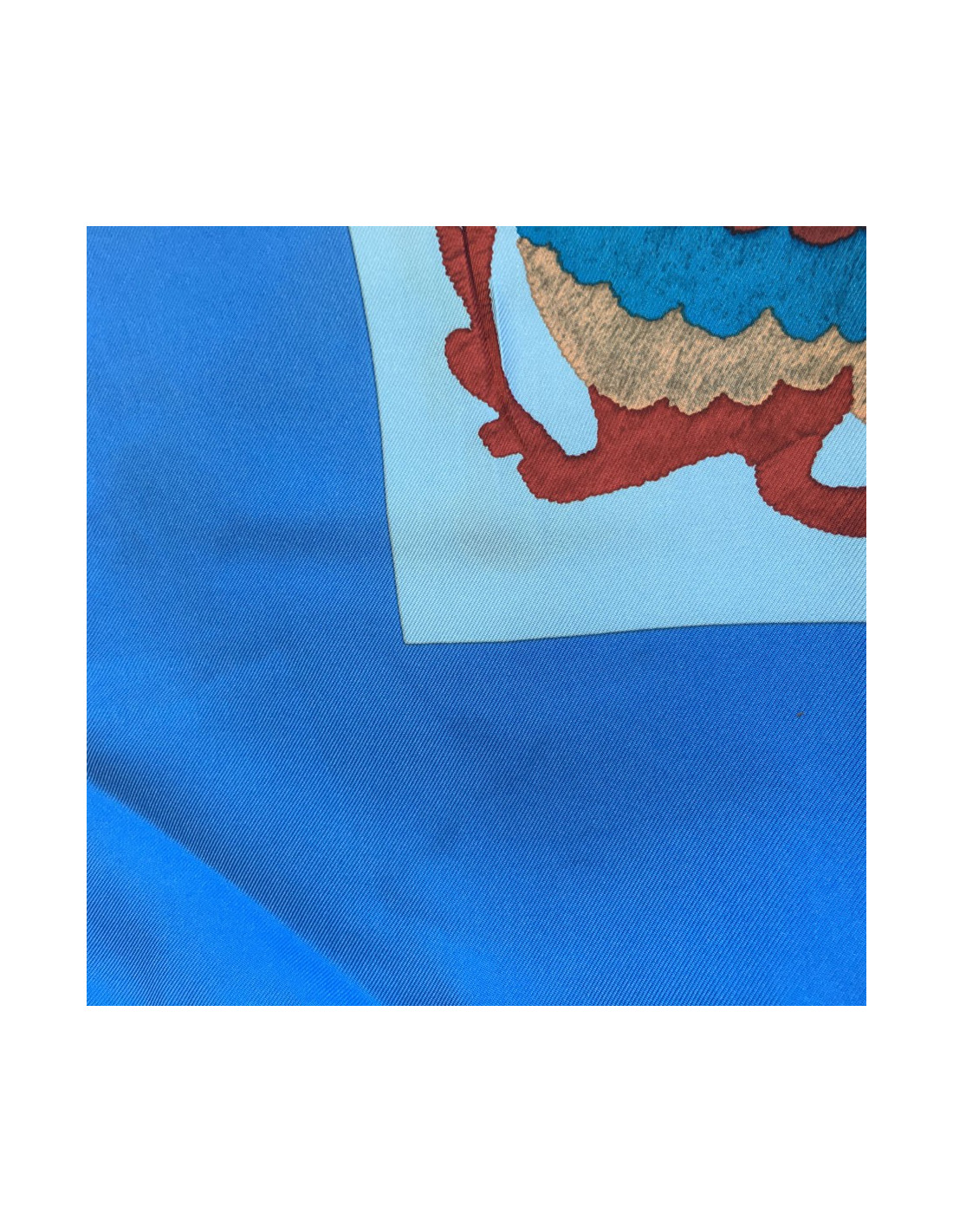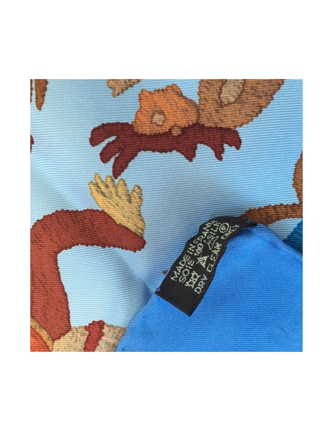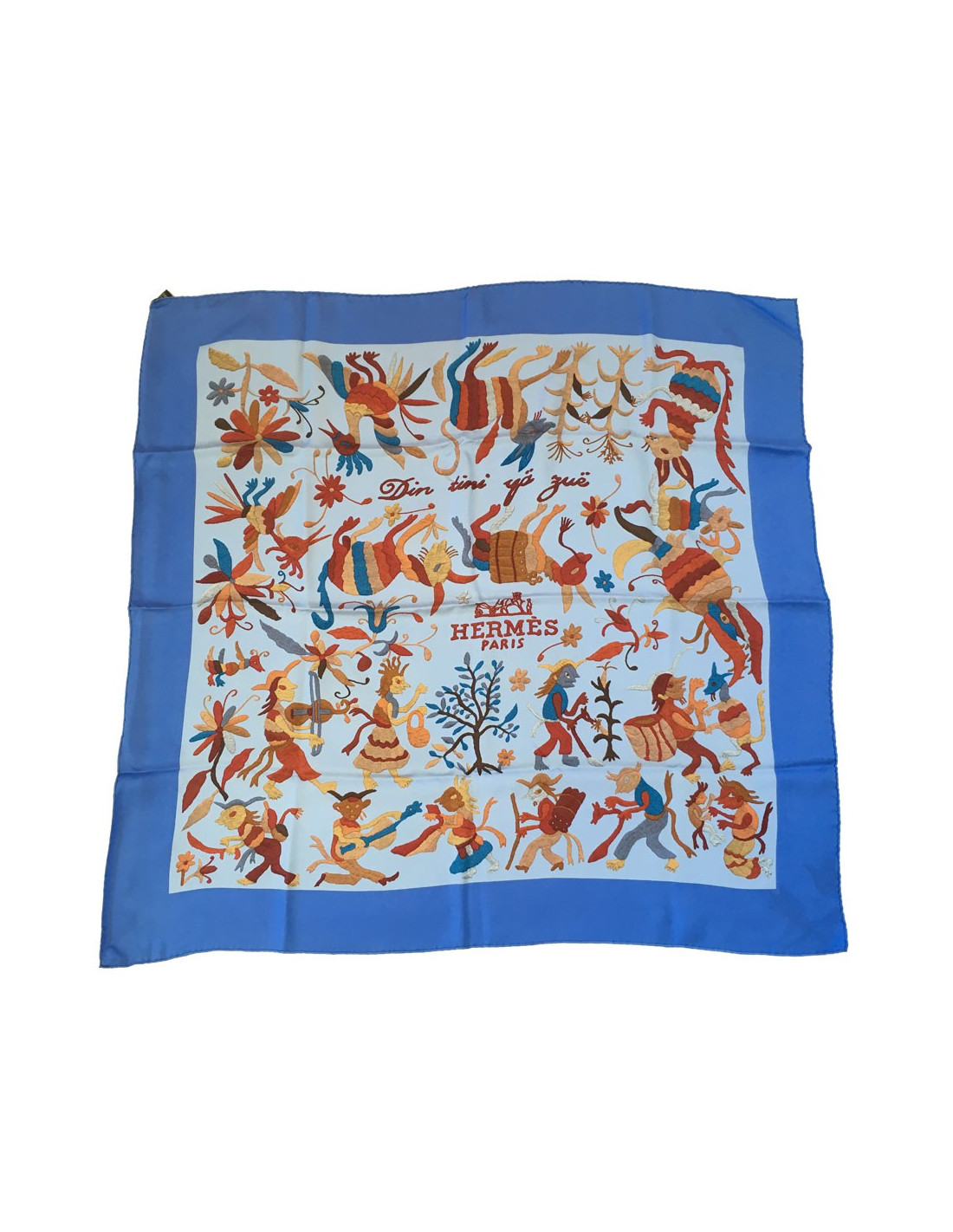 Quelques détails sur ce carré HERMES Din Tini Ya Zue en soie bleu