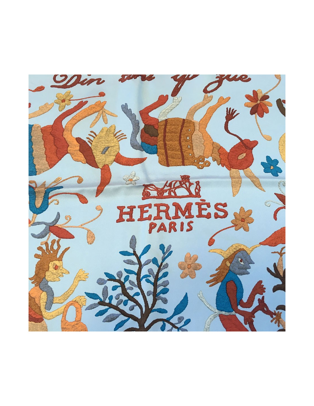 Carré HERMES "Din Tini Ya Zue" en soie bleue, fond multicolore.