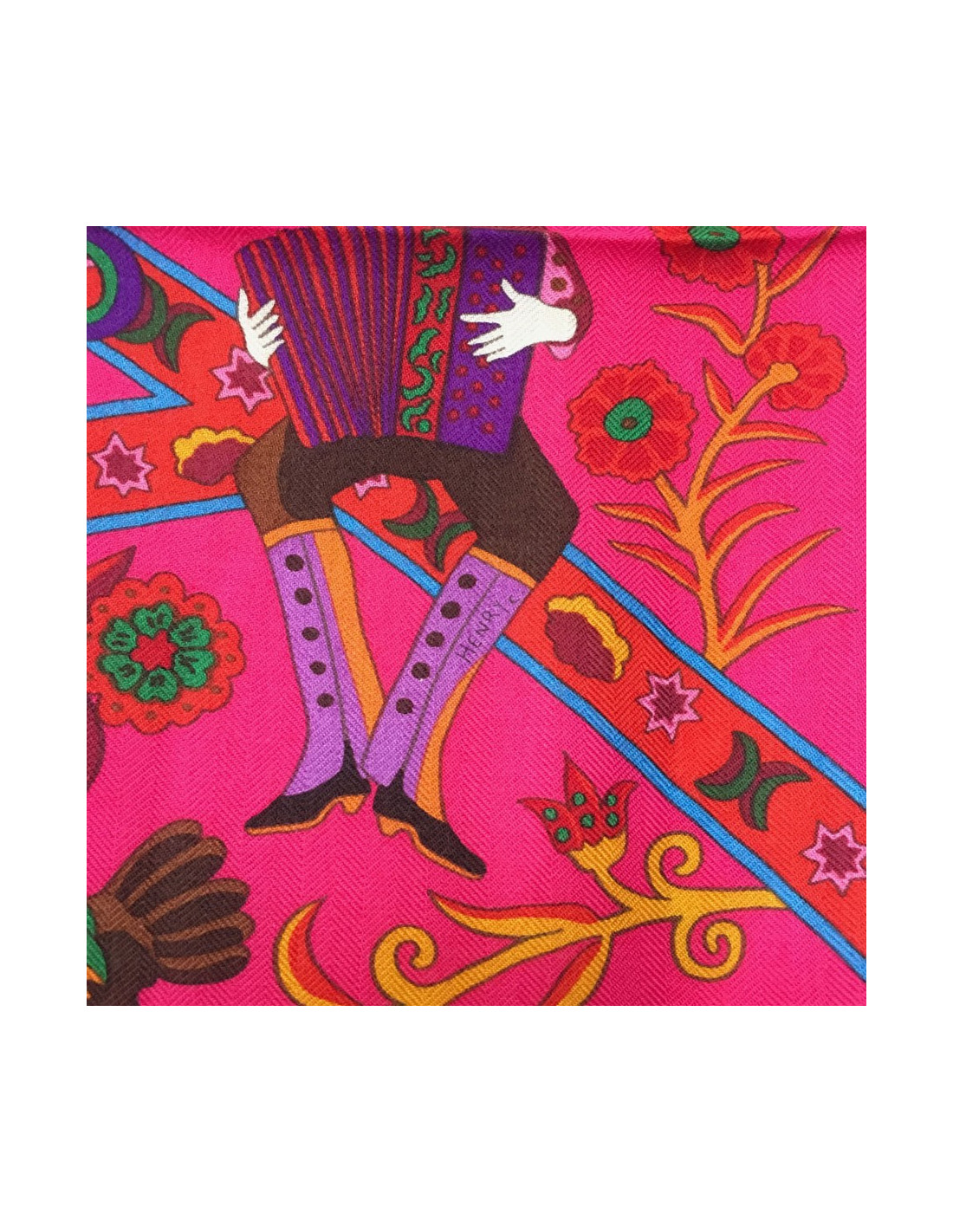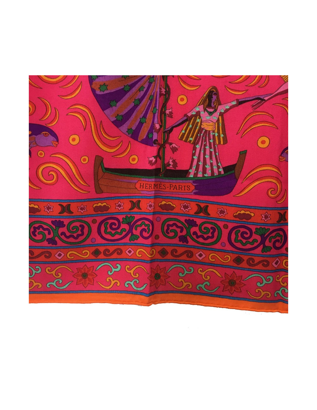 Châle Hermès "Peuple du vent" en cachemire et soie orange, rose indien, et vert.