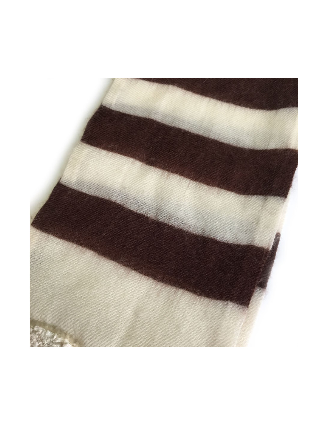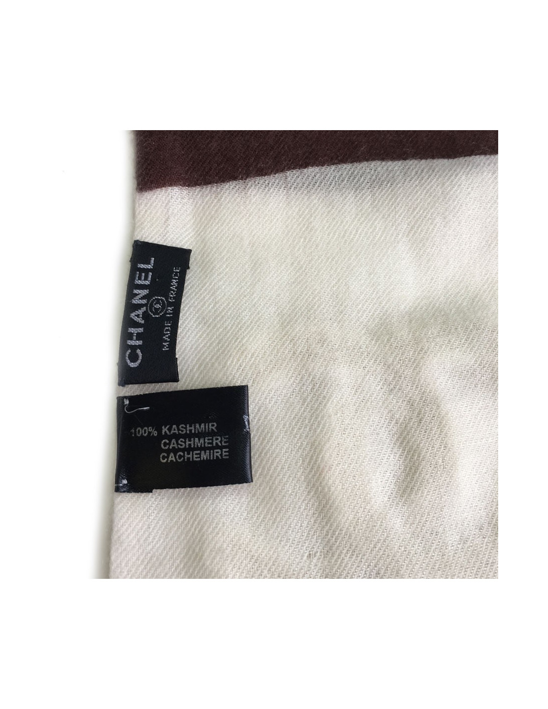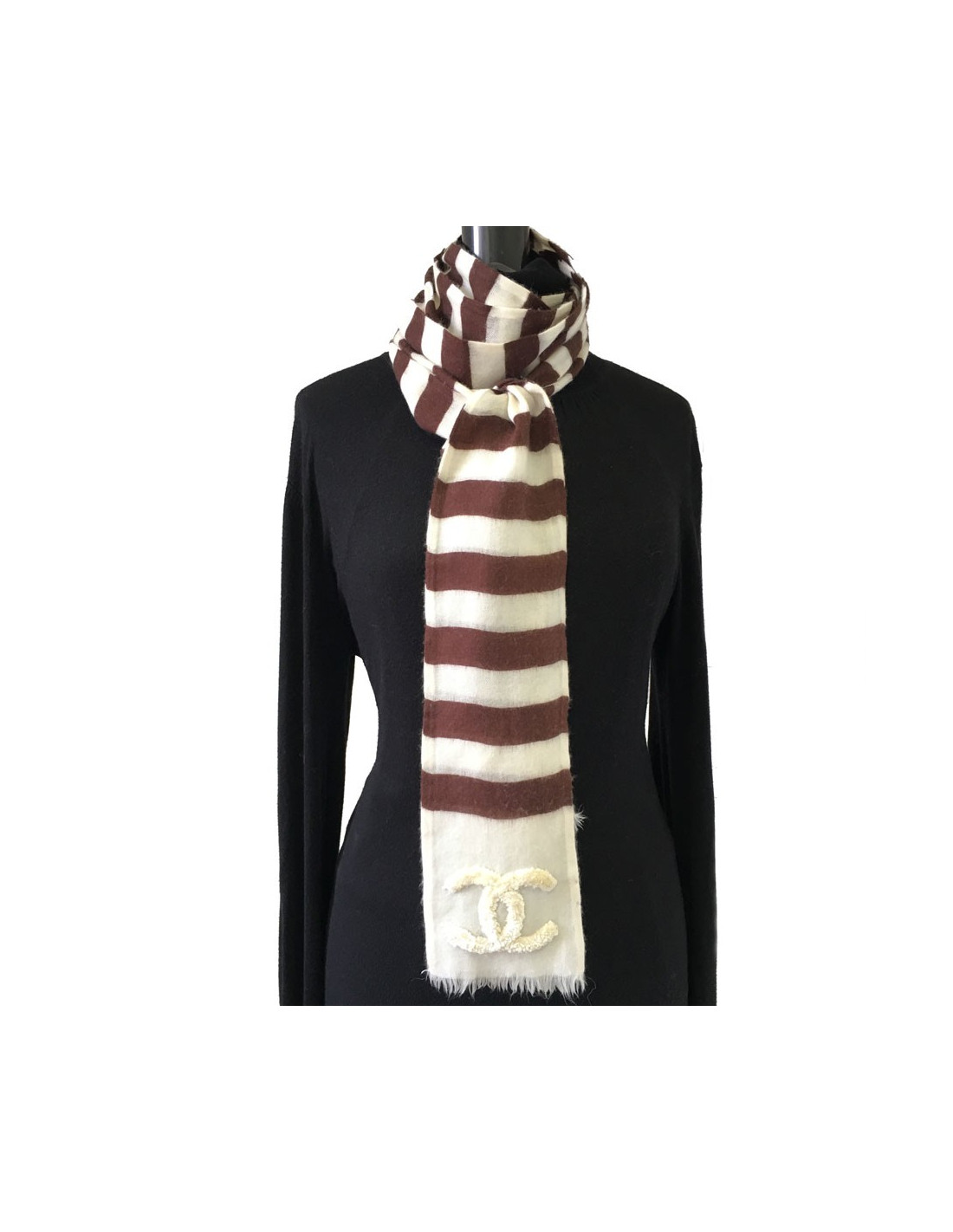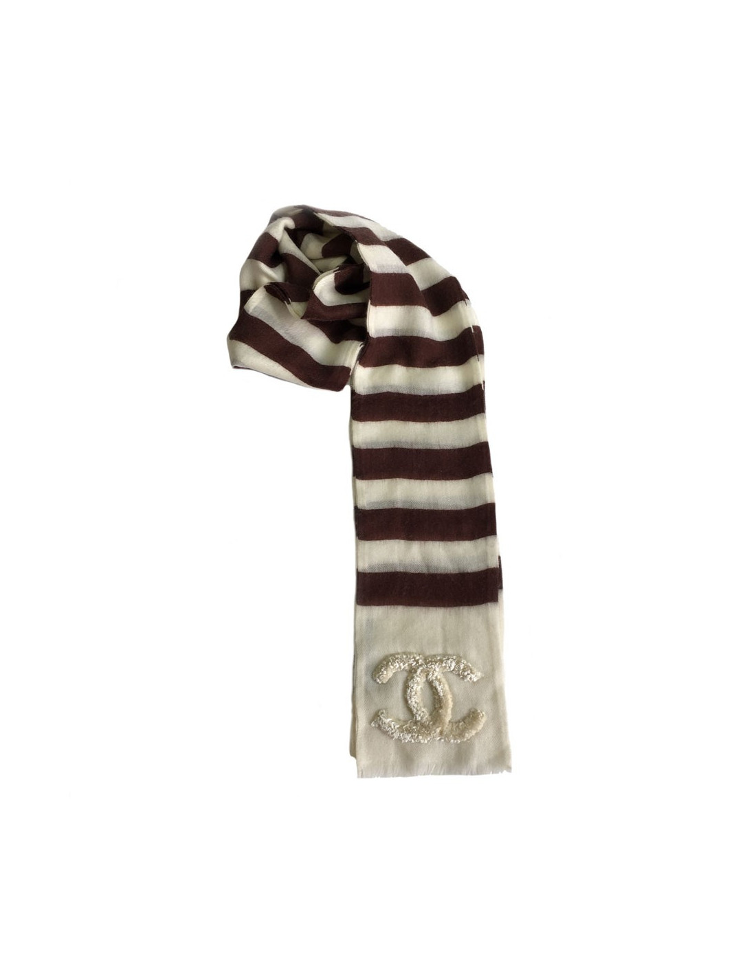 Echarpe Chanel rayée écrue et marron en cachemire. De petites franges terminent l'écharpe. Un CC ivoire en velours sur chaque pan. Etiquettes de marque et matière présentes.