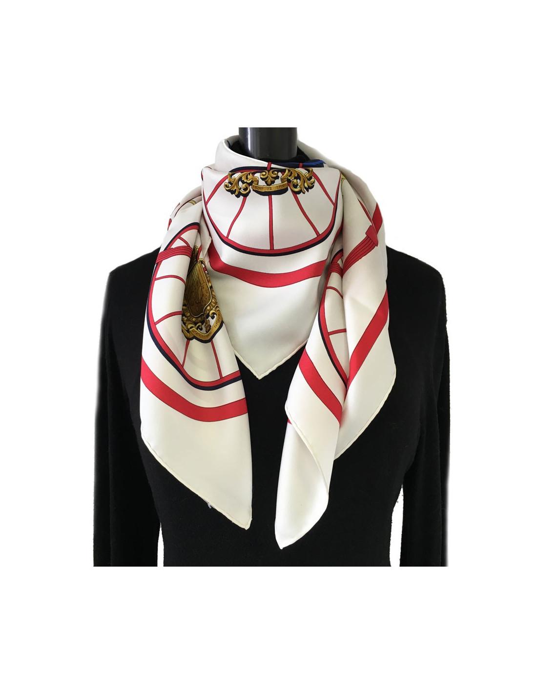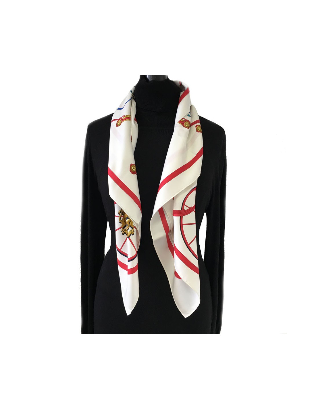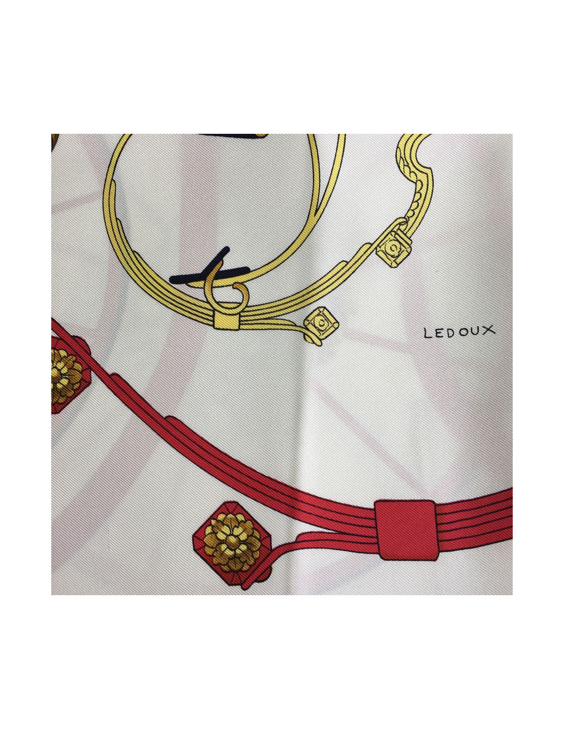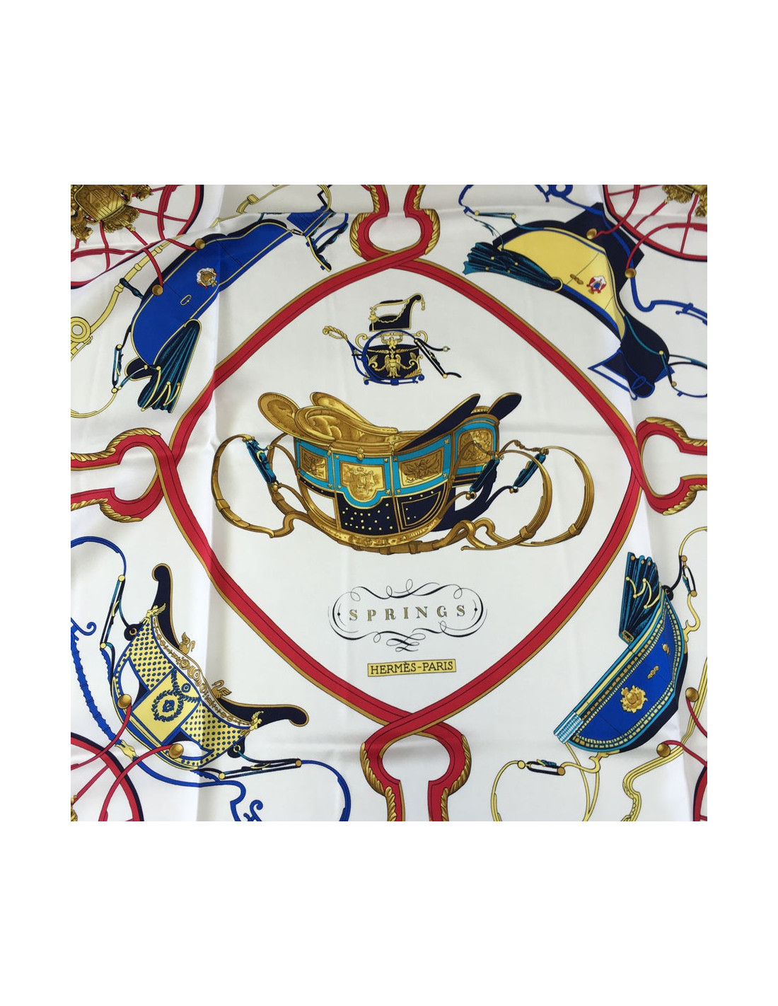 Carré HERMES "Springs" en soie multicolore sur fond blanc