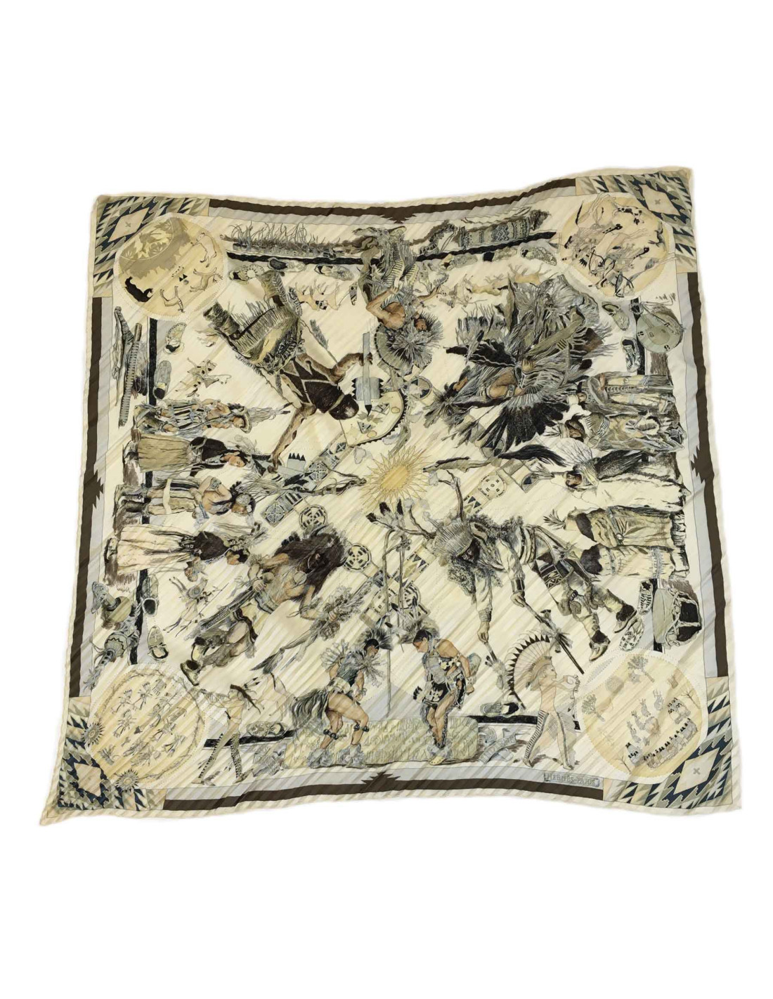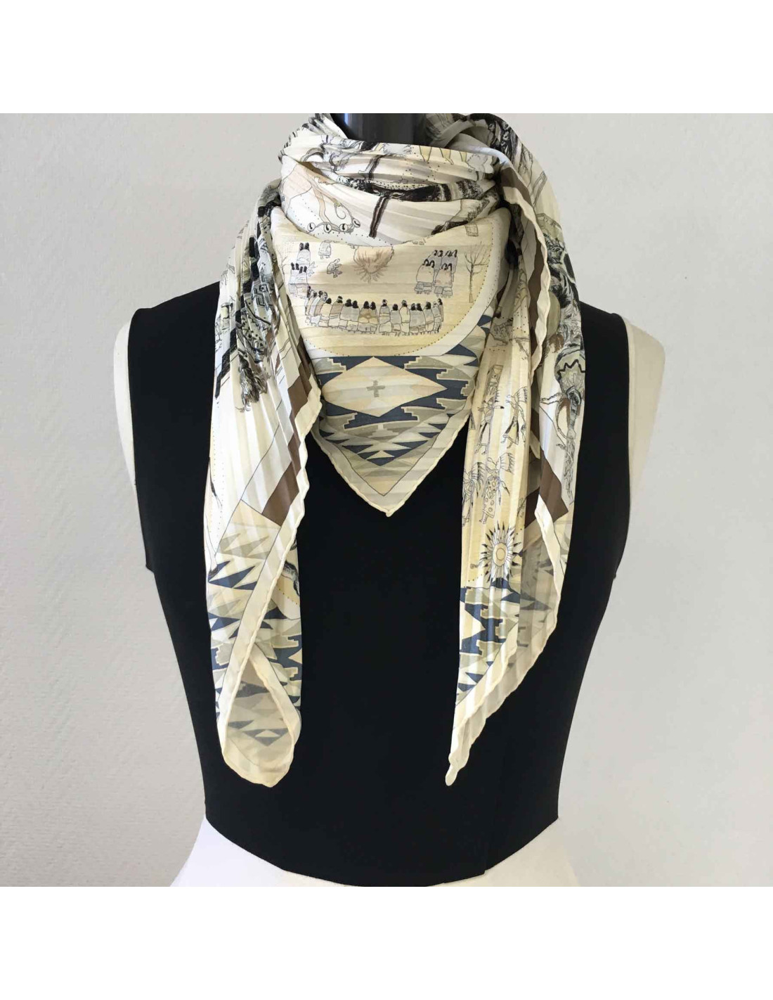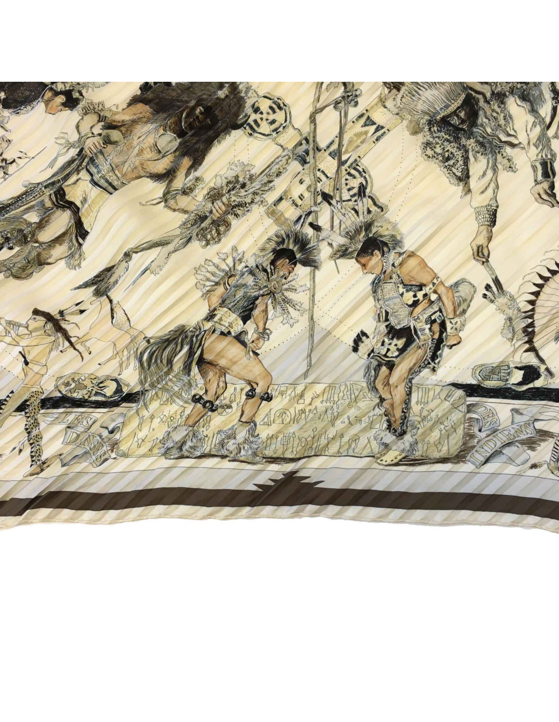 Carré Plissé HERMES "Les danses des indiens" en soie beige