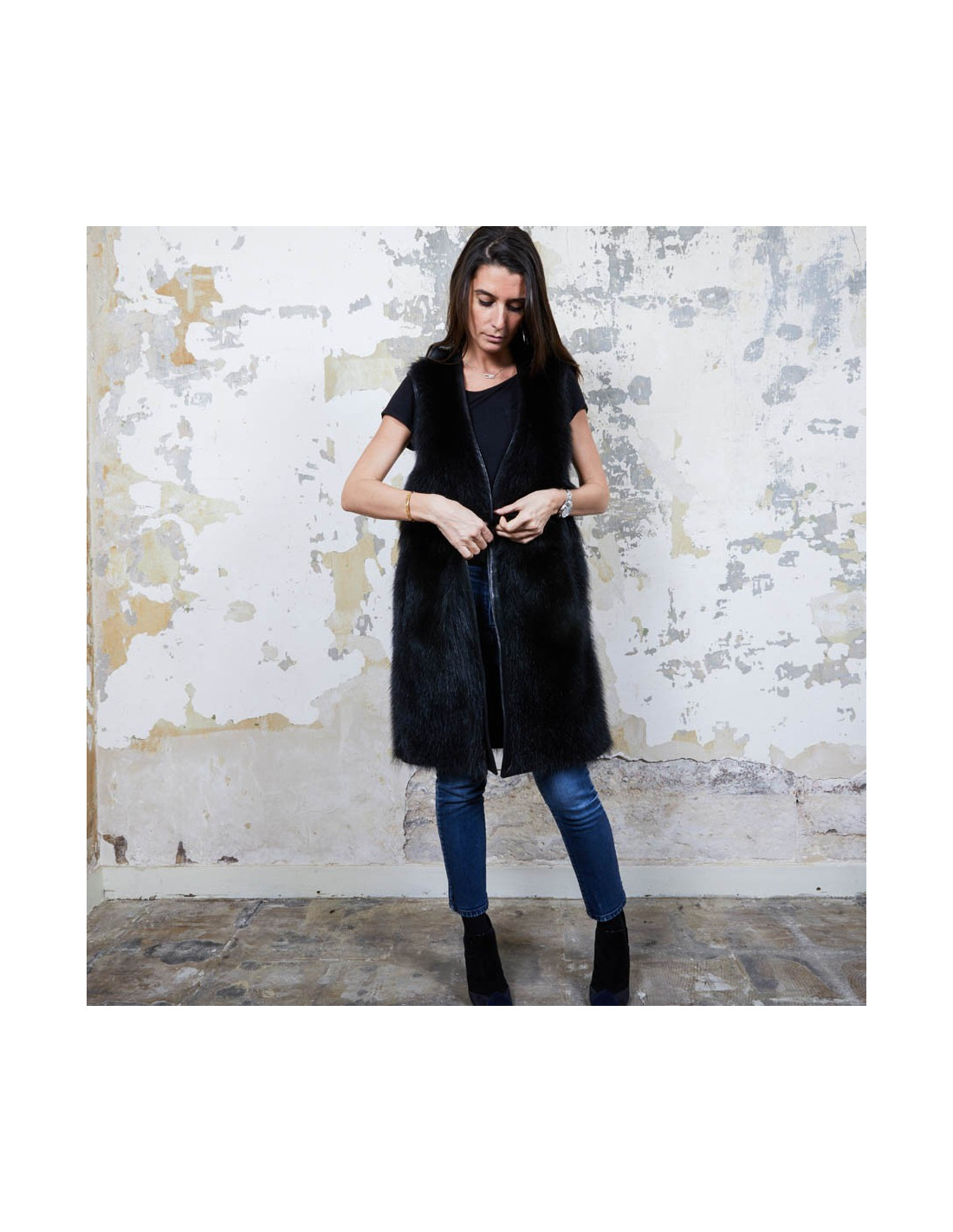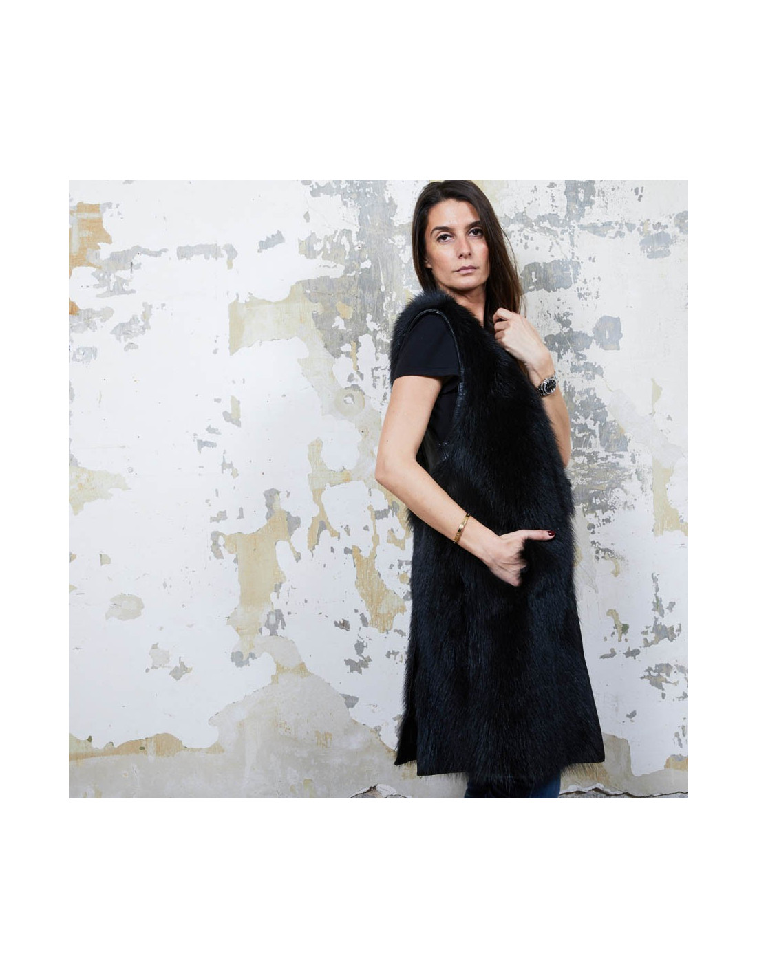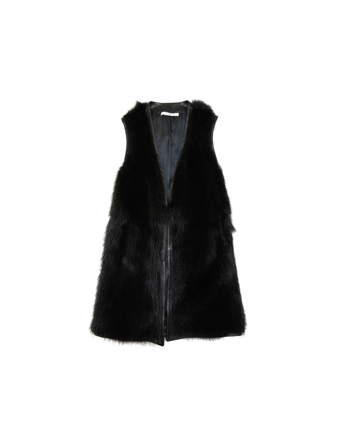 Veste longue en fourrure (castor) et cuir noir Givenchy sans manches. Elle est doublée en satin noir. Taille 40Absence d'étiquette de taille et de matière.