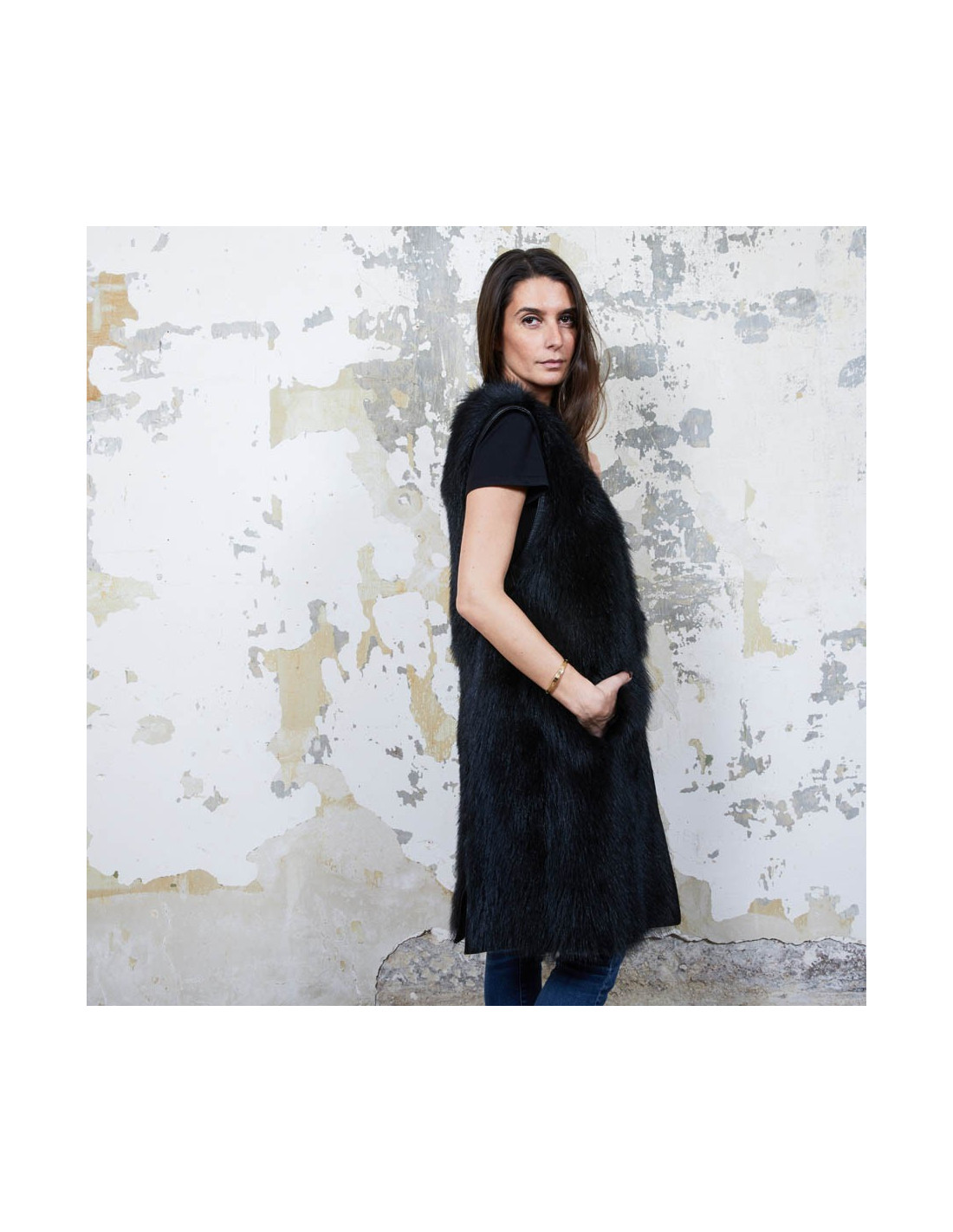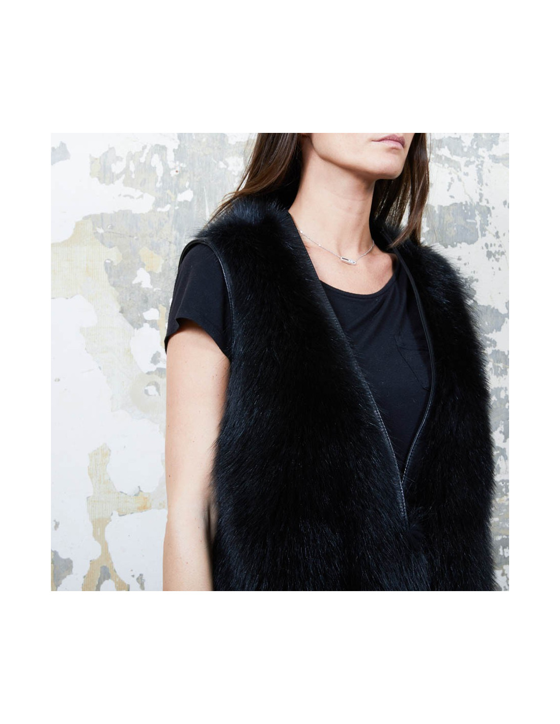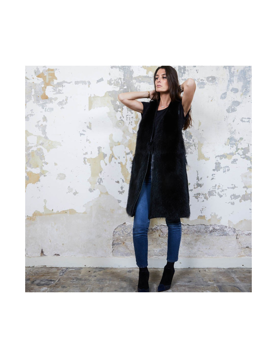 Veste longue en fourrure (castor) et cuir noir Givenchy sans manches. Elle est doublée en satin noir. Taille 40Absence d'étiquette de taille et de matière.