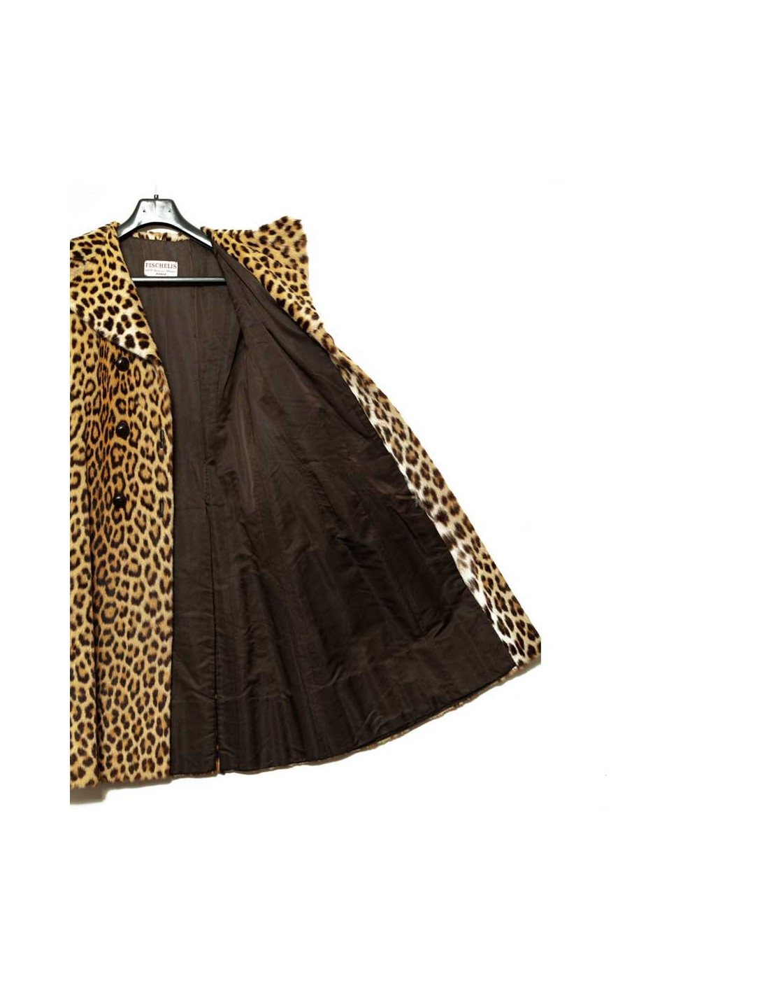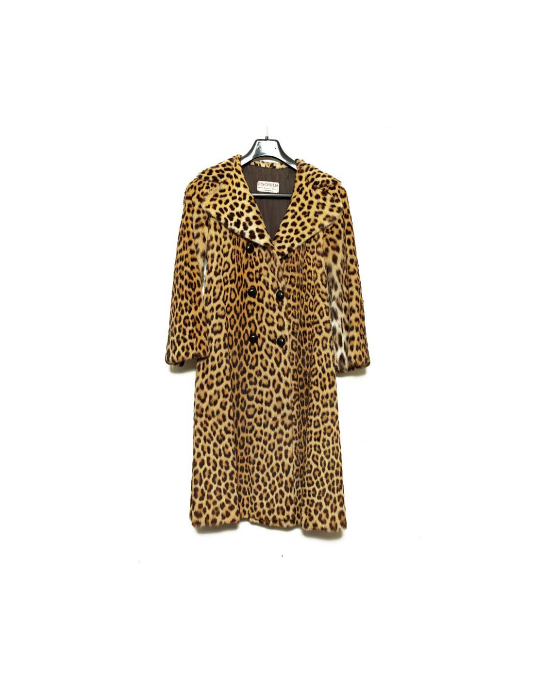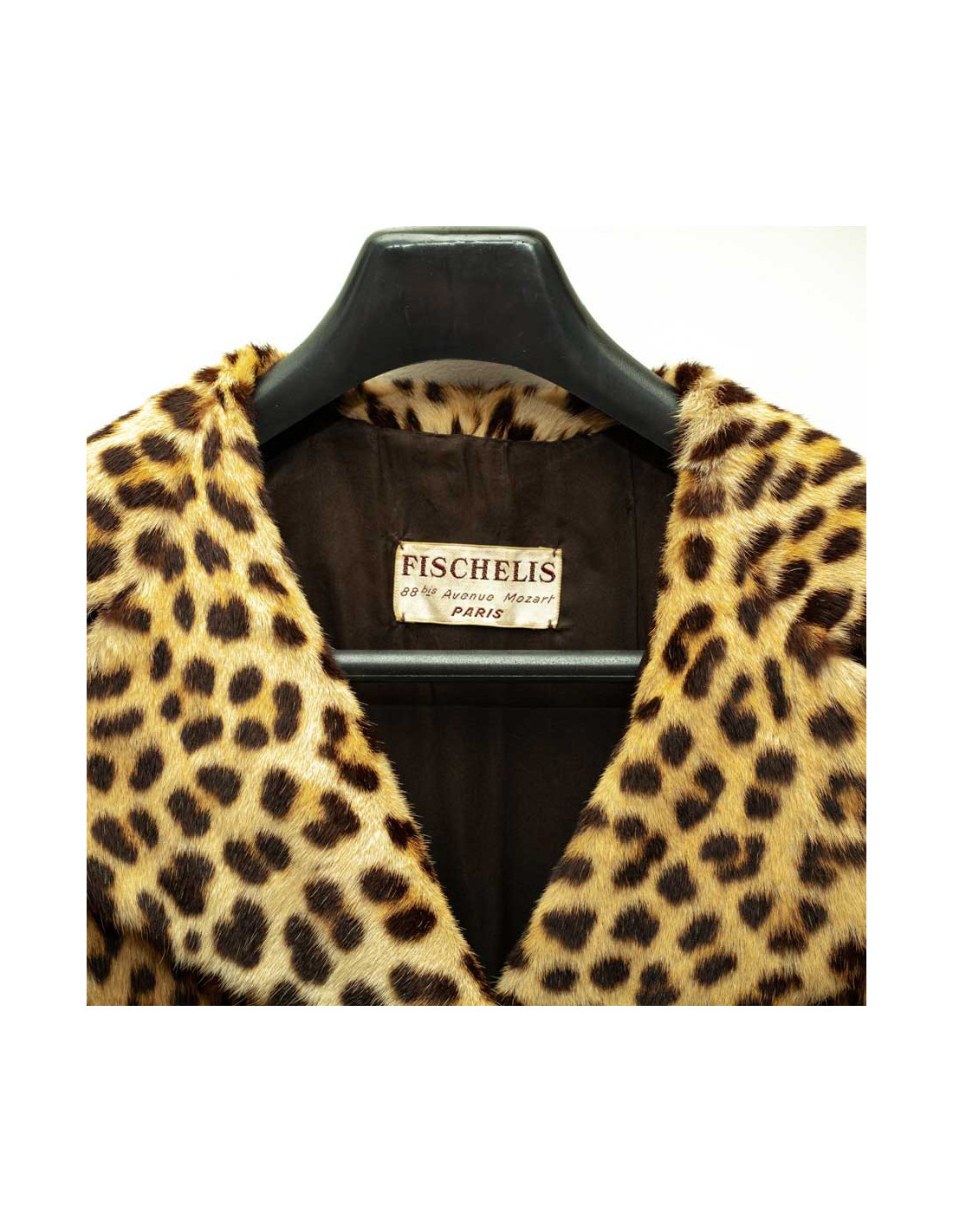 Ce manteau de fourrure G.R FISCHELIS est en léopard. Il a une forme très moderne. Il s'agit d'une taille 38 marquée à la taille en s'évasant vers le bas. La fermeture du manteau se fait par un double boutonnage. Les boutons sont en bois de couleur marron foncé. La doublure intérieure est en satin marron foncé. A l'arrière du manteau il y a une grande fente (hauteur de 47 cm). Le manteau est en très bon état d'usage avec légère usure sur le col.