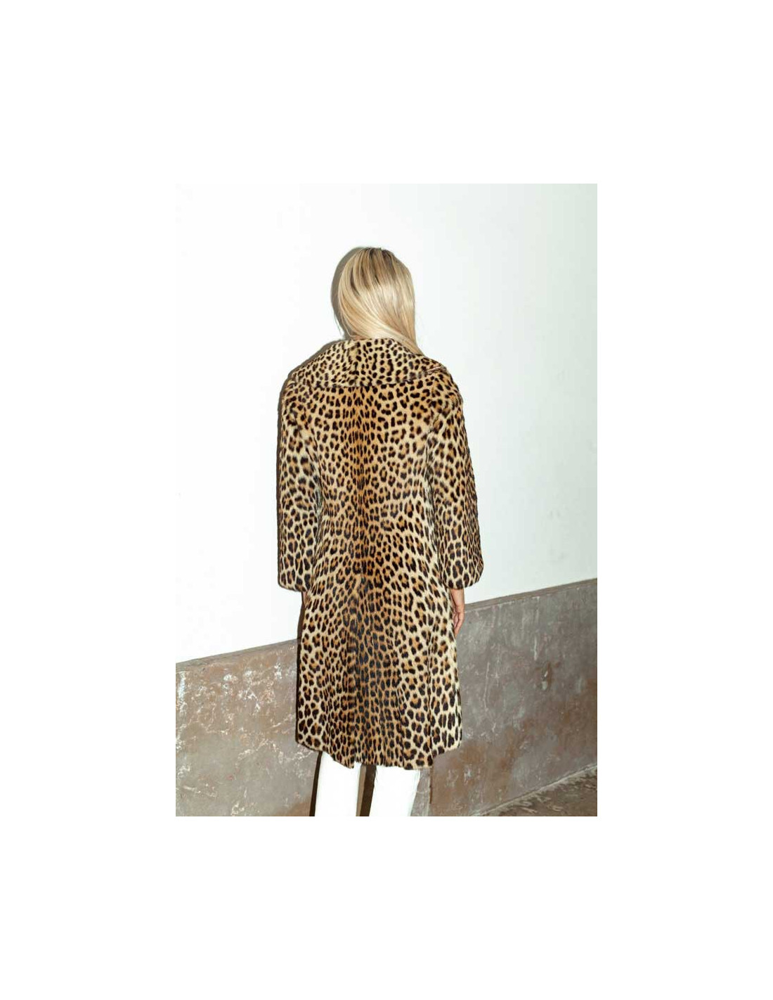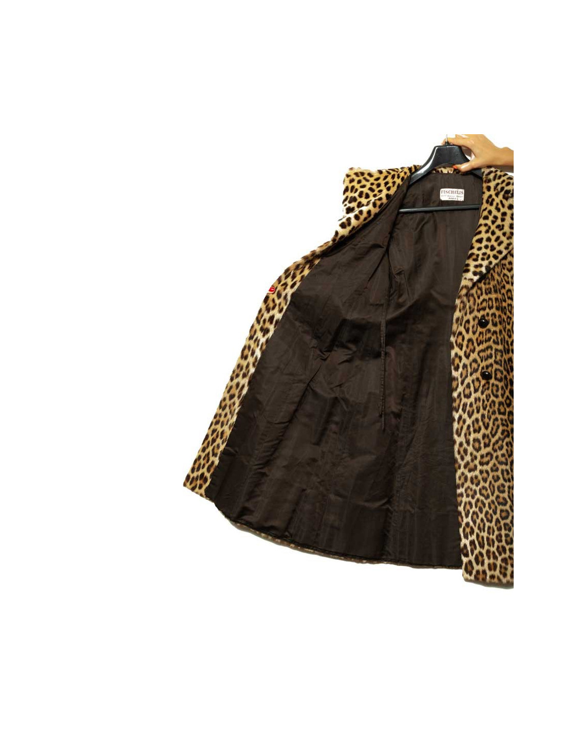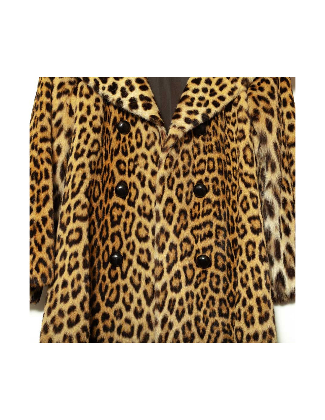 Ce manteau de fourrure G.R FISCHELIS est en léopard. Il a une forme très moderne. Il s'agit d'une taille 38 marquée à la taille en s'évasant vers le bas. La fermeture du manteau se fait par un double boutonnage. Les boutons sont en bois de couleur marron foncé. La doublure intérieure est en satin marron foncé. A l'arrière du manteau il y a une grande fente (hauteur de 47 cm). Le manteau est en très bon état d'usage avec légère usure sur le col.