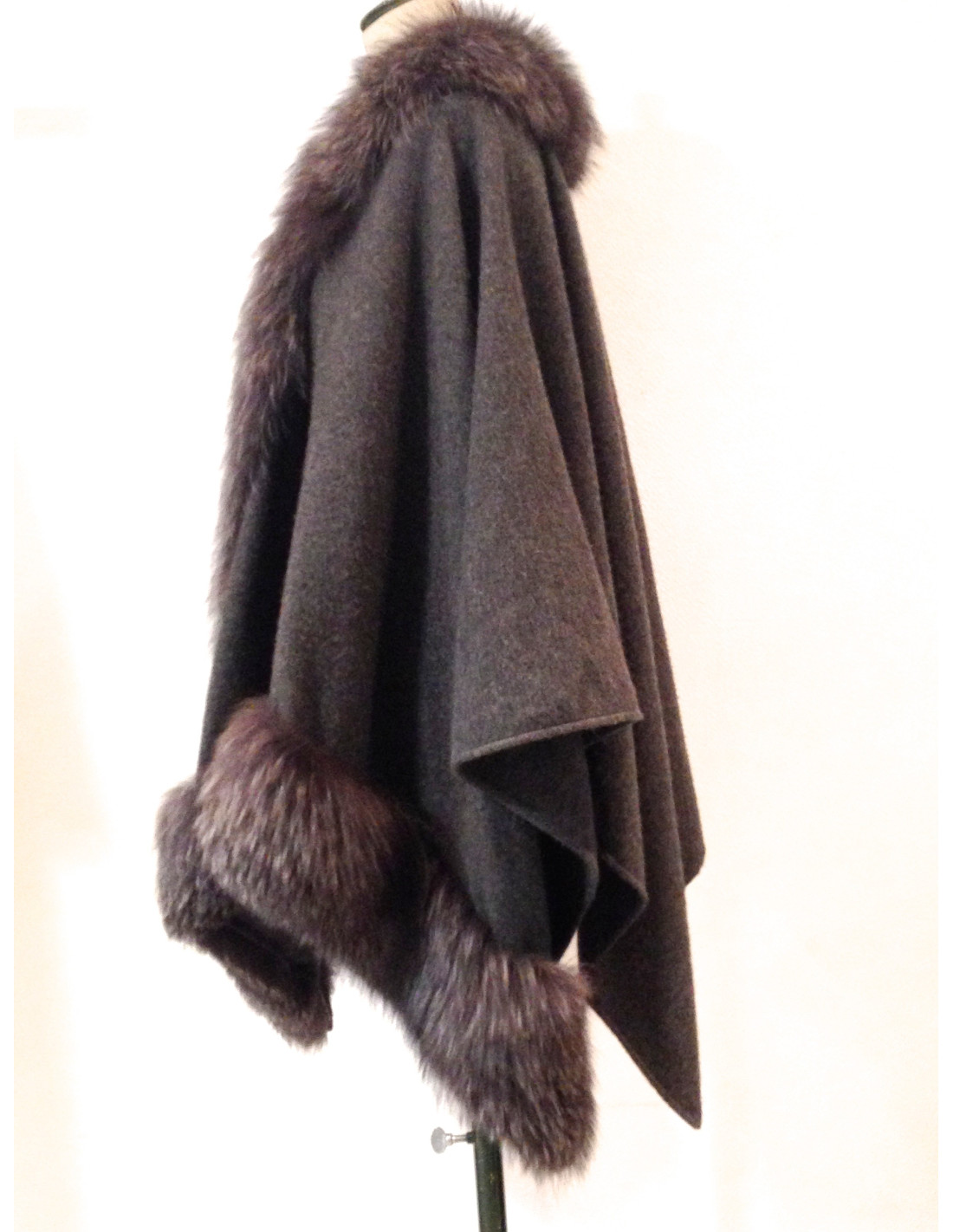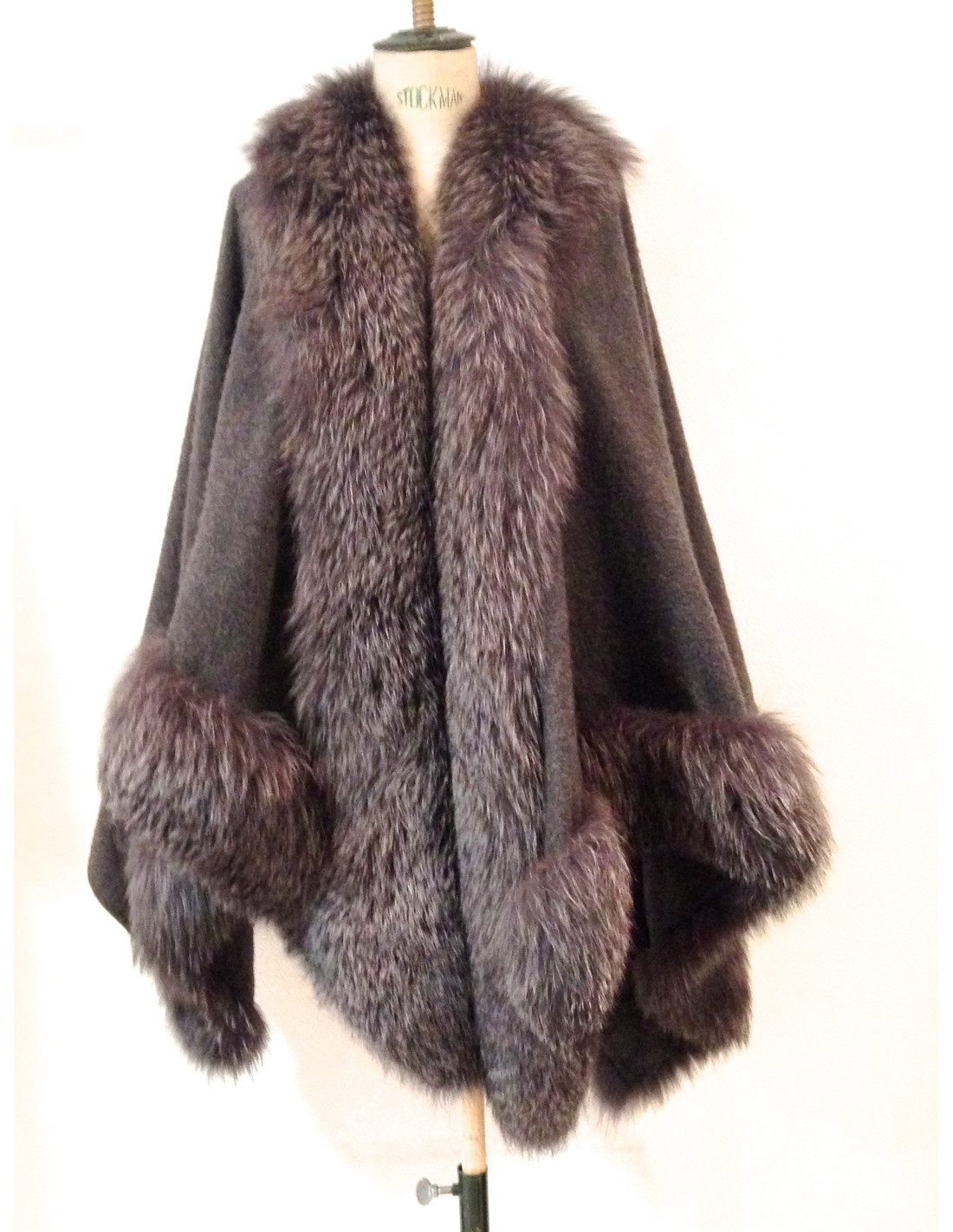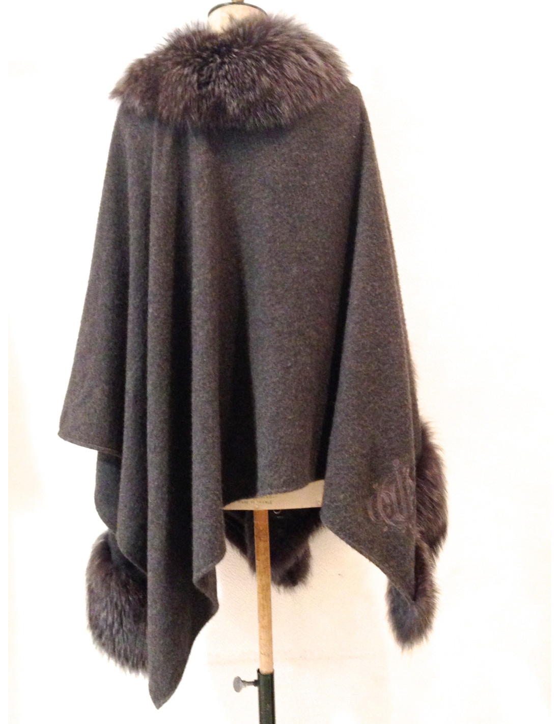 Belle cape Couture CHRISITAN DIOR en cachemire gris soutenu et bordée d'une large fourrure (RENARD argenté). on peut la porter de jour, de façon décontractée et le soir sur de jolies tenues.