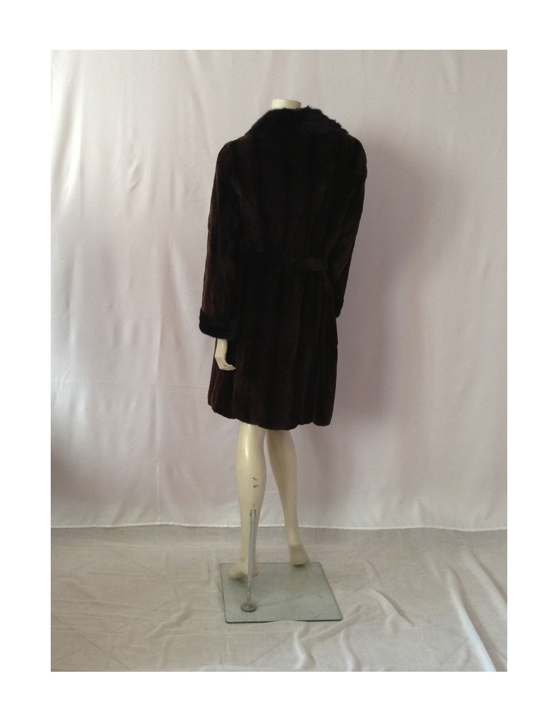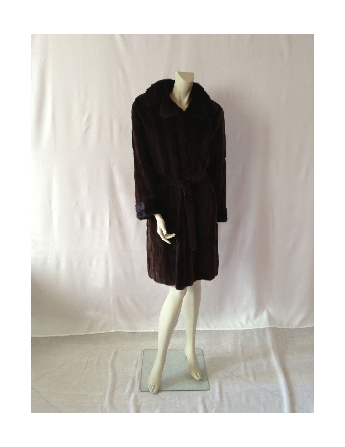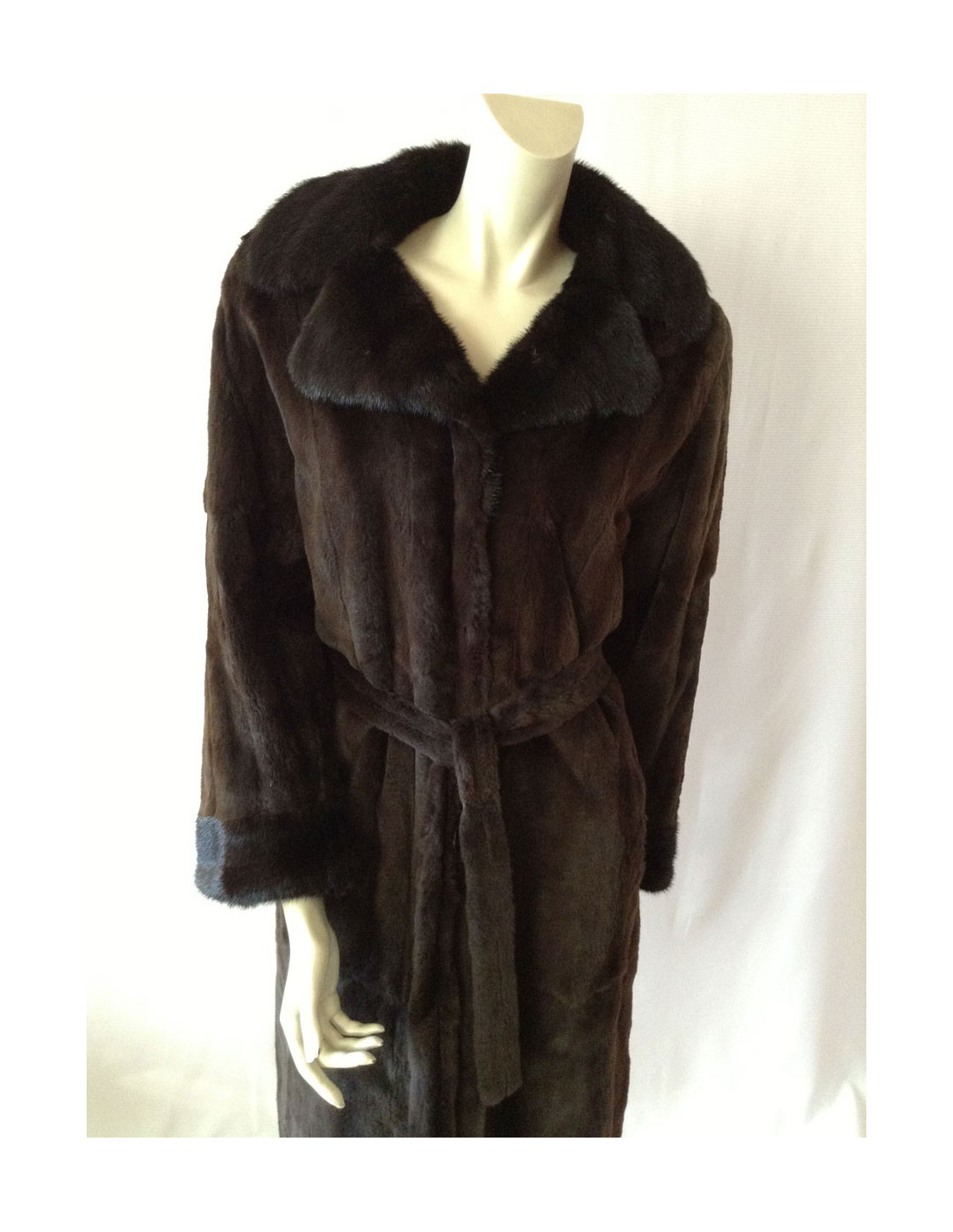 Manteau en vison rasé marron avec ceinture assortie, le col et les finitions des manches sont de couleur marron plus foncé en vison non rasé . Ce manteau taille comme un 38fr. Manteau sans marque.