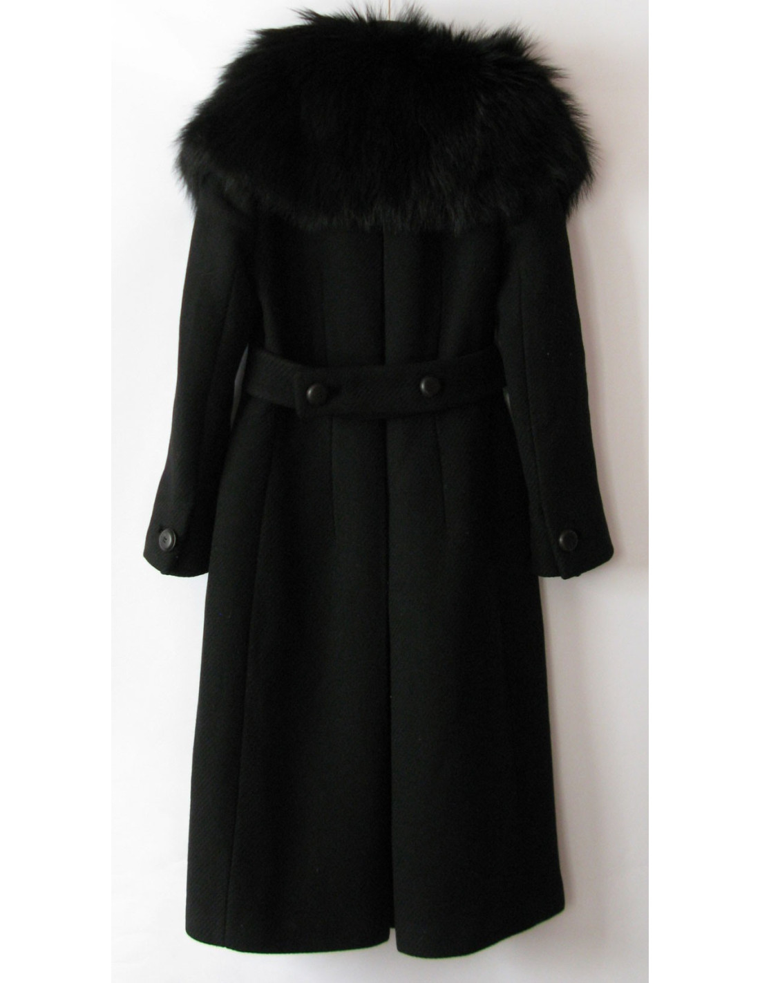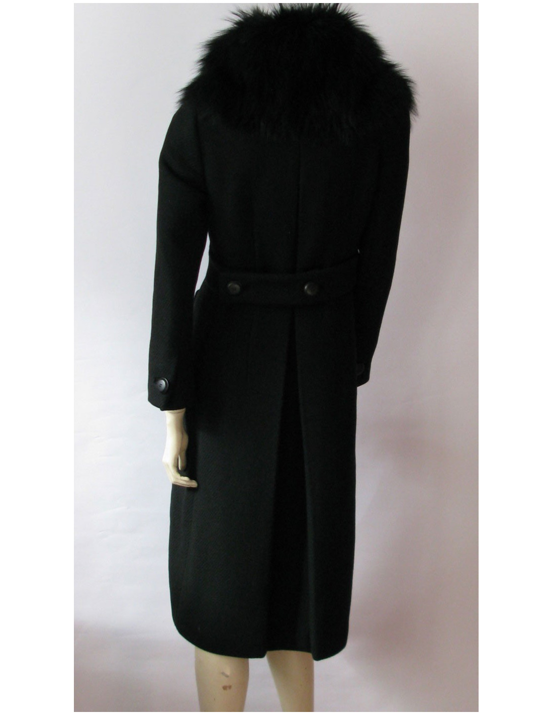 Manteau en lainage noir à motif rayures, demi-ceinture boutonnée au dos sur les coutures latérales, fente médiane à partir de la taille, double boutonnage devant avec boutons intérieurs pour ajuster la taille et poche fendues sur les côtés. Doublure (sur 4 cm) légèrement décousue.