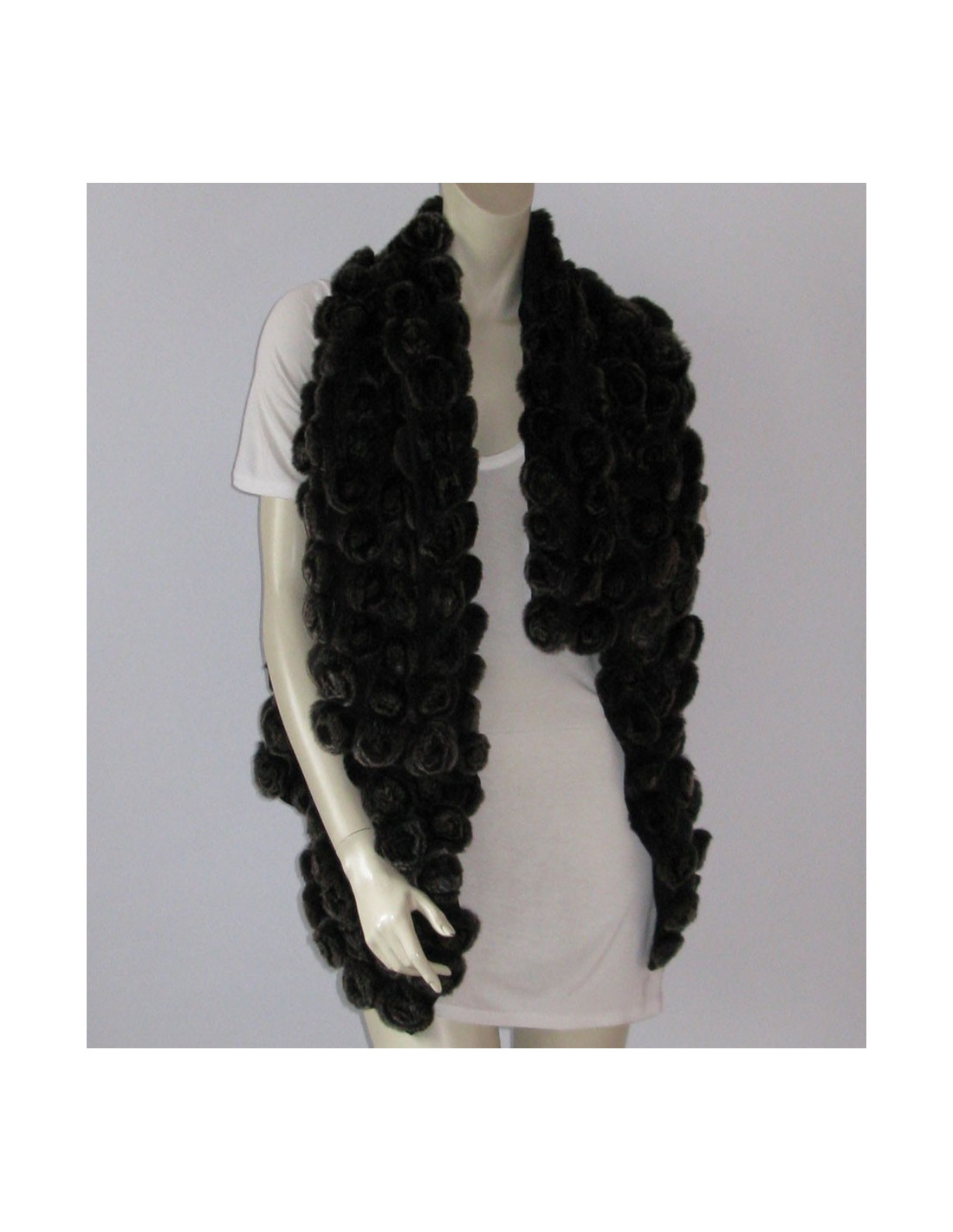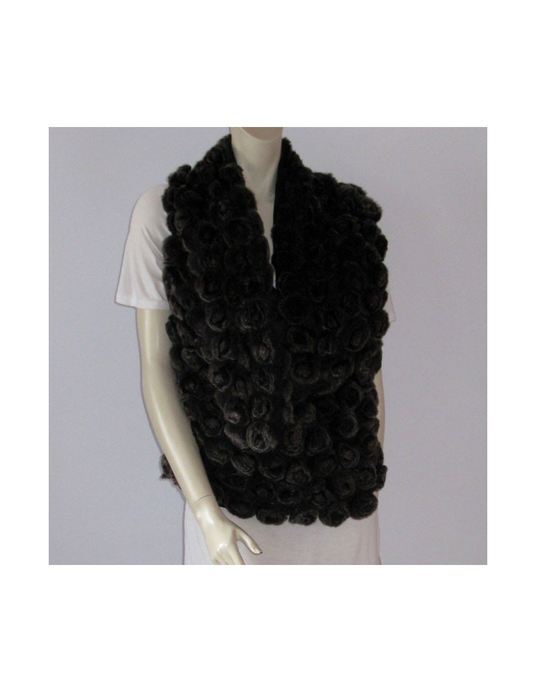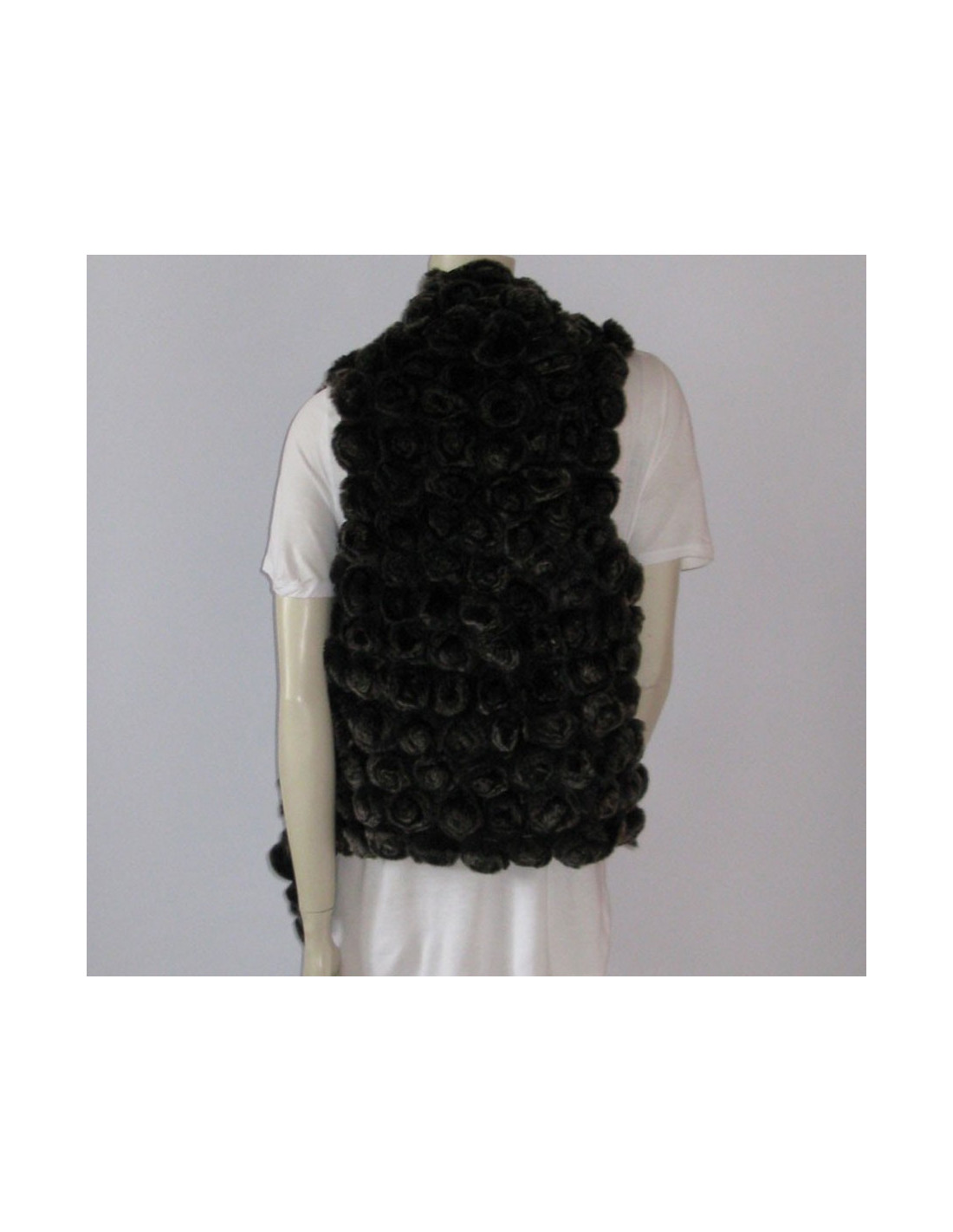 Pièce d'une grande élégance! Veste YVES SALOMON T36FR en fourrure : orylag, sans manches, incrustée de pompons en forme de fleurs. Col à large revers, base asymétrique plus courte au dos. La doublure est noire.