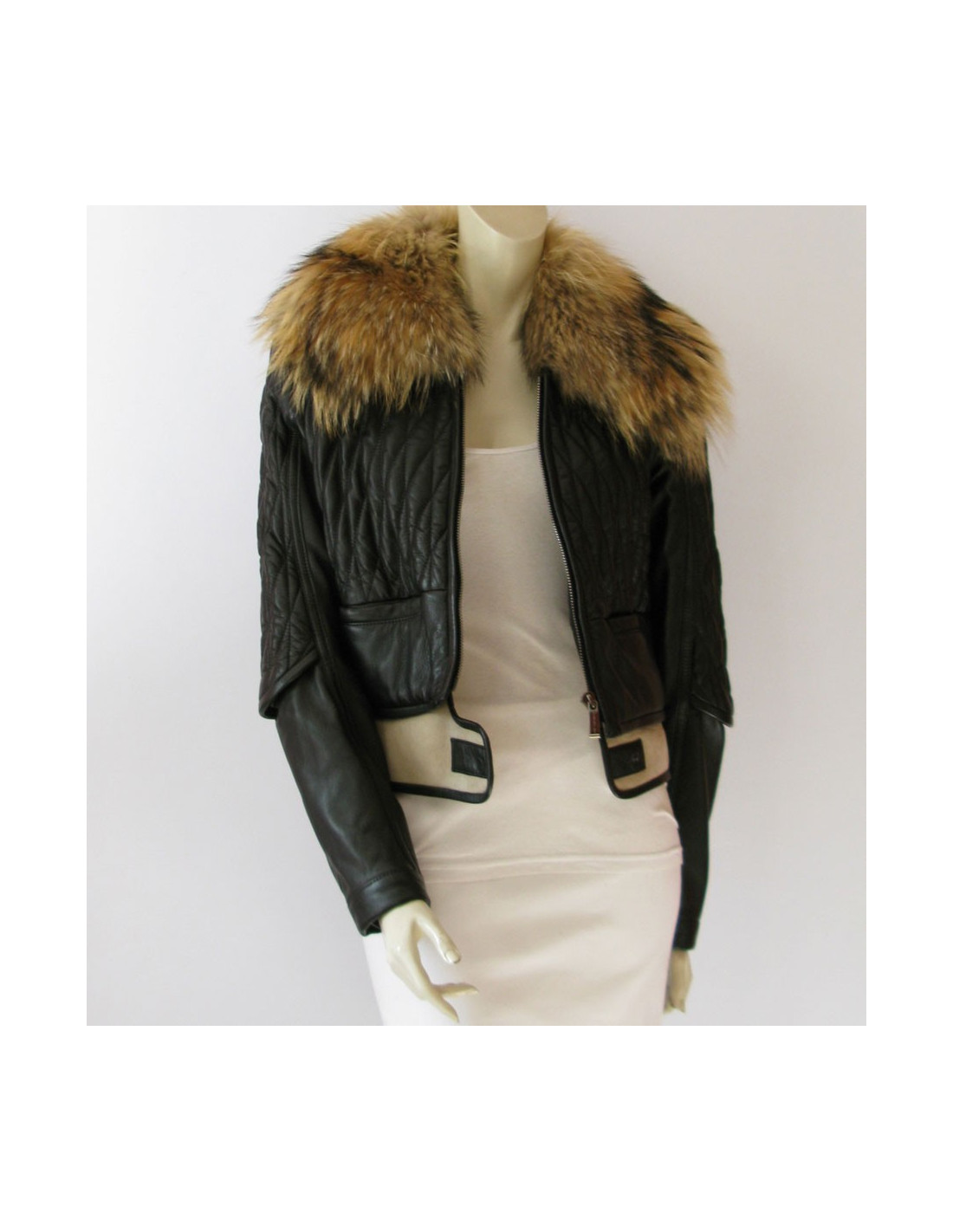 Rock Chic! Blouson Biker BARBARA BUI T40FR, en cuir matelassé noir, col amovible en marmotte de russie, manches longues, coupe légèrement ajustée. Au bas du blouson bande contrastée en daim écru avec revers en mouton et fermeture pression. Poches appuyées sur le devant. Fermeture éclair large au centre siglée "Barbara Bui", intérieur en soie noire.100% Agneau. Doublure 100% soie.