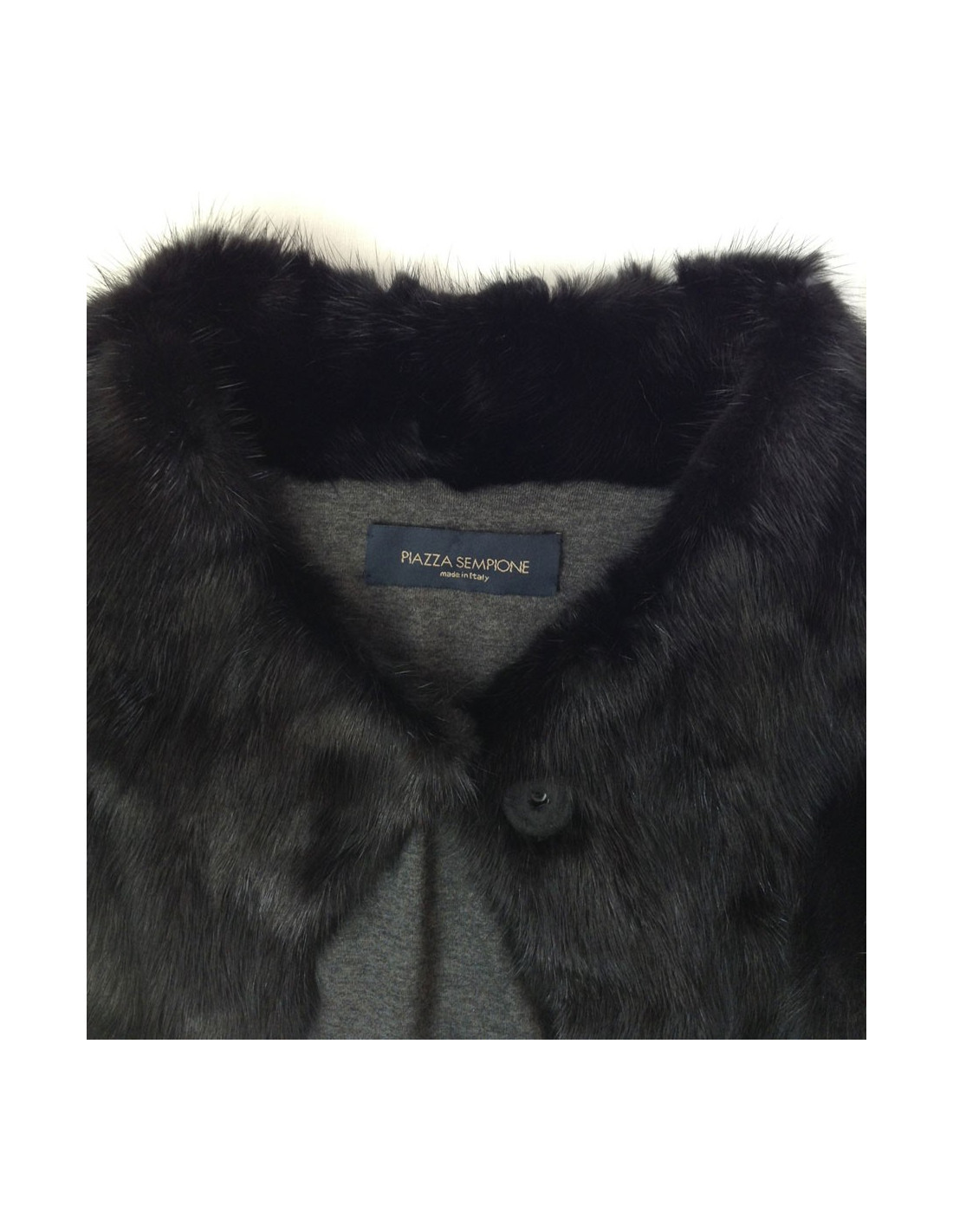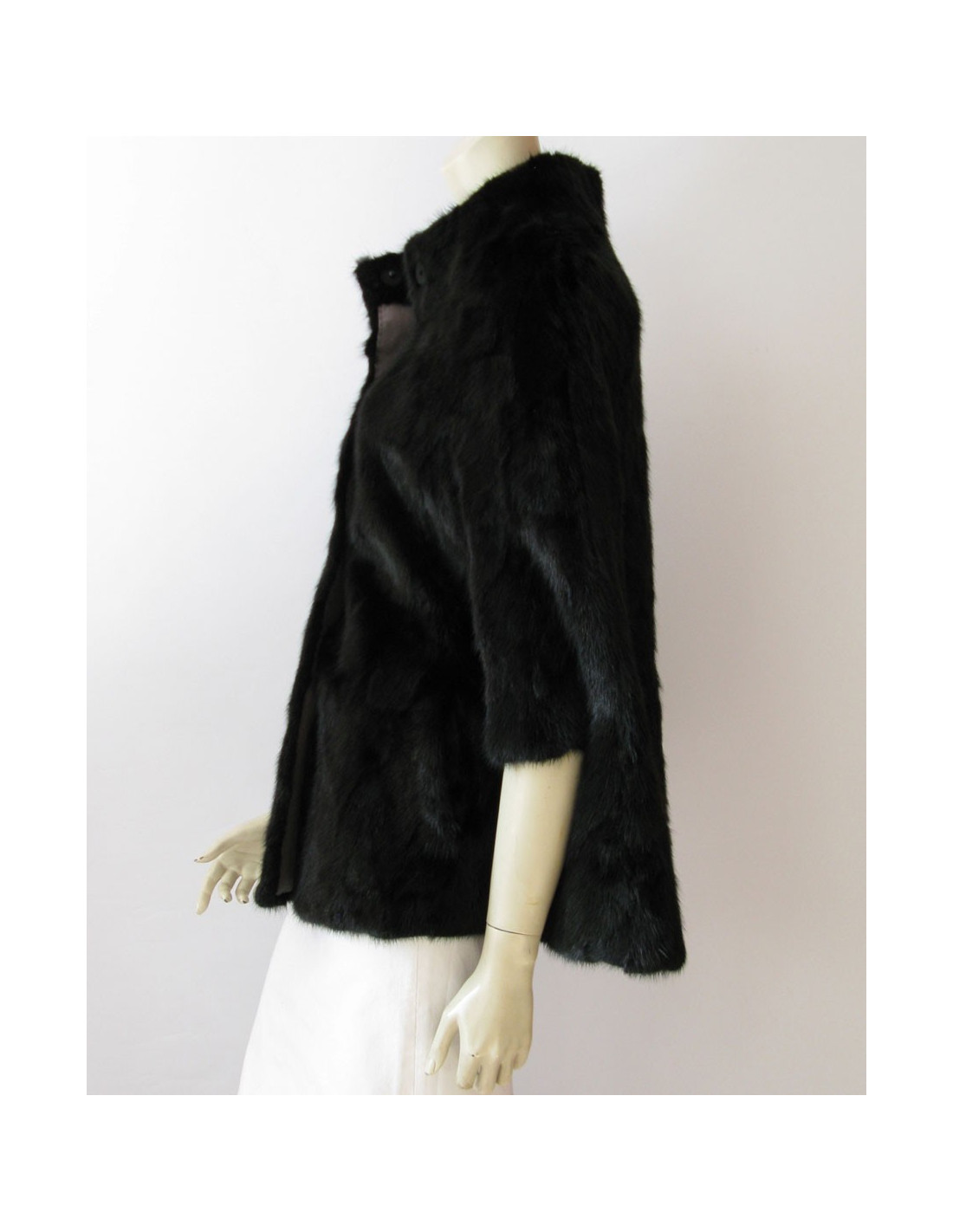 Fermeture frontale par 4 boutons gris anthracite à pressions doublés à l'intérieur d'une jolie bande en gros grain gris clair assortie à la doublure et aux boutons. Taille 38fr voir même 40fr. 100% vison.