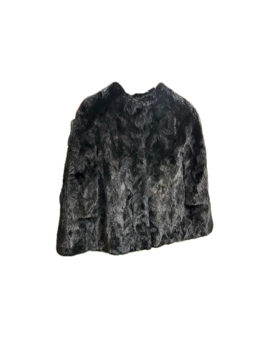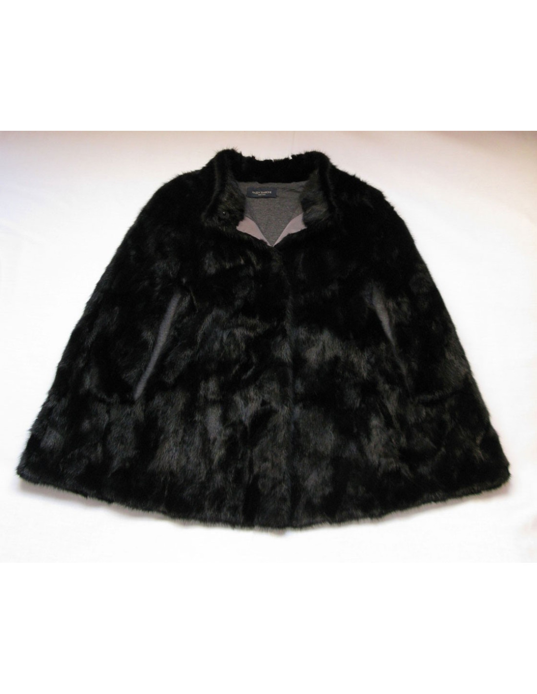 Cape PIAZZA SEMPIONE en vison noir, sans manches, fente d'aisance pour y passer les bras, encolure ras du cou, poches invisibles en biais sur les côtés.