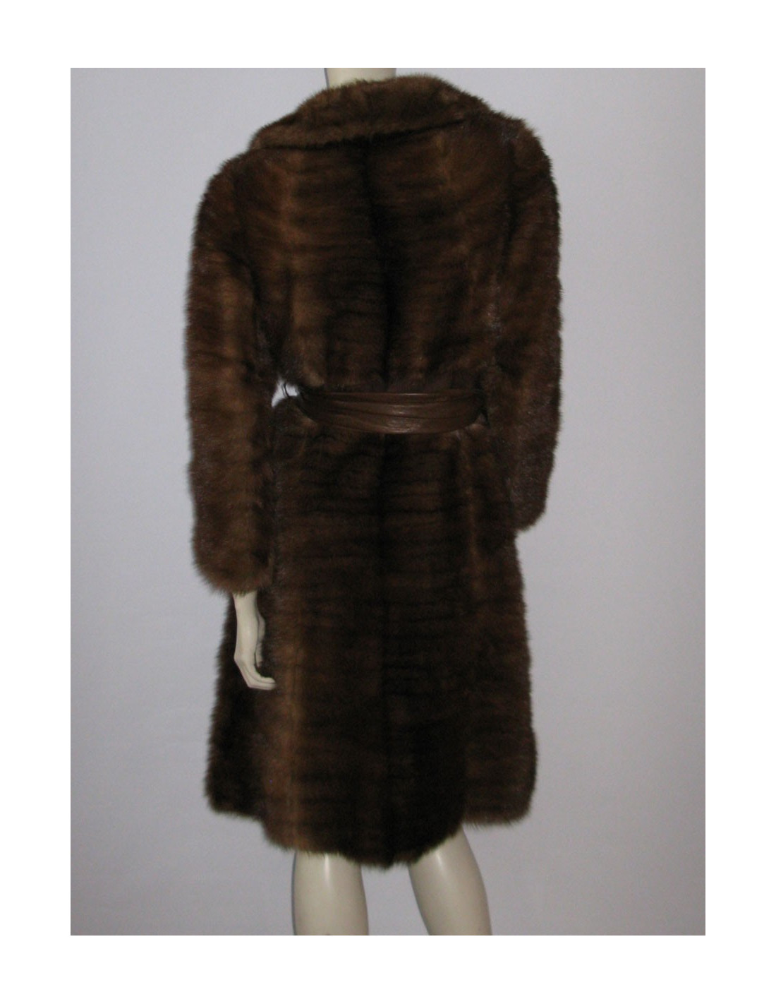 Splendide! Manteau de vison année 70' marron T36Fr, mi-long, col cranté, manches longues. Vison femelle travaillé à l'horizontal agrémenté d'une ceinture et d'une bande en cuir marron intégrée tout autour de la taille. Fermeture par crochets. Poches en biais sur les côtés. 100% vison.
