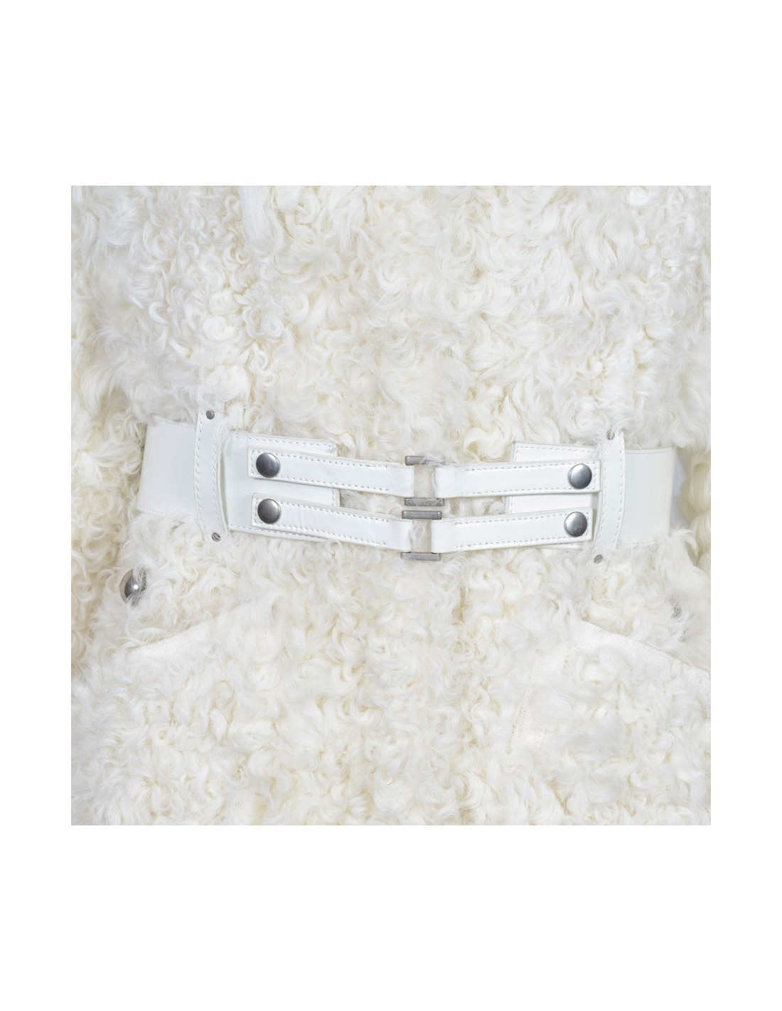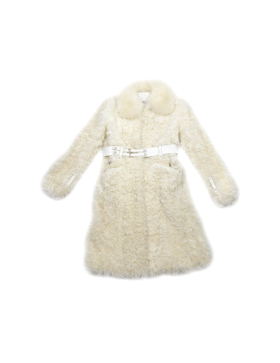 Magnifique manteau stella Boticelli en fourrure d'agneau bouclée du Tibet et col de renard, fourrure de couleur blanche naturelle, fermeture centrale par 6 boutons crochets, ceinture effet cuir à la taille, une poche plaquée de chaque côté du manteau. Taille S équivaut à un 36-38. En parfait état.