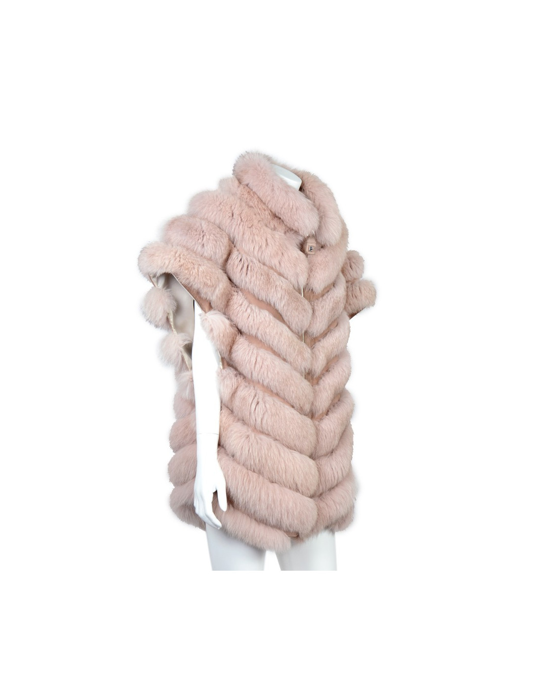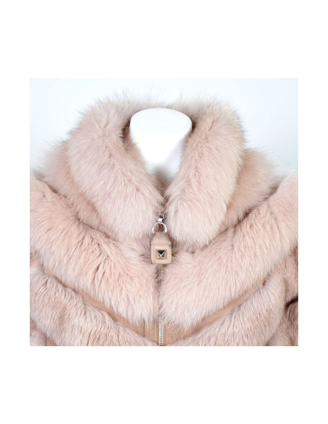 Superbe manteau sans marque en fourrure de couleur rose pâle avec les manches 3/4. Il se compose de bandelettes de fourrure superposées d'autres bandelettes de veau velours du même ton. Une poche de chaque côté. L'intérieur est en satin rose. Fermeture zippée. Pas d'étiquette de taille, équivaut à un 38. Très belle pièce.