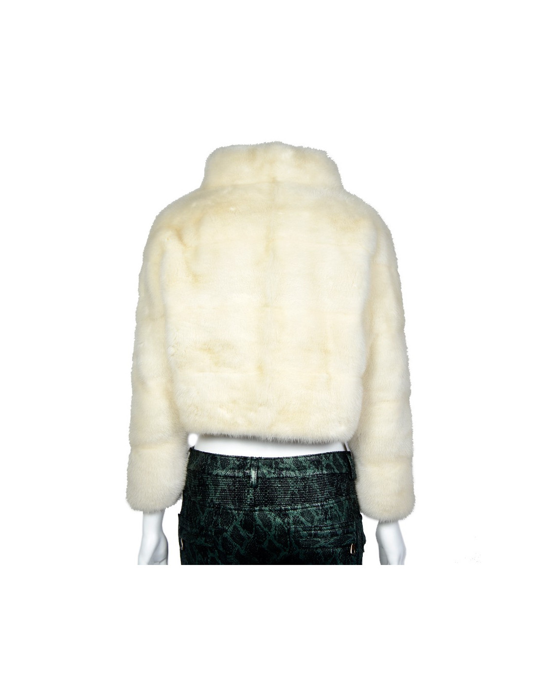 Très élégante veste courte de la Maison Pary fourrure en vison blanc cassé. Pas d'étiquette de taille, équivaut à un 40. Elle se ferme à l'aide de 3 boutons couture en strass. L'intérieur est en soie avec une poche en biais sur le côté. En très bon état.