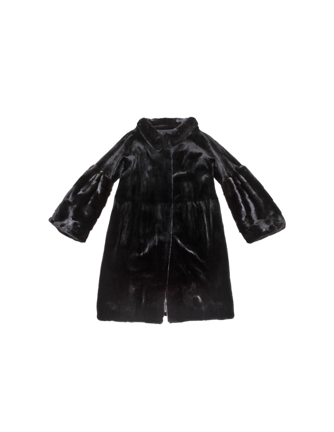 Manteau de la Maison Christian Dior en vison rasé noir et long sur les manches et le col avec des reflets marron. Fermeture par bouton pression. Deux poches en biais. Doublure en soie. Il y a 3 liens en cuir afin de passer une ceinture mais ceinture manquante. En très bon état.