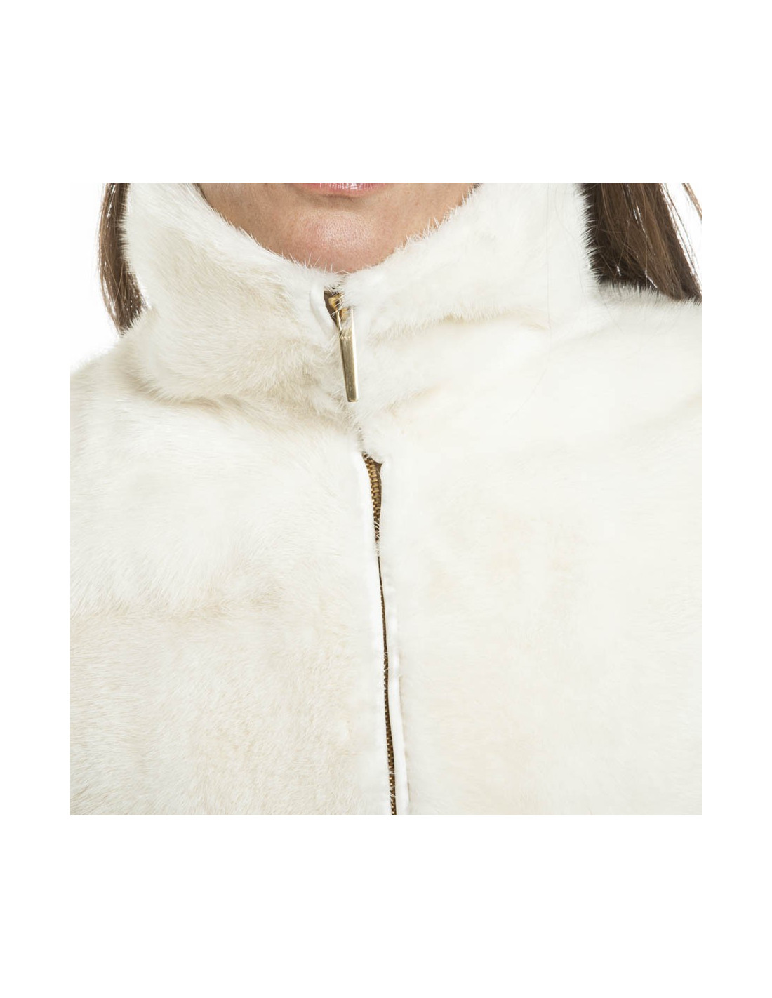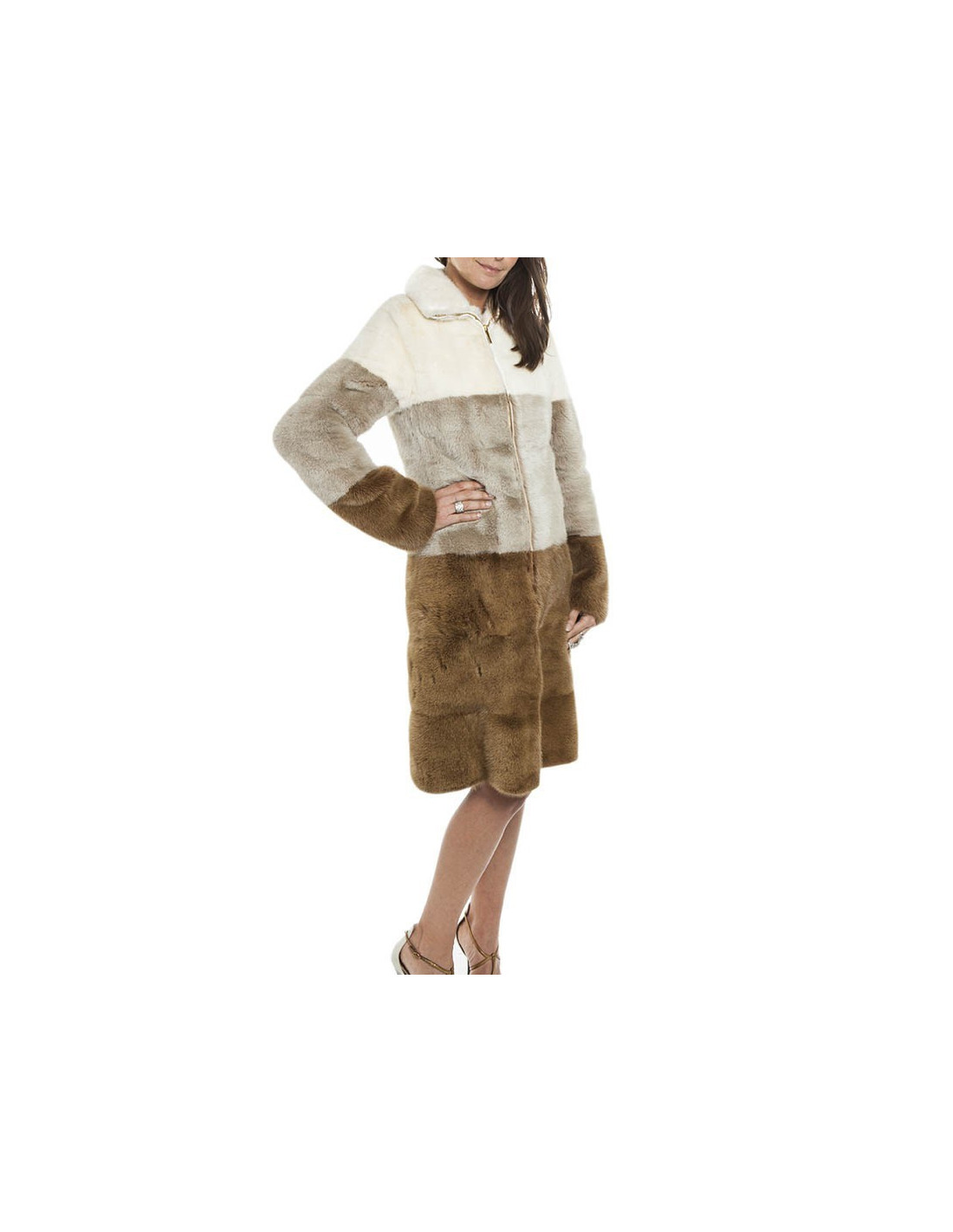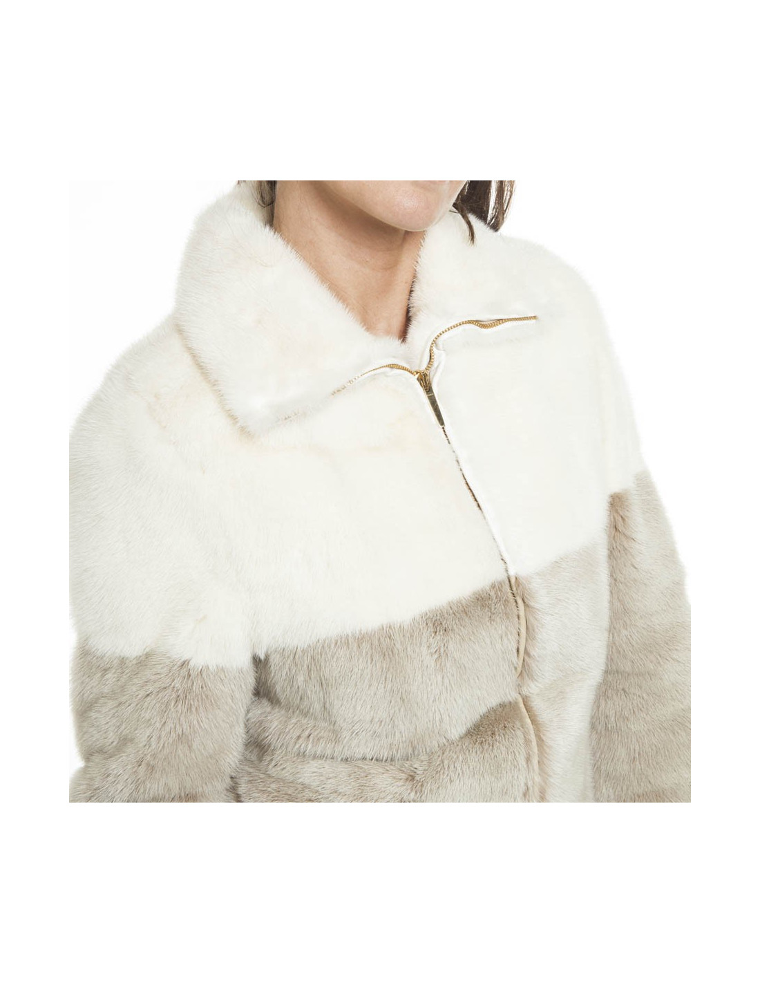Manteau de la Maison Gucci en vison véritable tricolore blanc, gris clair et marron. Fermeture zippée dorée. La doublure est en cuir beige. Une poche intérieure. Une fente à l'arrière.