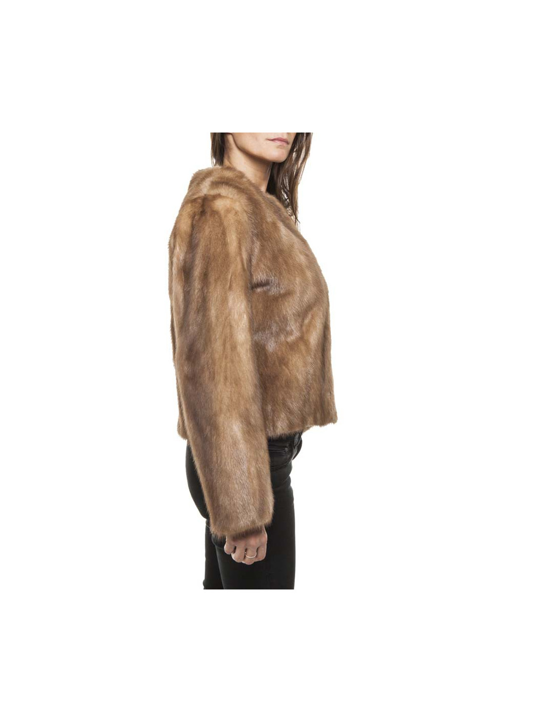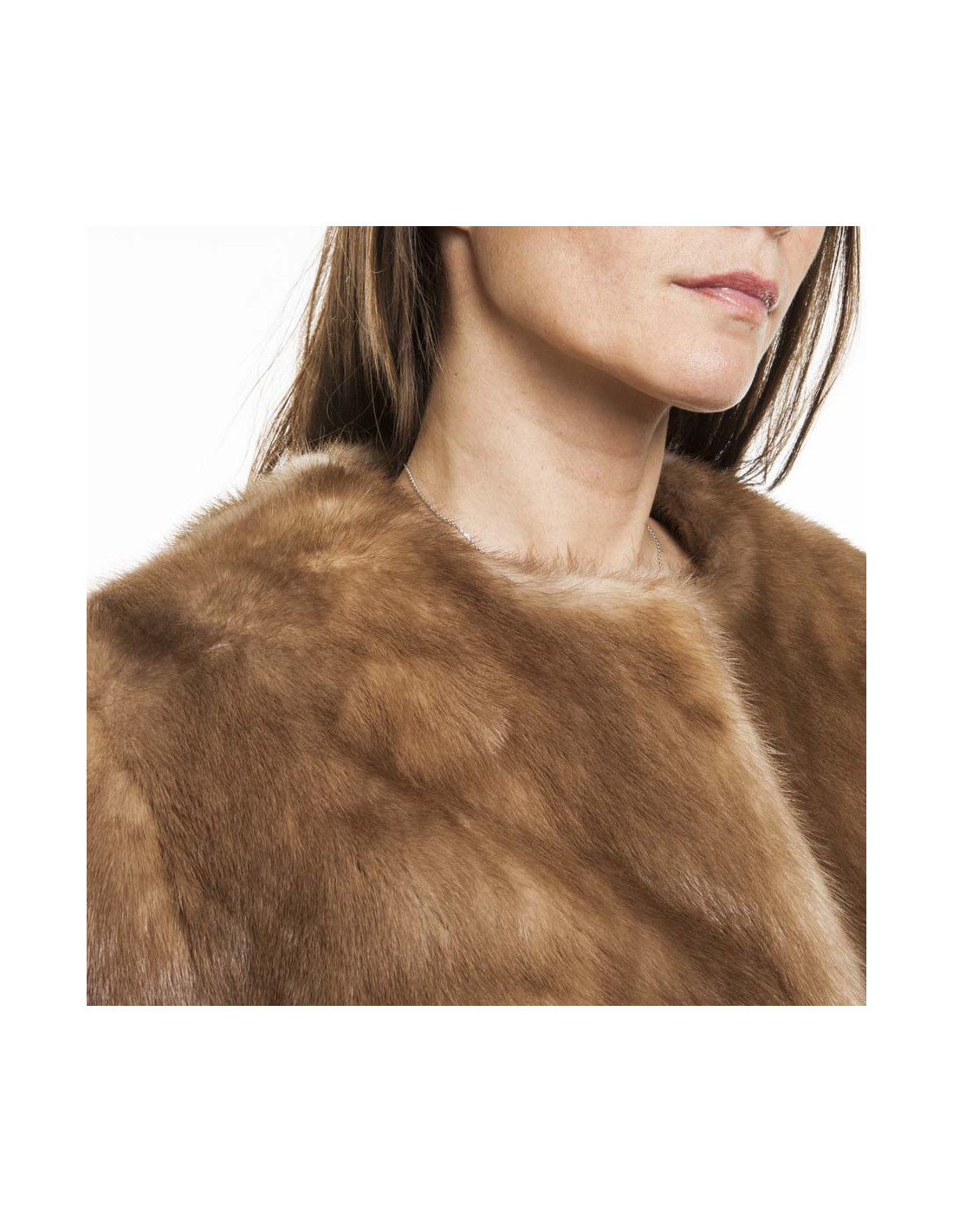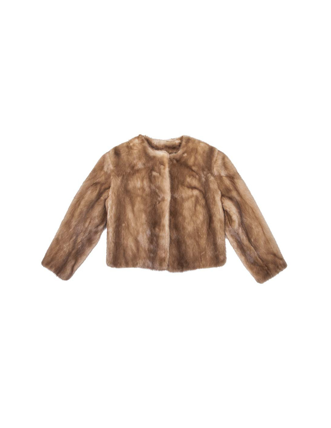 Veste courte en vison fauve ras de cou, sans marque, doublée d'un satin gold, correspond à la taille 40/42 (absence d'étiquette de taille et de matière).