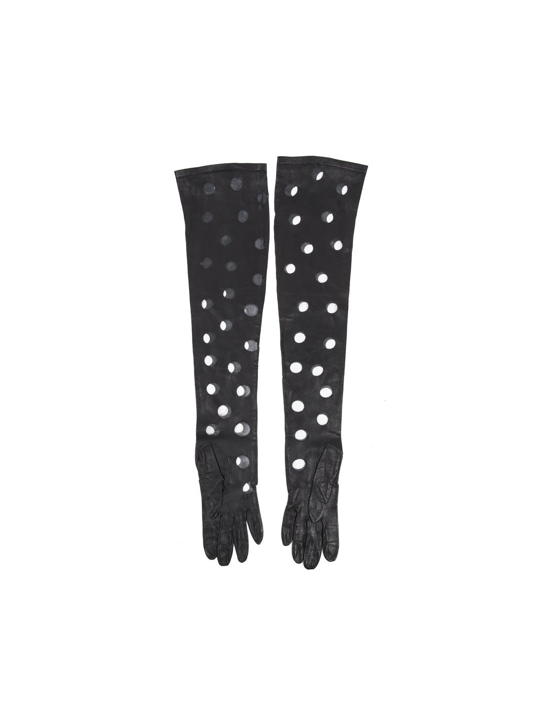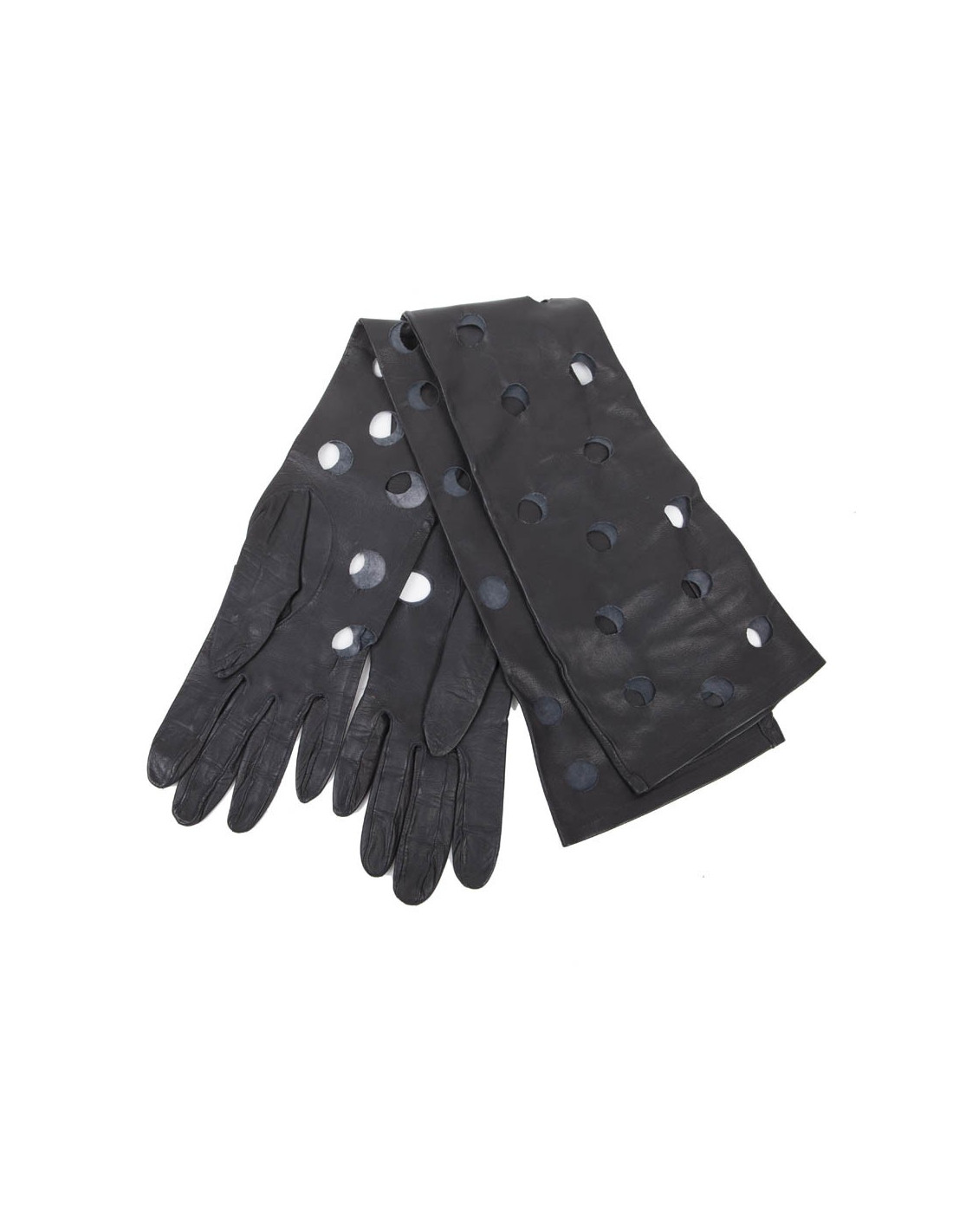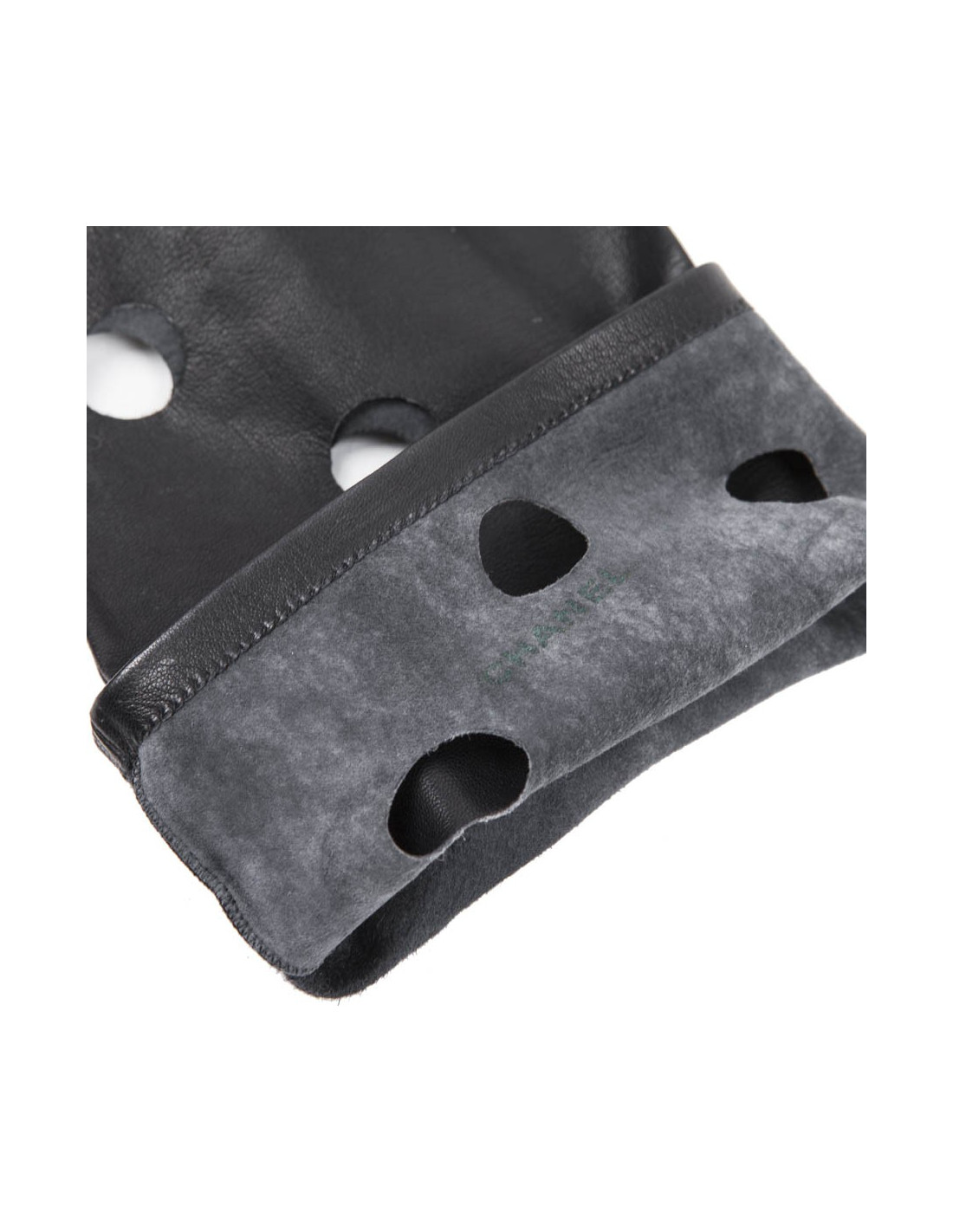 Gants Chanel en cuir d'agneau lisse noir. Ils sont perforés avec des ouvertures rondes régulières. Absence d'indication de taille. Gants de cocktail.