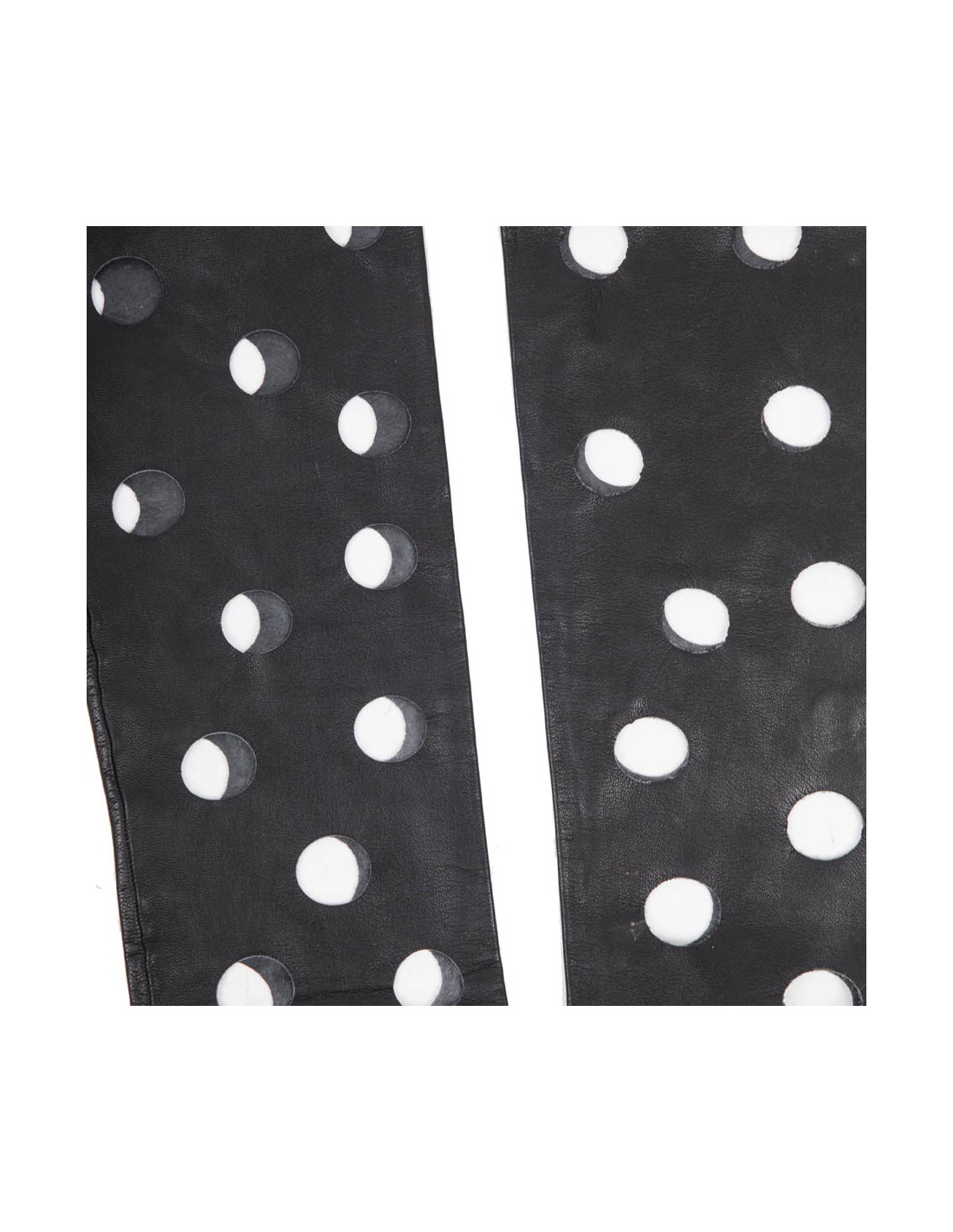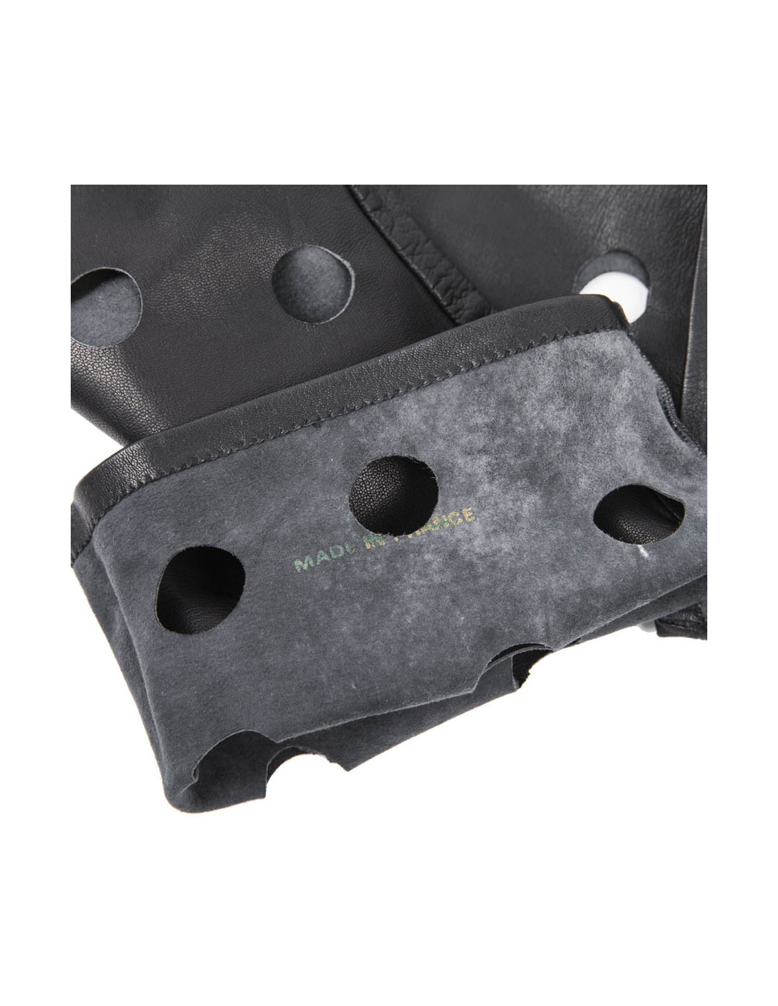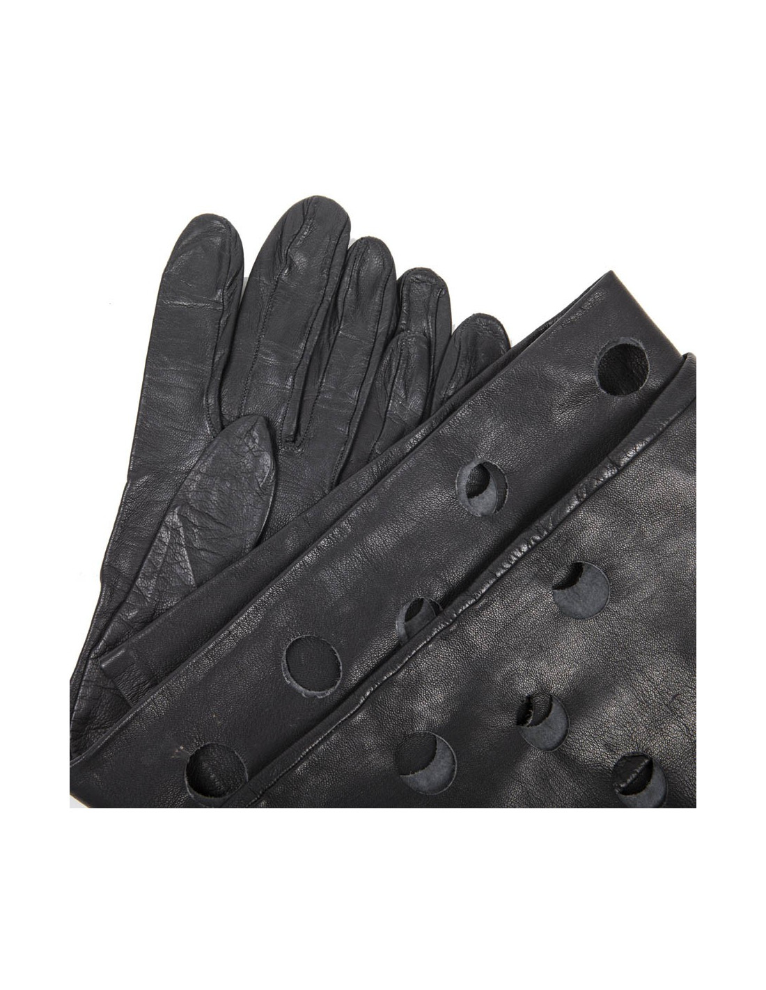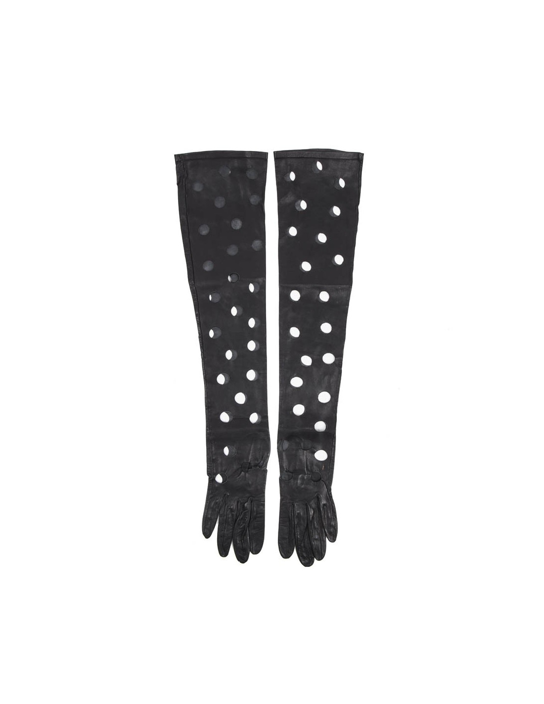 Gants Chanel en cuir d'agneau lisse noir. Ils sont perforés avec des ouvertures rondes régulières. Absence d'indication de taille. Gants de cocktail.