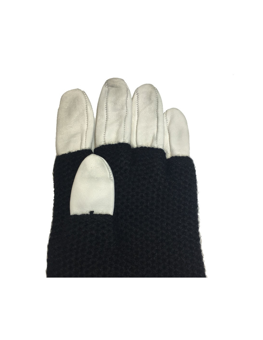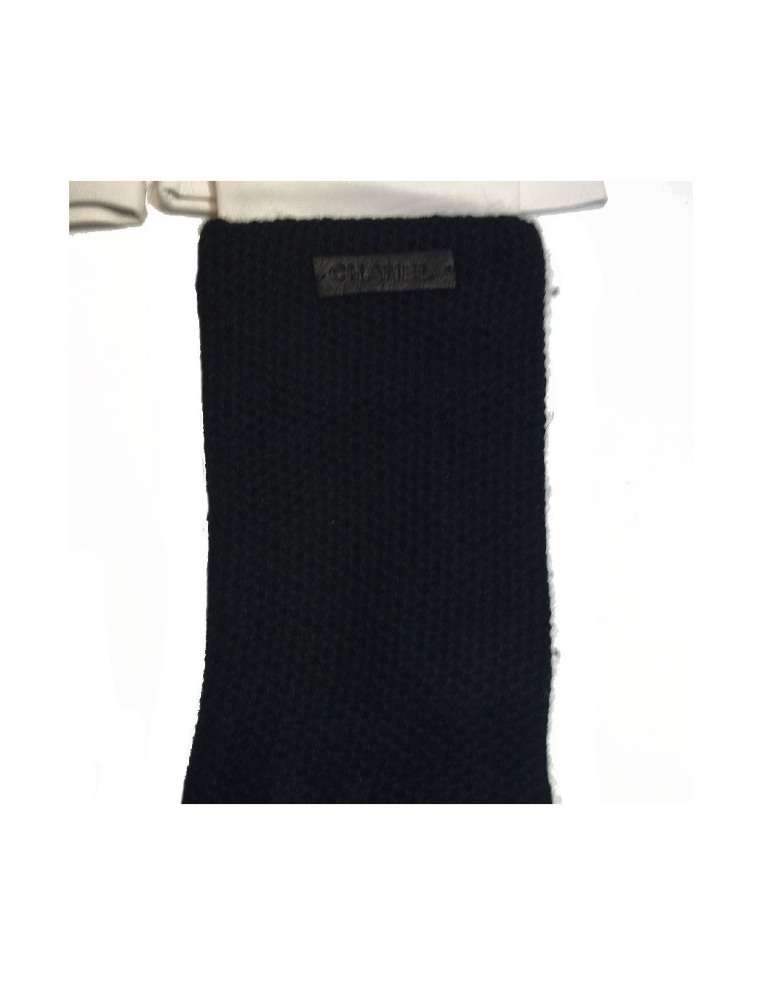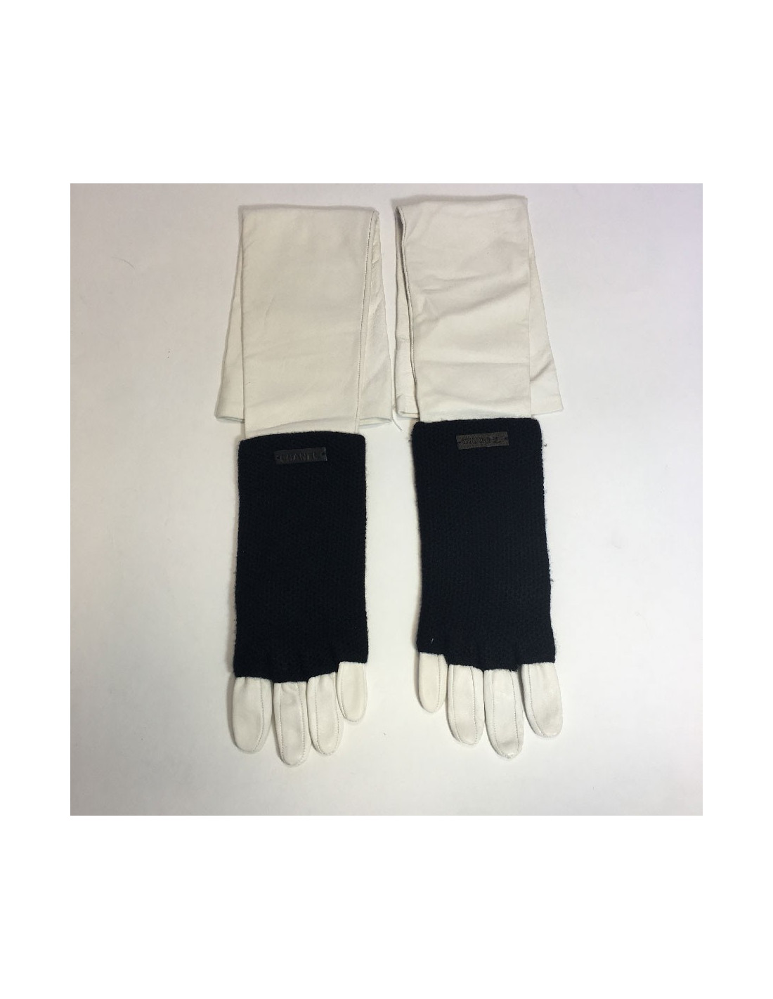 Superbes longs gants Chanel en cuir blanc et cachemire noir. Petite pièce en cuir noir siglée Chanel est cousue sur le cachemire. Doublure en soie beige.