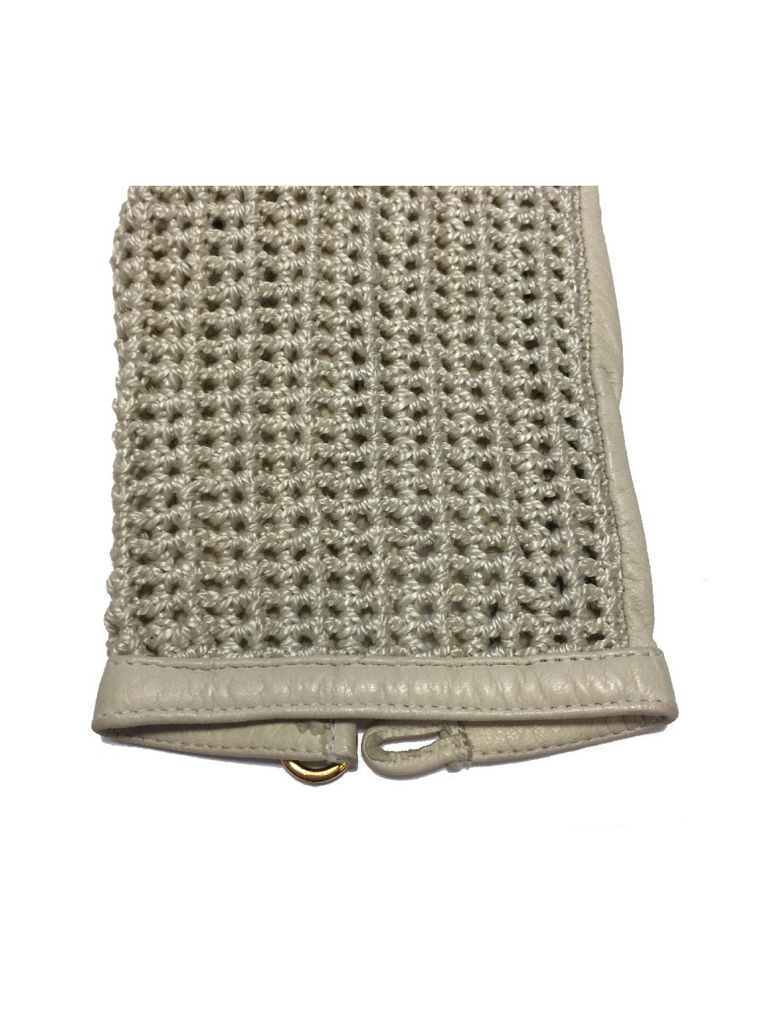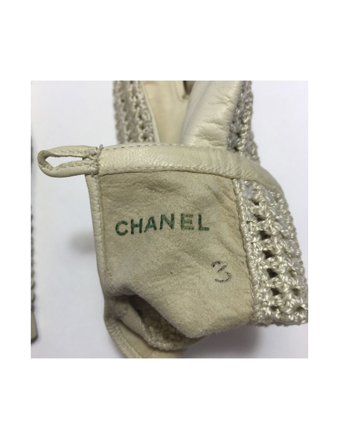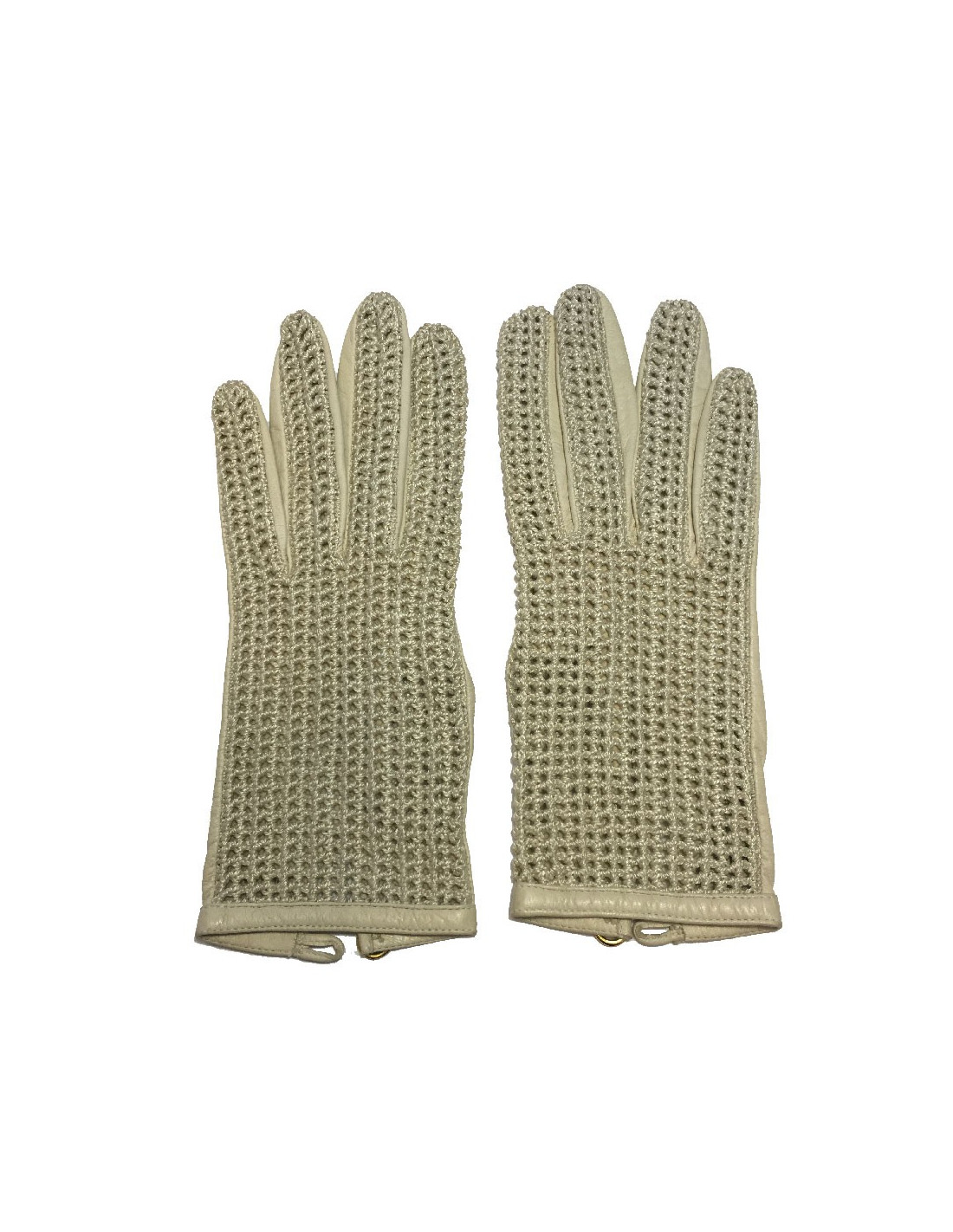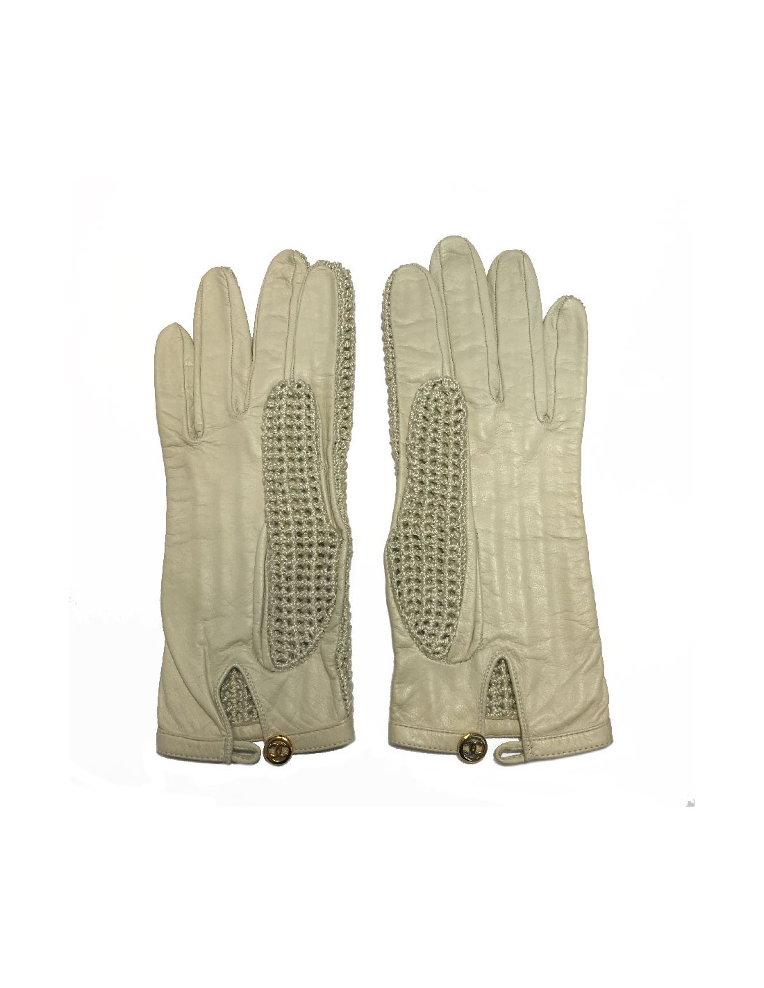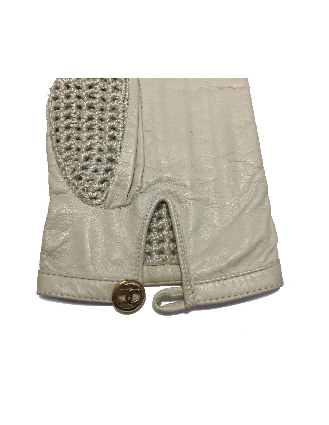 Gants Chanel en cuir chevreau et crochet beige. Petit bouton rond en métal doré siglé Chanel.