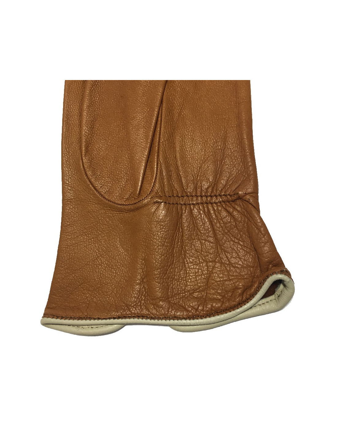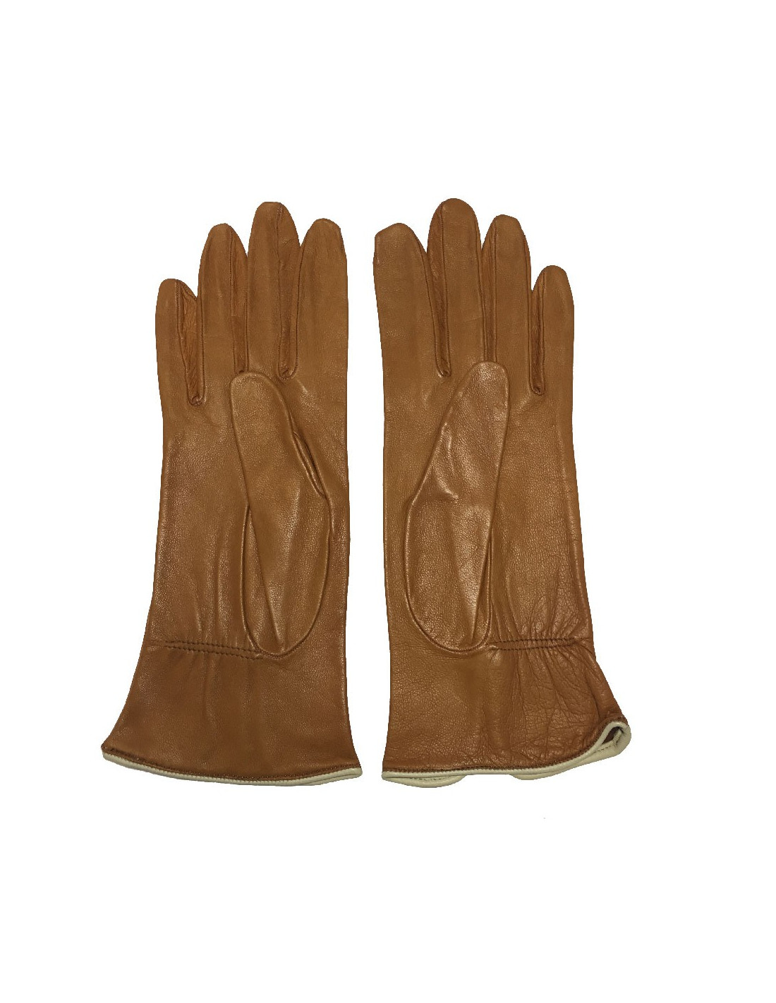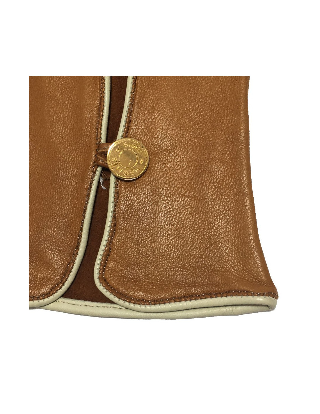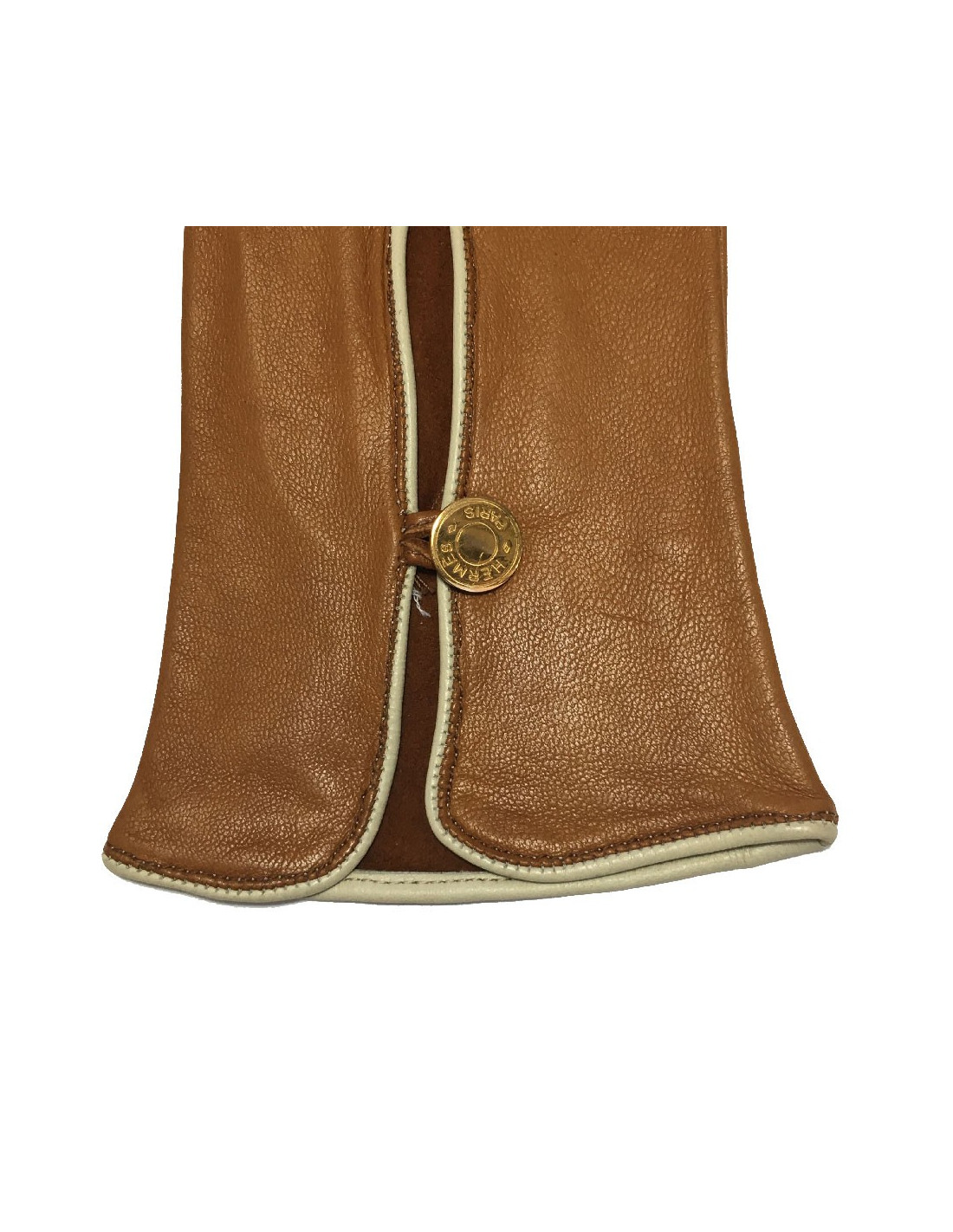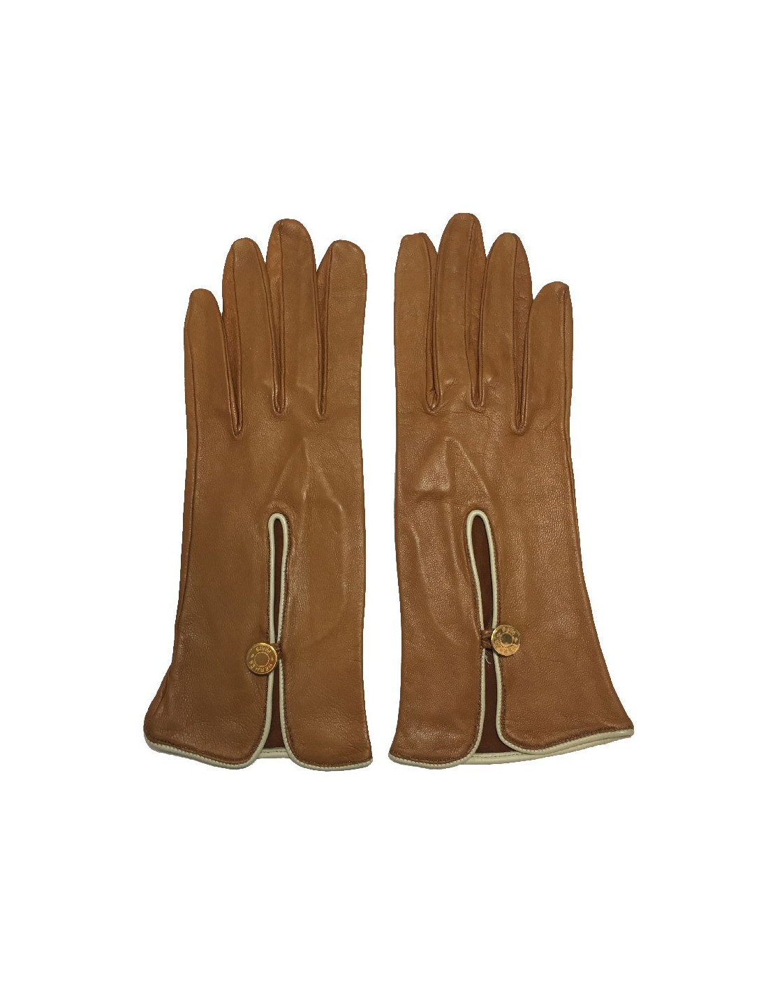 Gants Hermès en cuir d'agneau de couleur caramel, bordure en cuir crème. Taille 7,5. Made in France.
