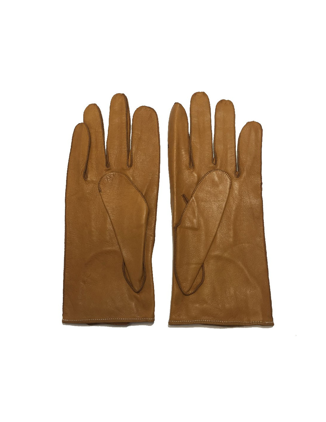 En bon état. De petites tâches de stylo sur le cuir (voir photos). Intérieur en suède caramel. Les gants se ferment au niveau des poignets par un bouton pression doré.