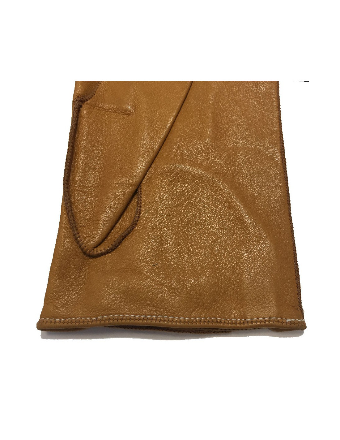 Belles surpiqûres de couleur caramel sur le cuir blanc.