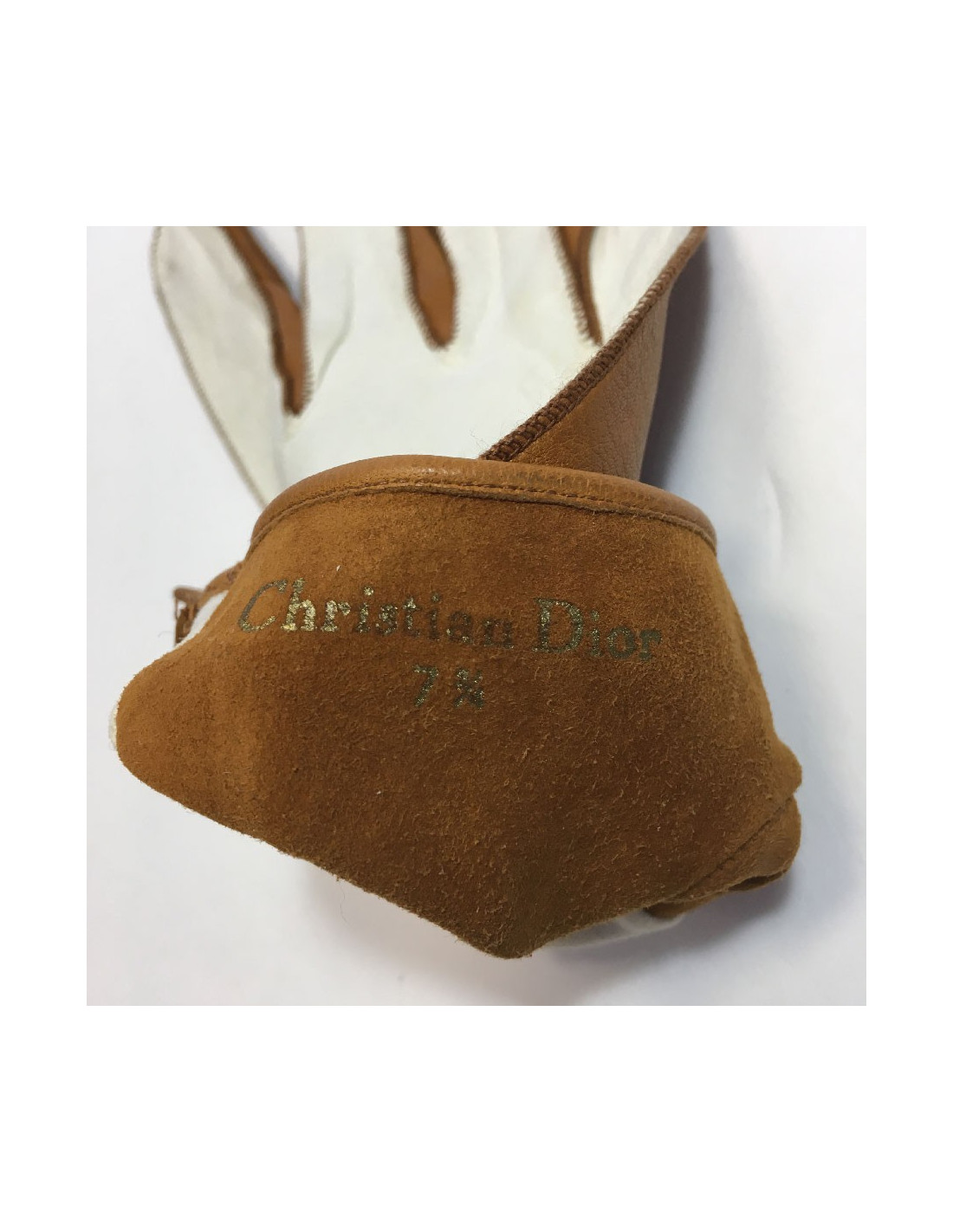 Gants Christian Dior en cuir d'agneau bicolore blanc et caramel. Taille 7 3/4.