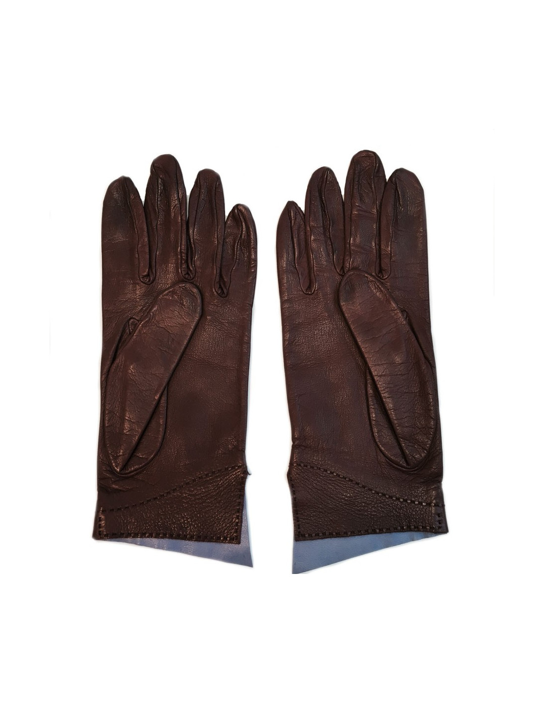 Belle paire de gants HERMES en cuir d'agneau bordeaux. Revers en cuir mauve clair et foncé au niveau du poignet.