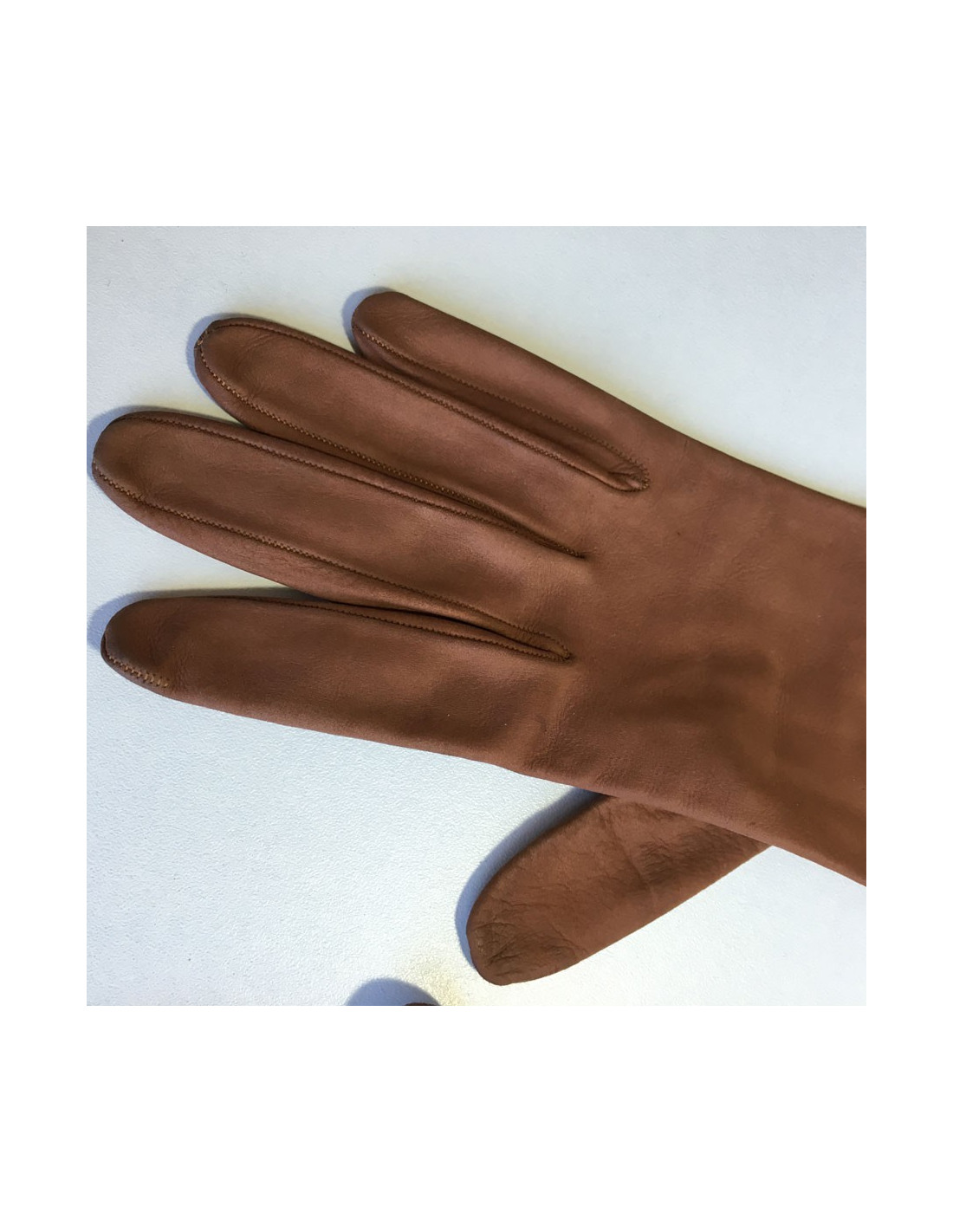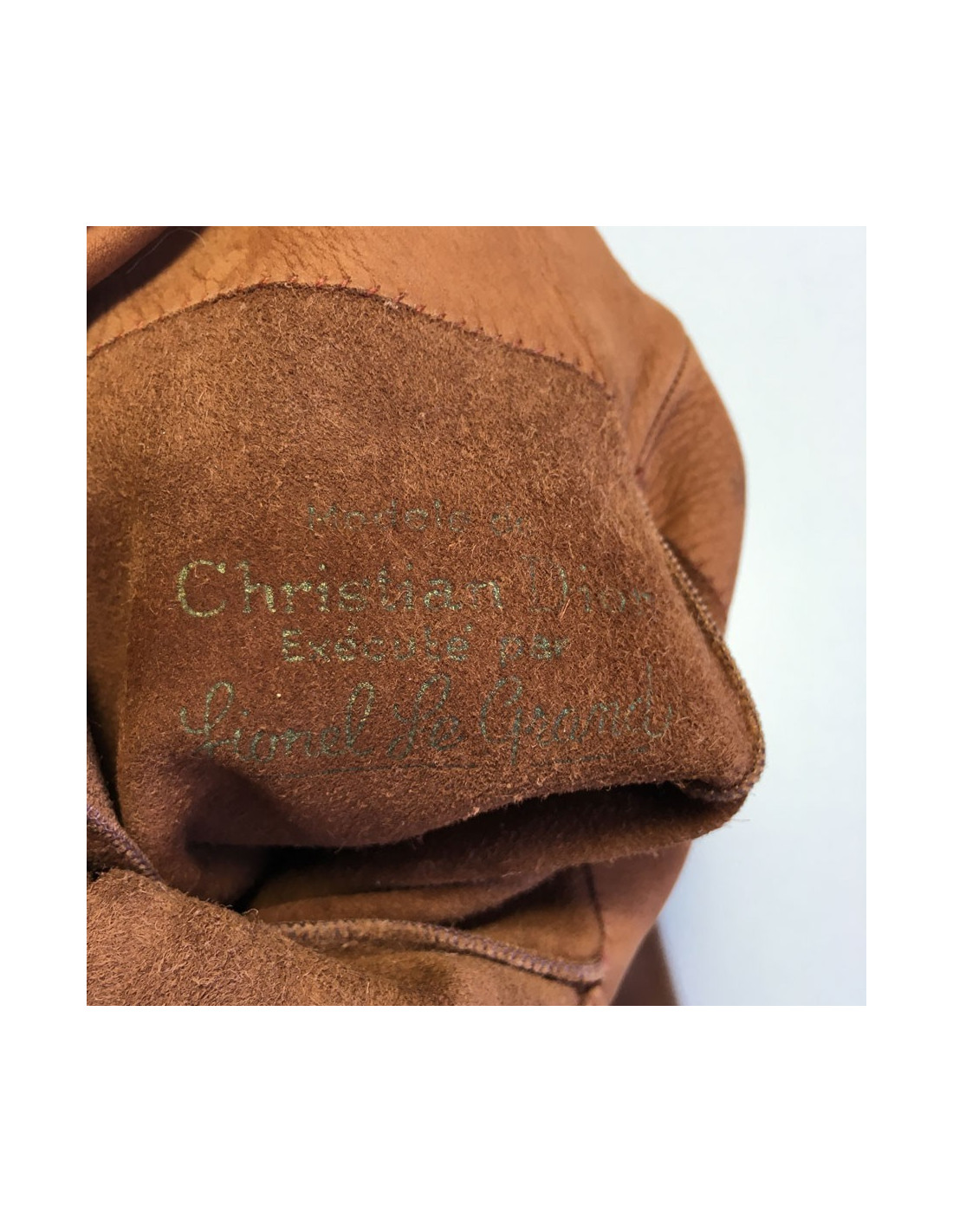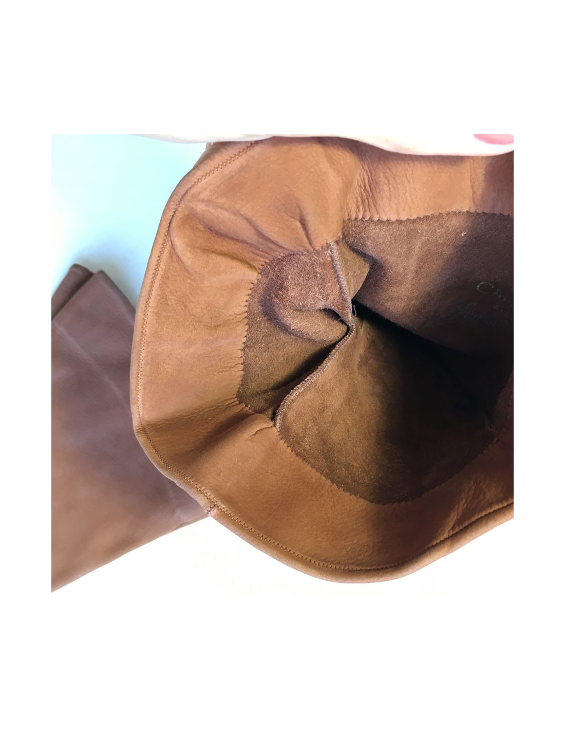 Paire de gants CHRISTIAN DIOR en cuir marron exécuté par "Lionel Le Grand". Pièce vintage. Quelques petites traces sur les deux gants. Les doigts sont un peu patinés. Initiales RB inscrites au stylo à l'intérieur. Monte